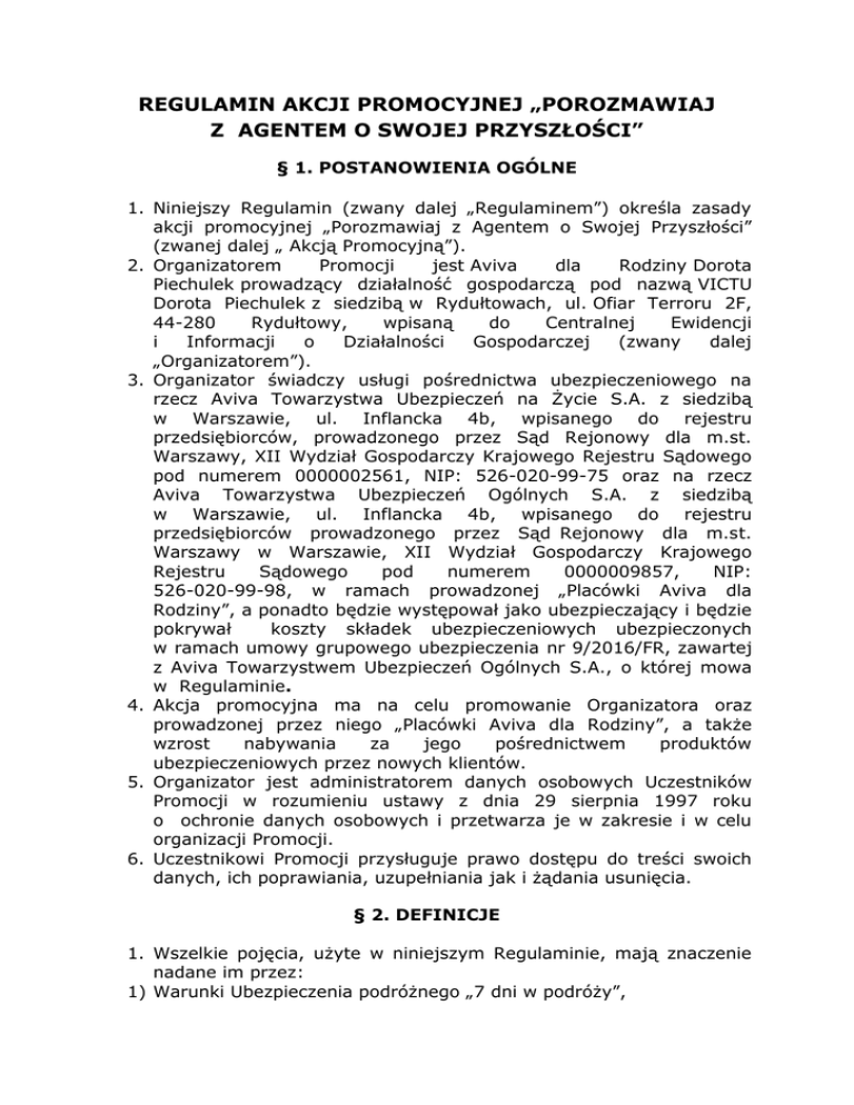 REGULAMIN AKCJI PROMOCYJNEJ „POROZMAWIAJ Z AGENTEM O SWOJEJ PRZYSZŁOŚCI” § 1. POSTANOWIENIA OGÓLNE 1. Niniejszy Regulamin (zwany dalej „Regulaminem”) określa zasady akcji promocyjnej „Porozmawiaj z Agentem o Swojej Przyszłości” (zwanej dalej „ Akcją Promocyjną”). 2. Organizatorem Promocji jest Aviva dla Rodziny Dorota Piechulek prowadzący działalność gospodarczą pod nazwą VICTU Dorota Piechulek z siedzibą w Rydułtowach, ul. Ofiar Terroru 2F, 44-280 Rydułtowy, wpisaną do Centralnej Ewidencji i Informacji o Działalności Gospodarczej (zwany dalej „Organizatorem”). 3. Organizator świadczy usługi pośrednictwa ubezpieczeniowego na rzecz Aviva Towarzystwa Ubezpieczeń na Życie S.A. z siedzibą w Warszawie, ul. Inflancka 4b, wpisanego do rejestru przedsiębiorców, prowadzonego przez Sąd Rejonowy dla m.st. Warszawy, XII Wydział Gospodarczy Krajowego Rejestru Sądowego pod numerem 0000002561, NIP: 526-020-99-75 oraz na rzecz Aviva Towarzystwa Ubezpieczeń Ogólnych S.A. z siedzibą w Warszawie, ul. Inflancka 4b, wpisanego do rejestru przedsiębiorców prowadzonego przez Sąd Rejonowy dla m.st. Warszawy w Warszawie, XII Wydział Gospodarczy Krajowego Rejestru Sądowego pod numerem 0000009857, NIP: 526-020-99-98, w ramach prowadzonej „Placówki Aviva dla Rodziny”, a ponadto będzie występował jako ubezpieczający i będzie pokrywał koszty składek ubezpieczeniowych ubezpieczonych w ramach umowy grupowego ubezpieczenia nr 9/2016/FR, zawartej z Aviva Towarzystwem Ubezpieczeń Ogólnych S.A., o której mowa w Regulaminie. 4. Akcja promocyjna ma na celu promowanie Organizatora oraz prowadzonej przez niego „Placówki Aviva dla Rodziny”, a także wzrost nabywania za jego pośrednictwem produktów ubezpieczeniowych przez nowych klientów. 5. Organizator jest administratorem danych osobowych Uczestników Promocji w rozumieniu ustawy z dnia 29 sierpnia 1997 roku o ochronie danych osobowych i przetwarza je w zakresie i w celu organizacji Promocji. 6. Uczestnikowi Promocji przysługuje prawo dostępu do treści swoich danych, ich poprawiania, uzupełniania jak i żądania usunięcia. § 2. DEFINICJE 1. Wszelkie pojęcia, użyte w niniejszym Regulaminie, mają znaczenie nadane im przez: 1) Warunki Ubezpieczenia podróżnego „7 dni w podróży”, 2) Warunki Ubezpieczenia odpowiedzialności cywilnej w życiu prywatnym, 3) Warunki Ubezpieczenia następstw nieszczęśliwych wypadków, 4) Warunki Ubezpieczenia elementów stałych i ruchomości domowych od kradzieży z włamaniem lub rozboju. 2. Aktywacja ubezpieczenia – Aktywacja ubezpieczenia – składane przez Ubezpieczonego, za pośrednictwem poczty elektronicznej na wskazany w certyfikacie adres e-mail Ubezpieczyciela, oświadczenie w przedmiocie rozpoczęcia ochrony ubezpieczeniowej wraz z określeniem daty jej rozpoczęcia z zastrzeżeniem, że wnioskowana data przypada na minimum jeden dzień roboczy w przód od daty przesłania oświadczenia; 3. Agent – przedsiębiorca (osoba fizyczna lub spółka) wykonujący działalność agencyjną na podstawie umowy agencyjnej zawartej z Aviva Towarzystwo Ubezpieczeń na Życie S.A. lub Aviva Towarzystwo Ubezpieczeń Ogólnych S.A. i wpisany do rejestru agentów ubezpieczeniowych; 4. Ubezpieczyciel – Aviva Towarzystwo Ubezpieczeń Ogólnych S.A. z siedzibą w Warszawie (00-189), przy ul. Inflanckiej 4b; 5. Ubezpieczający – Organizator; 6. Umowa ubezpieczenia – Umowa Ubezpieczenia Grupowego nr 9/2016/FR, zawarta pomiędzy Ubezpieczającym a Ubezpieczycielem, regulująca warunki udzielania ochrony ubezpieczeniowej na rzecz Ubezpieczonych; 7. Ubezpieczony – Uczestnik Promocji, który złożył oświadczenie woli na druku Deklaracji Ubezpieczenia w przedmiocie wyrażenia zgody na objęcie ochroną ubezpieczeniową w zakresie i zgodnie z zasadami określonymi w Warunkach ubezpieczenia oraz w poszczególnych Klauzulach załączonych do Warunków ubezpieczenia. § 3. OKRES TRWANIA PROMOCJI 1. Promocja obowiązuje od dnia 01 stycznia 2017 roku do dnia 31 grudnia 2017 roku (obie daty włącznie) lub do wyczerpania Certyfikatów z unikalnym numerem aktywacji, przy czym Organizator zastrzega możliwość przedłużenia okresu obowiązywania Promocji lub zwiększenia liczby Certyfikatów z unikalnym numerem aktywacji. 2. W przypadku przedłużenia okresu obowiązywania Promocji lub zwiększenia liczby Certyfikatów z unikalnym numerem aktywacji, o czym mowa w ust. 1, Organizator zamieści stosowną informację na stronie internetowej www.dlarodziny.aviva.pl/jakubzalewski. § 4. OSOBY MOGĄCE WZIĄĆ UDZIAŁ W PROMOCJI 1. Z zastrzeżeniem ust. 2 Promocja skierowana jest do wszystkich osób fizycznych, które w okresie trwania Promocji, spełniają łącznie następujące warunki („Uczestnicy”): 1) mają ukończone 18 lat, 2) złożą oświadczenie woli na druku Deklaracji przystąpienia w przedmiocie wyrażenia zgody na objęcie ochroną ubezpieczeniową za pośrednictwem Doradców współpracujących w ramach „Placówki Aviva dla Rodziny”, 3) odbiorą Certyfikat z unikalnym numerem aktywacji, 4) dokonają aktywacji ubezpieczenia, zgodnie z terminem określonym w Warunkach ubezpieczenia. 2. Z udziału w Promocji są wykluczeni pracownicy Organizatora oraz członkowie ich rodzin, osoby pozostające z Organizatorem w stosunku cywilnoprawnym (w tym umowy zlecenia, umowy o dzieło, kontrakty menedżerskie, umowy o świadczenie usług), a także osoby biorące udział w organizacji Promocji. § 5. UMOWY UBEZPIECZENIA DOSTĘPNE W RAMACH PROMOCJI 1. Uczestnik Promocji ma prawo – poprzez przystąpienie do Umowy ubezpieczenia - do skorzystania z ochrony ubezpieczeniowej w następujących zakresie: 1) Ubezpieczenie podróżne „7 dni w podróży”, 2) Ubezpieczenie odpowiedzialności cywilnej w życiu prywatnym, 3) Ubezpieczenie następstw nieszczęśliwych wypadków, 4) Ubezpieczenie elementów stałych i ruchomości domowych od kradzieży z włamaniem lu