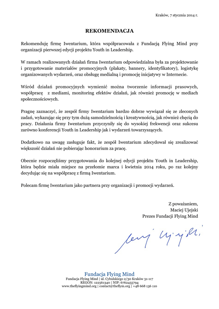 Kraków, 7 stycznia 2014 r. ! ! REKOMENDACJA Rekomenduję firmę Iwentarium, która współpracowała z Fundacją Flying Mind przy organizacji pierwszej edycji projektu Youth in Leadership. ! W ramach realizowanych działań firma Iwentarium odpowiedzialna była za projektowanie i przygotowanie materiałów promocyjnych (plakaty, bannery, identyfikatory), logistykę organizowanych wydarzeń, oraz obsługę medialną i promocję inicjatywy w Internecie. ! Wśród działań promocyjnych wymienić można tworzenie informacji prasowych, współpracę z mediami, monitoring efektów działań, jak również promocję w mediach społecznościowych. ! Pragnę zaznaczyć, że zespół firmy Iwentarium bardzo dobrze wywiązał się ze zleconych zadań, wykazując się przy tym dużą samodzielnością i kreatywnością, jak również chęcią do pracy. Działania firmy Iwentarium przyczyniły się do wysokiej frekwencji oraz sukcesu zarówno konferencji Youth in Leadership jak i wydarzeń towarzyszących. ! Dodatkowo na uwagę zasługuje fakt, że zespół Iwentarium zdecydował się zrealizować większość działań nie pobierając honorarium za pracę. ! Obecnie rozpoczęliśmy przygotowania do kolejnej edycji projektu Youth in Leadership, która będzie miała miejsce na przełomie marca i kwietnia 2014 roku, po raz kolejny decydując się na współpracę z firmą Iwentarium. ! Polecam firmę Iwentarium jako partnera przy organizacji i promocji wydarzeń. ! ! ! ! Fundacja Flying Mind Z poważaniem, Maciej Ujejski Prezes Fundacji Flying Mind Fundacja Flying Mind | ul. Cybulskiego 2/30 Kraków 31-117 REGON: 122561340 | NIP: 6762455794 www.theflyingmind.org | [email protected] | +48 668 136 110