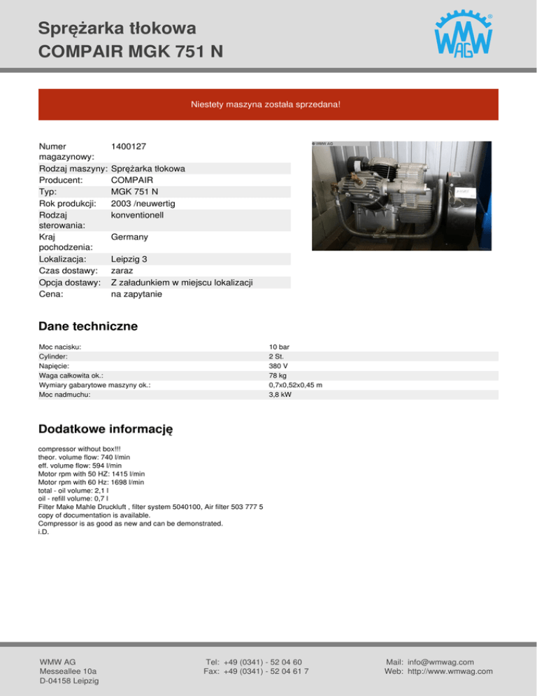 Sprężarka tłokowa COMPAIR MGK 751 N Niestety maszyna została sprzedana! Numer magazynowy: Rodzaj maszyny: Producent: Typ: Rok produkcji: Rodzaj sterowania: Kraj pochodzenia: Lokalizacja: Czas dostawy: Opcja dostawy: Cena: 1400127 Sprężarka tłokowa COMPAIR MGK 751 N 2003 /neuwertig konventionell Germany Leipzig 3 zaraz Z załadunkiem w miejscu lokalizacji na zapytanie Dane techniczne Moc nacisku: Cylinder: Napięcie: Waga całkowita ok.: Wymiary gabarytowe maszyny ok.: Moc nadmuchu: 10 bar 2 St. 380 V 78 kg 0,7x0,52x0,45 m 3,8 kW Dodatkowe informację compressor without box!!! theor. volume flow: 740 l/min eff. volume flow: 594 l/min Motor rpm with 50 HZ: 1415 l/min Motor rpm with 60 Hz: 1698 l/min total - oil volume: 2,1 l oil - refill volume: 0,7 l Filter Make Mahle Druckluft , filter system 5040100, Air filter 503 777 5 copy of documentation is available. Compressor is as good as new and can be demonstrated. i.D. WMW AG Messeallee 10a D-04158 Leipzig Powered by TCPDF (www.tcpdf.org) Tel: +49 (0341) - 52 04 60 Fax: +49 (0341) - 52 04 61 7 Mail: [email protected] Web: http://www.wmwag.com