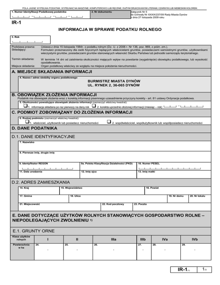 POLA JASNE WYPEŁNIA PODATNIK. WYPEŁNIAĆ NA MASZYNIE, KOMPUTEROWO LUB RĘCZNIE, DUŻYMI DRUKOWANYMI LITERAMI, CZARNYM LUB NIEBIESKIM KOLOREM. 1. Numer Identyfikacji Podatkowej podatnika 2. Nr dokumentu Załącznik Nr 5 do Uchwały Nr XXXIX/237/09 Rady Miasta Dynów z dnia 27 listopada 2009 roku └──┴──┴──┘ ¯└──┴──┴──┘ ¯└──┴──┘ ¯ └──┴──┘ IR-1 INFORMACJA W SPRAWIE PODATKU ROLNEGO 3. Rok └───┴───┴───┴───┘ Podstawa prawna: Składający: Ustawa z dnia 15 listopada 1984r. o podatku rolnym (Dz. U. z 2006 r. Nr 136, poz. 969, z późn. zm.). Formularz przeznaczony dla osób fizycznych będących właścicielami gruntów, posiadaczami samoistnymi gruntów, użytkownikami wieczystymi gruntów, posiadaczami gruntów stanowiących własność Skarbu Państwa lub jednostki samorządu terytorialnego. Termin składania: W terminie 14 dni od zaistnienia okoliczności mających wpływ na powstanie (wygaśnięcie) obowiązku podatkowego, lub wysokość opodatkowania.. Organ podatkowy właściwy ze względu na miejsce położenia nieruchomości. Miejsce składania: A. MIEJSCE SKŁADANIA INFORMACJI 4. Nazwa i adres siedziby organu podatkowego BURMISTRZ MIASTA DYNÓW UL. RYNEK 2, 36-065 DYNÓW B. OBOWIĄZEK ZŁOŻENIA INFORMACJI Podatnik ma obowiązek złożenia wraz z korektą informacji pisemnego uzasadnienie przyczyny korekty - art. 81 ustawy Ordynacja podatkowa. 5. Okoliczności powodujące obowiązek złożenia informacji (zaznaczyć właściwy kwadrat): q1. informacja składana po raz pierwszy na dany rok q 2. korekta uprzednio złożonej informacji (miesiąc – rok) └──┴──┘ ¯└─┴──┴──┴──┘ C. PODMIOT ZOBOWIĄZANY DO ZŁOŻENIA INFORMACJI 6. Rodzaj podmiotu (zaznaczyć właściwy kwadrat): q1. właściciel, użytkownik lub posiadacz nieruchomości q 2. współwłaściciel, współużytkownik lub współposiadacz nieruchomości D. DANE PODATNIKA D.1. DANE IDENTYFIKACYJNE 7. Nazwisko 8. Pierwsze imię, drugie imię 9. Identyfikator REGON 9a. Polska Klasyfikacja Działalności (PKD) 10. Numer PESEL └──┴──┴──┴──┴──┴──┴──┴──┴──┘ 11. Data urodzenia 12. Imię ojca └──┴──┴──┴──┴──┴──┴──┴──┴──┴──┴──┘ 13. Imię matki D.2. ADRES ZAMIESZKANIA 14. Kraj 15. Województwo 17. Gmina 16. Powiat 18. Ulica 19. Nr domu 21. Miejscowość 22. Kod pocztowy 20. Nr lokalu 23. Poczta E. DANE DOTYCZĄCE UŻYTKÓW ROLNYCH STANOWIĄCYCH GOSPODARSTWO ROLNE – NIEPODLEGAJĄCYCH ZWOLNIENIU 1) E.1. GRUNTY ORNE Klasa użytków rolnych Powierzchnia w ha I 24. II 25. , IIIa 26. , IIIb 27. , IVa 28. , IVb 29. , , IR-1 (1) 1/3 POLA JASNE WYPEŁNIA PODATNIK. WYPEŁNIAĆ NA MASZYNIE, KOMPUTEROWO LUB RĘCZNIE, DUŻYMI DRUKOWANYMI LITERAMI, CZARNYM LUB NIEBIESKIM KOLOREM. E.2. ŁĄKI I PASTWISKA Klasa użytków rolnych Powierzchnia w ha I II 30. III 31. IV 32. , 33. , , , E.3. SADY Klasa użytków rolnych Powierzchnia w ha I II 34. III, IIIa, 35. IIIb 36. , IV, IVa, 37. , , IVb 38. , 39. , , IVa IVb E.4. GRUNTY POD STAWAMI NIEZARYBIONYMI – grunty orne Klasa użytków rolnych Powierzchnia w ha I II 40. IIIa 41. IIIb 42. , 43. , , 44. , 45. , , E.5. GRUNTY POD STAWAMI NIEZARYBIONYMI – łąki i pastwiska Klasa użytków rolnych Powierzchnia w ha I II 46. III 47. IV 48. , 49. , , , E.6. GRUNTY ROLNE ZABUDOWANE - grunty orne Klasa użytków rolnych Powierzchnia w ha I II 50. IIIa 51. IIIb 52. , IVa 53. , , IVb 54. , 55. , , E.7. GRUNTY ROLNE ZABUDOWANE – łąki i pastwiska Klasa użytków rolnych Powierzchnia w ha I II 56. III 57. IV 58. , 59. , , , E.8. ROWY - grunty orne Klasa użytków rolnych Powierzchnia w ha I II 60. IIIa 61. , IIIb 62. IVa 63. , , IVb 64. , 65. , , E.9. ROWY - łąki i pastwiska Klasa użytków rolnych Powierzchnia w ha I II 66. III 67. , IV 68. , 69. , , E.10. UŻYTKI ROLNE (ROWY, GRUNTY POD STAWAMI NIEZARYBIONYMI) BEZ OZNACZENIA KLASY GLEBOZNAWCZEJ 70. Powierzchnia w ha , E.11. GRUNTY POD STAWAMI ZARYBIONYMI - łososiem, trocią, głowacicą, palią i pstrągiem Powierzchnia w ha 71. , E.12. GRUNTY POD STAWAMI ZARYBIONYMI - inne gatunki ryb Powierzchnia w ha 72. , IR-1 (1) 2/3 F. DANE DOTYCZĄCE UŻYTKÓW ROLNYCH NIESTANOWIĄCYCH GOSPODARSTWA ROLNEGO – NIEPODLEGAJĄCYCH ZWOLNIENIU 1) Powierzchnia w ha 73. , G. INFORMACJA O ZAŁĄCZNIKACH (do niniejszej informacji dołączono) 74. Liczba załączników ZR-1/A 75. Załącznik ZR-1/B składany (zaznaczyć właściwy kwadrat): └──┴──┘ q tak q nie H. OŚWIADCZENIE I PODPIS PODATNIKA / OSOBY REPREZENTUJĄCEJ PODATNIKA Oświadczam, że są mi znane przepisy Kodeksu karnego skarbowego o odpowiedzialności za podanie danych niezgodnych z rzeczywistością. 76. Imię 77. Nazwisko 78. Data wypełnienia informacji (dzień - miesiąc - rok) 79. Podpis (pieczęć) podatnika / osoby reprezentującej podatnika 2) └──┴──┘¯└──┴──┘¯└──┴──┴──┴──┘ I. ADNOTACJE ORGANU PODATKOWEGO 80. Uwagi organu podatkowego 81. Data (dzień - miesiąc - rok) 82. Podpis przyjmującego formularz └──┴──┘¯└──┴──┘¯└──┴──┴──┴──┘ 1) Należy podać z dokładnością do czterech miejsc po przecinku. Powierzchnię należy podać z dokładnością do 1 m 2 2) Niepotrzebne skreślić. IR-1 (1) 3/3