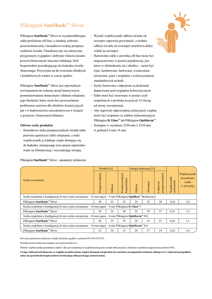 Pilkington SunShade™ Silver Pilkington SunShade™ Silver to wysokorefleksyjne l W ysoki współczynnik odbicia światła od szkło powlekane off-line, o średniej ochronie zewnątrz zapewnia prywatność, a średnie przeciwsłonecznej i stosunkowo niskiej przepusz- odbicie światła od wewnątrz umożliwia dobry czalności światła. Charakteryzuje się estetycznie przyjemnym wyglądem i dobrymi właściwościami widok na zewnątrz. l H artowalne szkło z powłoką off-line może być przeciwsłonecznymi znacznie redukując ilość magazynowane w postaci pojedynczej; jest bezpośrednio przenikającego do budynku światła łatwe w obchodzeniu się i obróbce – może być słonecznego. Przyczynia się do tworzenia chłodnych cięte, laminowane, hartowane, wzmacniane i komfortowych wnętrz w czasie upałów. termicznie, gięte i zespalane z wykorzystaniem standardowych technik. Pilkington SunShade Silver jest optymalnym ™ l rozwiązaniem do ochrony przed intensywnym promieniowaniem słonecznym i efektem oślepiania dopasowane pod względem kolorystycznym. l S zkło musi być stosowane w postaci szyb zespolonych z powłoką na pozycji #2 (licząc jego blaskiem, który może być powszechnym od strony zewnętrznej). problemem zarówno dla obiektów komercyjnych jak i w budownictwie mieszkaniowym w krajach S zyby hartowane i odprężone są doskonale l A by zapewnić odpowiednią izolacyjność cieplną może być zespalane ze szkłem niskoemisyjnym o gorącym i słonecznym klimacie. Pilkington K Glass™ lub Pilkington Optitherm™. Główne cechy produktu l S tosunkowo niska przepuszczalność światła szkła l D ostępne w wymiarze 2250 mm x 3210 mm w grubości 6 mm i 8 mm. pozwala ograniczyć efekt oślepiania, a niski współczynnik g redukuje ciepło dostające się do budynku, zmniejszając tym samym zapotrzebowanie na klimatyzację i oszczędzając energię. Pilkington SunShade™ Silver – parametry techniczne Energia słoneczna [%] Całkowita przepuszczalność Współczynnik zacienienia Współczynnik przenikania ciepła U [W/m²K] 52 30 0,34 2,4 55 27 0,31 1,5 23 0,26 1,1 19 0,22 1,0 Absorpcja Odbicie Przepuszczalność bezpośrednia Odbicie Szyba zewnętrzna Przepuszczalność Światło [%] Szyba zespolona o konfiguracji (6 mm szyba zewnętrzna – 16 mm argon – 4 mm Pilkington Optifloat™ Bezbarwny) Pilkington SunShade™ Silver 28 33 23 25 Szyba zespolona o konfiguracji (6 mm szyba zewnętrzna – 16 mm argon – 4 mm Pilkington K Glass ) ™ Pilkington SunShade™ Silver 26 34 20 25 Szyba zespolona o konfiguracji (6 mm szyba zewnętrzna – 16 mm argon – 4 mm Pilkington Optitherm™ S3) Pilkington SunShade™ Silver 28 33 19 26 55 Szyba zespolona o konfiguracji (6 mm szyba zewnętrzna – 16 mm argon – 4 mm Pilkington Optitherm™ S1) Pilkington SunShade™ Silver 25 34 15 28 57 Powyższe parametry techniczne zostały określone zgodnie z normami EN 410 i EN 673. Powłoka przeciwsłoneczna znajduje się na powierzchni nr 2. Wartość współczynnika przenikania ciepła U dla szyb zespolonych wypełnionych gazem została obliczona przy założeniu wypełnienia argonem na poziomie 90%. Uwaga: Szkło przeciwsłoneczne ze względu na podwyższony stopień absorpcji energii może być narażone na naprężenia termiczne, dlatego też w większości przypadków zaleca się sprawdzenie bezpieczeństwa termicznego szkła przed jego zastosowaniem. Sierpień 2011 Niniejsza publikacja stanowi jedynie ogólny opis produktów. Dalsze, bardziej szczegółowe informacje można uzyskać u lokalnego dostawcy produktów budowlanych marki Pilkington. Do obowiązków użytkownika należy sprawdzenie, czy zastosowanie produktu odpowiada konkretnemu przeznaczeniu oraz czy sposób jego użytkowania spełnia wszystkie stosowne przepisy prawa, normy, zasady postępowania i inne wymogi. W najszerszym zakresie dozwolonym przez obowiązujące prawo spółka Nippon Sheet Glass Co. Ltd. oraz jej spółki zależne zrzekają się wszelkiej odpowiedzialności za błędy lub pominięcia w niniejszej publikacji oraz za wszelkie konsekwencje wynikające z polegania na niej. Znakowanie CE potwierdza, że produkt jest zgodny z odpowiednią zharmonizowaną normą europejską. Etykietę towarzyszącą znakowaniu CE dla każdego produktu, obejmującą deklarowane wartości, można znaleźć na stronie internetowej www.pilkington.com/CE. Pilkington Polska Sp. z o.o. ul. Portowa 24, 27-600 Sandomierz, tel. 15 832 30 41, fax: 15 832 39 25 Pilkington Polska – Biuro Doradztwa Technicznego ul. Wołoska 18, 02-675 Warszawa, tel.: 22 548 75 07, fax: 22 548 75 22 www.pilkington.pl