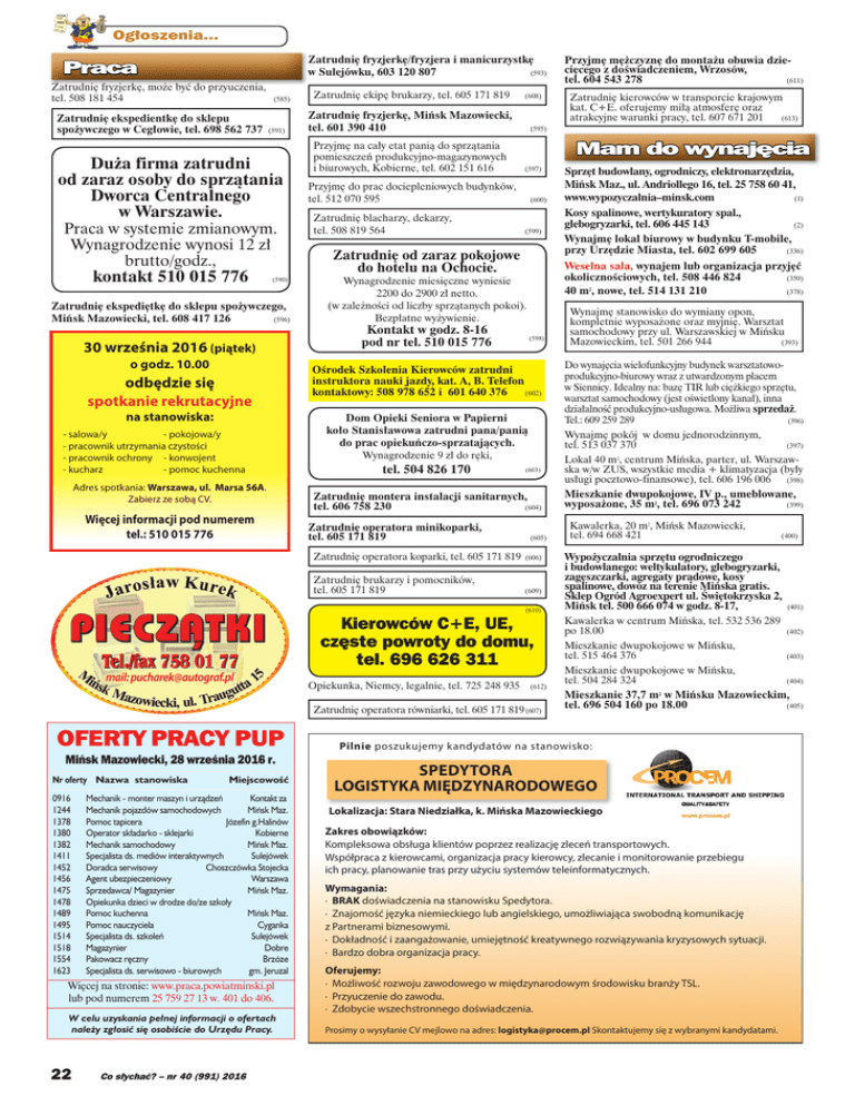 Ogłoszenia... Zatrudnię fryzjerkę/fryzjera i manicurzystkę w Sulejówku, 603 120 807 (593) Praca Zatrudnię fryzjerkę, może być do przyuczenia, tel. 508 181 454 (585) Zatrudnię ekspedientkę do sklepu spożywczego w Cegłowie, tel. 698 562 737 (591) Duża firma zatrudni od zaraz osoby do sprzątania Dworca Centralnego w Warszawie. Praca w systemie zmianowym. Wynagrodzenie wynosi 12 zł brutto/godz., (590) kontakt 510 015 776 Zatrudnię ekspediętkę do sklepu spożywczego, (596) Mińsk Mazowiecki, tel. 608 417 126 30 września 2016 (piątek) o godz. 10.00 odbędzie się spotkanie rekrutacyjne na stanowiska: - salowa/y - pokojowa/y - pracownik utrzymania czystości - pracownik ochrony - konwojent - kucharz - pomoc kuchenna Adres spotkania: Warszawa, ul. Marsa 56A. Zabierz ze sobą CV. Więcej informacji pod numerem tel.: 510 015 776 Zatrudnię ekipę brukarzy, tel. 605 171 819 (608) Zatrudnię fryzjerkę, Mińsk Mazowiecki, tel. 601 390 410 Przyjmę na cały etat panią do sprzątania pomieszczeń produkcyjno-magazynowych i biurowych, Kobierne, tel. 602 151 616 Mam do wynajęcia (597) (600) (599) Zatrudnię od zaraz pokojowe do hotelu na Ochocie. Kontakt w godz. 8-16 pod nr tel. 510 015 776 (598) Ośrodek Szkolenia Kierowców zatrudni instruktora nauki jazdy, kat. A, B. Telefon kontaktowy: 508 978 652 i 601 640 376 (602) Dom Opieki Seniora w Papierni koło Stanisławowa zatrudni pana/panią do prac opiekuńczo-sprzatających. Wynagrodzenie 9 zł do ręki, Mechanik - monter maszyn i urządzeń Kontakt za Mechanik pojazdów samochodowych Mińsk Maz. Pomoc tapicera Józefin g.Halinów Operator składarko - sklejarki Kobierne Mechanik samochodowy Mińsk Maz. Specjalista ds. mediów interaktywnych Sulejówek Doradca serwisowy Choszczówka Stojecka Agent ubezpieczeniowy Warszawa Sprzedawca/ Magazynier Mińsk Maz. Opiekunka dzieci w drodze do/ze szkoły Pomoc kuchenna Mińsk Maz. Pomoc nauczyciela Cyganka Specjalista ds. szkoleń Sulejówek Magazynier Dobre Pakowacz ręczny Brzóze Specjalista ds. serwisowo - biurowych gm. Jeruzal Więcej na stronie: www.praca.powiatminski.pl lub pod numerem 25 759 27 13 w. 401 do 406. W celu uzyskania pełnej informacji o ofertach należy zgłosić się osobiście do Urzędu Pracy. 22 Co słychać? – nr 40 (991) 2016 (397) Mieszkanie dwupokojowe, IV p., umeblowane, wyposażone, 35 m2, tel. 696 073 242 (399) Zatrudnię operatora minikoparki, tel. 605 171 819 (605) (609) (612) Zatrudnię operatora równiarki, tel. 605 171 819(607) 0916 1244 1378 1380 1382 1411 1452 1456 1475 1478 1489 1495 1514 1518 1554 1623 Do wynajęcia wielofunkcyjny budynek warsztatowoprodukcyjno-biurowy wraz z utwardzonym placem w Siennicy. Idealny na: bazę TIR lub ciężkiego sprzętu, warsztat samochodowy (jest oświetlony kanał), inna działalność produkcyjno-usługowa. Możliwa sprzedaż. (396) Tel.: 609 259 289 Zatrudnię montera instalacji sanitarnych, tel. 606 758 230 (604) Opiekunka, Niemcy, legalnie, tel. 725 248 935 Miejscowość Wynajmę stanowisko do wymiany opon, kompletnie wyposażone oraz myjnię. Warsztat samochodowy przy ul. Warszawskiej w Mińsku Mazowieckim, tel. 501 266 944 (393) (603) tel. 504 826 170 Kierowców C+E, UE, częste powroty do domu, tel. 696 626 311 Nr oferty Nazwa stanowiska (2) Wynajmę lokal biurowy w budynku T-mobile, (336) przy Urzędzie Miasta, tel. 602 699 605 Wynajmę pokój w domu jednorodzinnym, tel. 513 037 370 (610) Mińsk Mazowiecki, 28 września 2016 r. Kosy spalinowe, wertykuratory spal., glebogryzarki, tel. 606 445 143 Lokal 40 m2, centrum Mińska, parter, ul. Warszawska w/w ZUS, wszystkie media + klimatyzacja (były usługi pocztowo-finansowe), tel. 606 196 006 (398) Zatrudnię brukarzy i pomocników, tel. 605 171 819 OFERTY PRACY PUP Sprzęt budowlany, ogrodniczy, elektronarzędzia, Mińsk Maz., ul. Andriollego 16, tel. 25 758 60 41, www.wypozyczalnia–minsk.com (1) Weselna sala, wynajem lub organizacja przyjęć (350) okolicznościowych, tel. 508 446 824 40 m2, nowe, tel. 514 131 210 (378) Wynagrodzenie miesięczne wyniesie 2200 do 2900 zł netto. (w zależności od liczby sprzątanych pokoi). Bezpłatne wyżywienie. Zatrudnię operatora koparki, tel. 605 171 819 (606) Zatrudnię kierowców w transporcie krajowym kat. C+E. oferujemy miłą atmosferę oraz atrakcyjne warunki pracy, tel. 607 671 201 (613) (595) Przyjmę do prac dociepleniowych budynków, tel. 512 070 595 Zatrudnię blacharzy, dekarzy, tel. 508 819 564 Przyjmę mężczyznę do montażu obuwia dziecięcego z doświadczeniem, Wrzosów, tel. 604 543 278 (611) Kawalerka, 20 m2, Mińsk Mazowiecki, tel. 694 668 421 (400) Wypożyczalnia sprzętu ogrodniczego i budowlanego: weltykulatory, glebogryzarki, zagęszczarki, agregaty prądowe, kosy spalinowe, dowóz na terenie Mińska gratis. Sklep Ogród Agroexpert ul. Świętokrzyska 2, Mińsk tel. 500 666 074 w godz. 8-17, (401) Kawalerka w centrum Mińska, tel. 532 536 289 po 18.00 (402) Mieszkanie dwupokojowe w Mińsku, tel. 515 464 376 (403) Mieszkanie dwupokojowe w Mińsku, tel. 504 284 324 (404) Mieszkanie 37,7 m2 w Mińsku Mazowieckim, tel. 696 504 160 po 18.00 (405) Pilnie poszukujemy kandydatów na stanowisko: SPEDYTORA LOGISTYKA MIĘDZYNARODOWEGO Lokalizacja: Stara Niedziałka, k. Mińska Mazowieckiego Zakres obowiązków: Kompleksowa obsługa klientów poprzez realizację zleceń transportowych. Współpraca z kierowcami, organizacja pracy kierowcy, zlecanie i monitorowanie przebiegu ich pracy, planowanie tras przy użyciu systemów teleinformatycznych. Wymagania: · BRAK doświadczenia na stanowisku Spedytora. · Znajomość języka niemieckiego lub angielskiego, umożliwiająca swobodną komunikację z Partnerami biznesowymi. · Dokładność i zaangażowanie, umiejętność kreatywnego rozwiązywania kryzysowych sytuacji. · Bardzo dobra organizacja pracy. Oferujemy: · Możliwość rozwoju zawodowego w międzynarodowym środowisku branży TSL. · Przyuczenie do zawodu. · Zdobycie wszechstronnego doświadcze