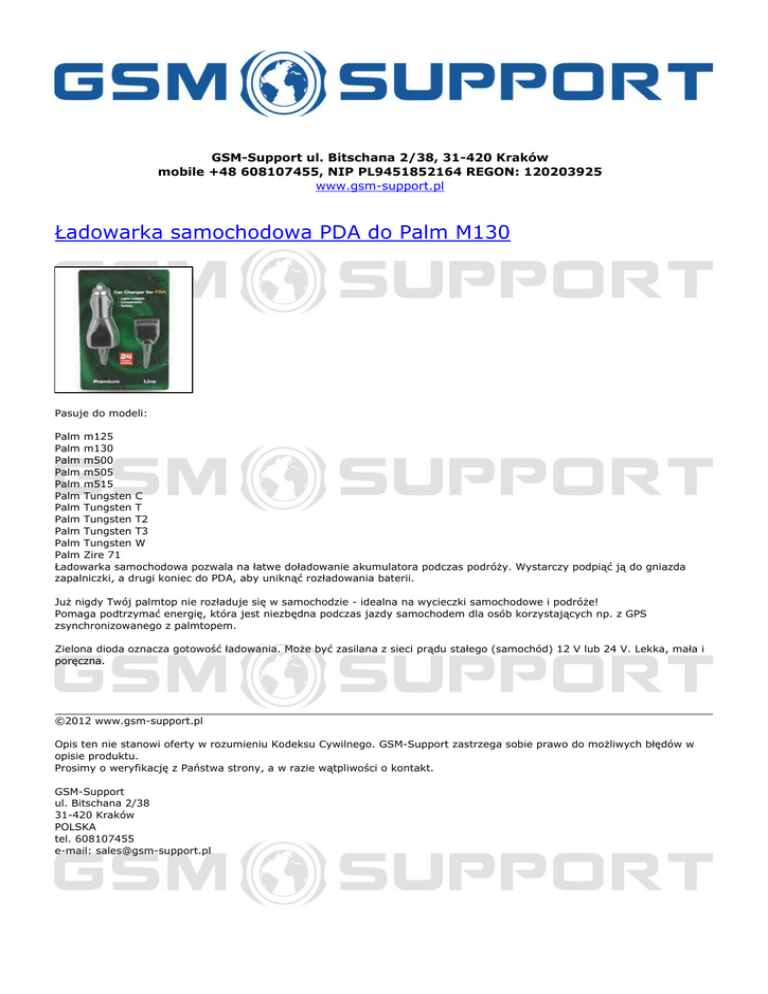 GSM-Support ul. Bitschana 2/38, 31-420 Kraków mobile +48 608107455, NIP PL9451852164 REGON: 120203925 www.gsm-support.pl Ładowarka samochodowa PDA do Palm M130 Pasuje do modeli: Palm m125 Palm m130 Palm m500 Palm m505 Palm m515 Palm Tungsten C Palm Tungsten T Palm Tungsten T2 Palm Tungsten T3 Palm Tungsten W Palm Zire 71 Ładowarka samochodowa pozwala na łatwe doładowanie akumulatora podczas podróży. Wystarczy podpiąć ją do gniazda zapalniczki, a drugi koniec do PDA, aby uniknąć rozładowania baterii. Już nigdy Twój palmtop nie rozładuje się w samochodzie - idealna na wycieczki samochodowe i podróże! Pomaga podtrzymać energię, która jest niezbędna podczas jazdy samochodem dla osób korzystających np. z GPS zsynchronizowanego z palmtopem. Zielona dioda oznacza gotowość ładowania. Może być zasilana z sieci prądu stałego (samochód) 12 V lub 24 V. Lekka, mała i poręczna. ©2012 www.gsm-support.pl Opis ten nie stanowi oferty w rozumieniu Kodeksu Cywilnego. GSM-Support zastrzega sobie prawo do możliwych błędów w opisie produktu. Prosimy o weryfikację z Państwa strony, a w razie wątpliwości o kontakt. GSM-Support ul. Bitschana 2/38 31-420 Kraków POLSKA tel. 608107455 e-mail: [email protected] Powered by TCPDF (www.tcpdf.org)