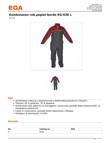 EGA Spółka z o.o. Spółka Komandytowa ul. Rzeczna 1, Nowa Wieś 83-200 Starogard Gdański tel. 58 56 300 80 Kombinezon rob.popiel-bordo KG-028 L 6018 Opis Kombinezon roboczy z elastomerami o doskonałej gramaturze 245g/m2 Tkanina: 65 % poliester, 35 % bawełna Kombinezon jest odporny na rozciąganie i tarcie oraz posiada dobrą elastyczność, co zawdzięcza poliestrowi Łatwy w czyszczeniu, posiada dobre właściwości chłonące Dostępny w rozmiarach: S-XXXL Variants No. Catalog no. 1 6018 EAN 1/2 EGA Spółka z o.o. Spółka Komandytowa ul. Rzeczna 1, Nowa Wieś 83-200 Starogard Gdański tel. 58 56 300 80 2/2 Powered by TCPDF (www.tcpdf.org)