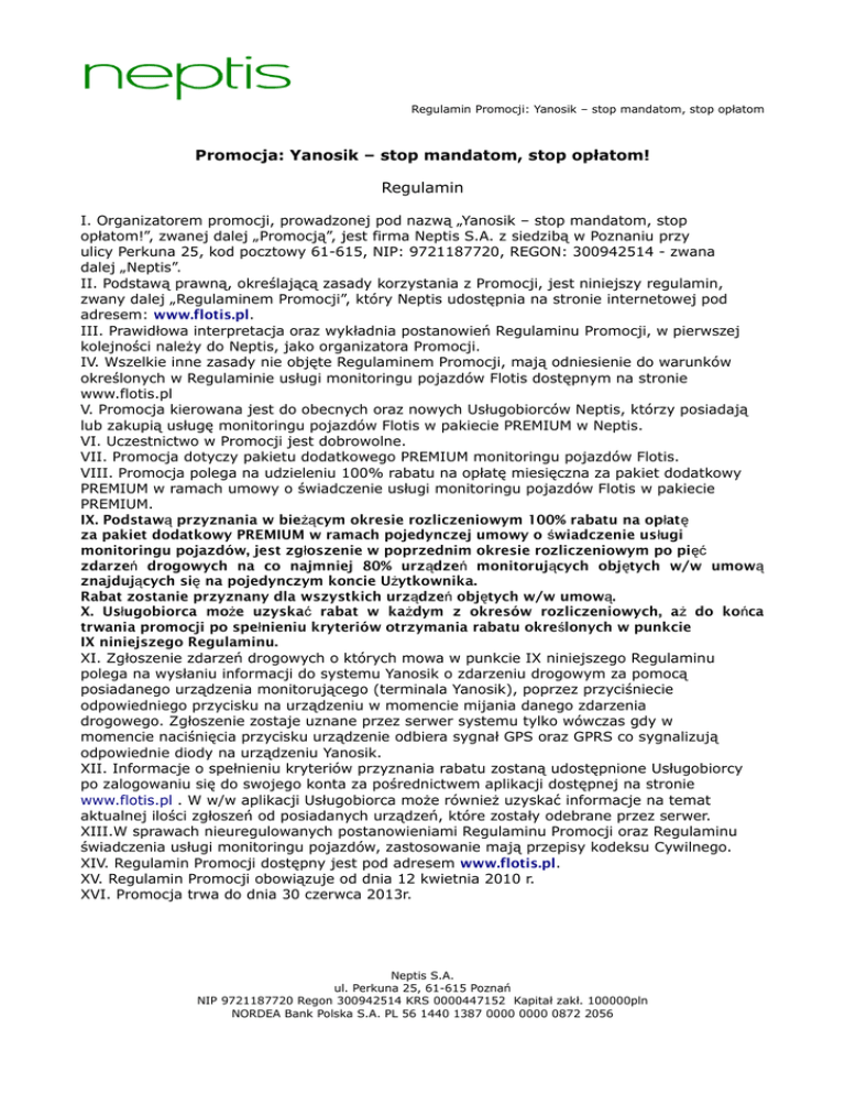 Regulamin Promocji: Yanosik – stop mandatom, stop opłatom Promocja: Yanosik – stop mandatom, stop opłatom! Regulamin I. Organizatorem promocji, prowadzonej pod nazwą „Yanosik – stop mandatom, stop opłatom!”, zwanej dalej „Promocją”, jest firma Neptis S.A. z siedzibą w Poznaniu przy ulicy Perkuna 25, kod pocztowy 61-615, NIP: 9721187720, REGON: 300942514 - zwana dalej „Neptis”. II. Podstawą prawną, określającą zasady korzystania z Promocji, jest niniejszy regulamin, zwany dalej „Regulaminem Promocji”, który Neptis udostępnia na stronie internetowej pod adresem: www.flotis.pl. III. Prawidłowa interpretacja oraz wykładnia postanowień Regulaminu Promocji, w pierwszej kolejności należy do Neptis, jako organizatora Promocji. IV. Wszelkie inne zasady nie objęte Regulaminem Promocji, mają odniesienie do warunków określonych w Regulaminie usługi monitoringu pojazdów Flotis dostępnym na stronie www.flotis.pl V. Promocja kierowana jest do obecnych oraz nowych Usługobiorców Neptis, którzy posiadają lub zakupią usługę monitoringu pojazdów Flotis w pakiecie PREMIUM w Neptis. VI. Uczestnictwo w Promocji jest dobrowolne. VII. Promocja dotyczy pakietu dodatkowego PREMIUM monitoringu pojazdów Flotis. VIII. Promocja polega na udzieleniu 100% rabatu na opłatę miesięczna za pakiet dodatkowy PREMIUM w ramach umowy o świadczenie usługi monitoringu pojazdów Flotis w pakiecie PREMIUM. IX. Podstawą przyznania w bieżącym okresie rozliczeniowym 100% rabatu na opłat ę za pakiet dodatkowy PREMIUM w ramach pojedynczej umowy o świadczenie usługi monitoringu pojazdów, jest zgłoszenie w poprzednim okresie rozliczeniowym po pi ęć zdarzeń drogowych na co najmniej 80% urządzeń monitorujących obj ętych w/w umową znajdujących się na pojedynczym koncie Użytkownika. Rabat zostanie przyznany dla wszystkich urządzeń objętych w/w umową. X. Usługobiorca może uzyskać rabat w każdym z okresów rozliczeniowych, a ż do końca trwania promocji po spełnieniu kryteriów otrzymania rabatu określonych w punkcie IX niniejszego Regulaminu. XI. Zgłoszenie zdarzeń drogowych o których mowa w punkcie IX niniejszego Regulaminu polega na wysłaniu informacji do systemu Yanosik o zdarzeniu drogowym za pomocą posiadanego urządzenia monitorującego (terminala Yanosik), poprzez przyciśniecie odpowiedniego przycisku na urządzeniu w momencie mijania danego zdarzenia drogowego. Zgłoszenie zostaje uznane przez serwer systemu tylko wówczas gdy w momencie naciśnięcia przycisku urządzenie odbiera sygnał GPS oraz GPRS co sygnalizują odpowiednie diody na urządzeniu Yanosik. XII. Informacje o spełnieniu kryteriów przyznania rabatu zostaną udostępnione Usługobiorcy po zalogowaniu się do swojego konta za pośrednictwem aplikacji dostępnej na stronie www.flotis.pl . W w/w aplikacji Usługobiorca może również uzyskać informacje na temat aktualnej ilości zgłoszeń od posiadanych urządzeń, które zostały odebrane przez serwer. XIII.W sprawach nieuregulowanych postanowieniami Regulaminu Promocji oraz Regulaminu świadczenia usługi monitoringu pojazdów, zastosowanie mają przepisy kodeksu Cywilnego. XIV. Regulamin Promocji dostępny jest pod adresem www.flotis.pl. XV. Regulamin Promocji obowiązuje od dnia 12 kwietnia 2010 r. XVI. Promocja trwa do dnia 30 czerwca 2013r. Neptis S.A. ul. Perkuna 25, 61-615 Poznań NIP 9721187720 Regon 300942514 KRS 0000447152 Kapitał zakł. 100000pln NORDEA Bank Polska S.A. PL 56 1440 1387 0000 0000 0872 2056