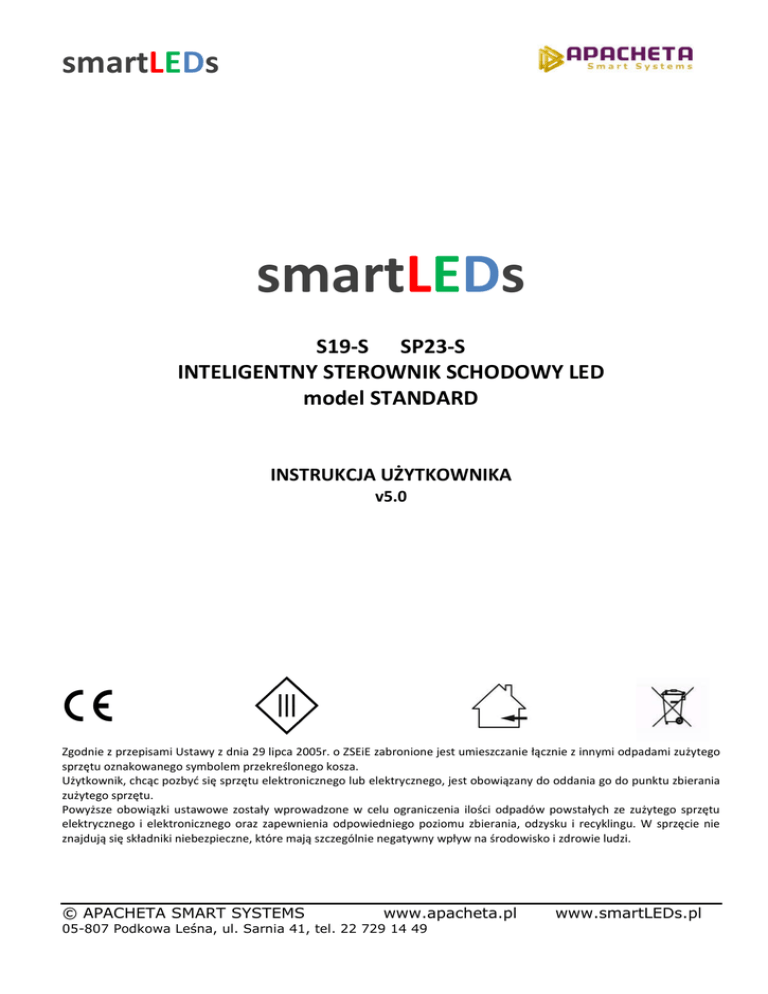 smartLEDs smartLEDs S19-S SP23-S INTELIGENTNY STEROWNIK SCHODOWY LED model STANDARD INSTRUKCJA UŻYTKOWNIKA v5.0 Zgodnie z przepisami Ustawy z dnia 29 lipca 2005r. o ZSEiE zabronione jest umieszczanie łącznie z innymi odpadami zużytego sprzętu oznakowanego symbolem przekreślonego kosza. Użytkownik, chcąc pozbyć się sprzętu elektronicznego lub elektrycznego, jest obowiązany do oddania go do punktu zbierania zużytego sprzętu. Powyższe obowiązki ustawowe zostały wprowadzone w celu ograniczenia ilości odpadów powstałych ze zużytego sprzętu elektrycznego i elektronicznego oraz zapewnienia odpowiedniego poziomu zbierania, odzysku i recyklingu. W sprzęcie nie znajdują się składniki niebezpieczne, które mają szczególnie negatywny wpływ na środowisko i zdrowie ludzi. © APACHETA SMART SYSTEMS www.apacheta.pl 05-807 Podkowa Leśna, ul. Sarnia 41, tel. 22 729 14 49 www.smartLEDs.pl S19-S SP23-S Instrukcja użytkownika v5.0 smartLEDs 1 OPIS URZĄDZENIA S19-S i SP23-S to mikroprocesorowe sterowniki wielopunktowego oświetlenia LED 12V/24V, przeznaczone do instalacji oświetlenia LED schodów (i innych ciągów komunikacyjnych) z oddzielnym sterowaniem każdą lampą i pełnią rolę inteligentnego włącznika oświetlenia. Urządzenie zapala kolejne lampy LED i po ustalonym czasie po kolei je gasi. W przypadku lamp ściemnialnych włączanie i gaszenie oświetlenia odbywa się stopniowo, płynnie, a w przypadku lamp nieściemnialnych – skokowo. W stanie spoczynku lampy są zapalone na 2% maksymalnej jasności. Sterowniki S19-S i SP23-S umożliwiają również wykonanie automatyki ruchu i zmierzchu, a sterownik SP23-S posiada funkcję obsługi ruchu z półpiętra schodów. S19-S i SP23-S to modele PREMIUM sterowników S19 i SP23, wyposażone w: prosty konfigurator, umożliwiający ustawienie trzech (S19-S) lub czterech (SP23-S) parametrów konfiguracyjnych: Liczba lamp, Liczba lamp 1. poziomu (tylko SP23-S), Ściemnialność lamp oraz Czas świecenia. 1.1 Wyprowadzenia Wyprowadzenia sterowników zostały przedstawione na Rys. 1. Rys. 1 Modele sterowników z opisem wyprowadzeń 1.1.1 Zasilanie Do zasilania sterownika służą wyprowadzenia oznaczone GND (masa, minus zasilania) oraz 12V (plus zasilania). Sterownik powinien być zasilany napięciem stałym SELV z zewnętrznego stabilizowanego zasilacza sieciowego o napięciu wyjściowym 8-14V DC i minimalnej wydajności prądowej 100mA. UWAGA! Należy stosować wyłącznie zasilacze oznaczone znakiem z separacją galwaniczną napięcia wyjściowego od napięcia sieci energetycznej. 1.1.2 Wejścia Sterownik ma następujące wejścia sterujące: UP (ruch w górę) i DN (ruch w dół) oraz wejście blokujące działanie sterownika DIS (do podłączenia sondy wbudowanego wyłącznika zmierzchowego (modele str. 2/10 © APACHETA Smart Systems smartLEDs S19-S SP23-S Instrukcja użytkownika v5.0 PREMIUM) lub np. zewnętrznego przełącznika, zegara lub automatu zmierzchowego). Sterownik SP23-S ma dodatkowe wejście sterujące MID (ruch z półpiętra). Na wejścia powinien być podawany bezpotencjałowy sygnał rozwarcia (poziom JEDEN) lub zwarcia do masy (poziom ZERO). UWAGA! Do współpracy z S19-S i SP23-S nadają się wyłącznie zewnętrzne czujniki zmierzchowe i zegary oznaczone znakiem z wyjściami odseparowanymi galwanicznie od napięcia sieci zasilającej. 1.1.3 Wyjścia lamp LED S19-S ma 19, a SP23-S ma 23 wyjścia służące do sterowania lampami LED podłączonymi do sterownika. Do sterownika mogą być podłączane dowolne lampy LED zasilane ze źródła SELV napięciem stałym do 24V DC z separacją galwaniczną od napięcia sieci. Dopuszczalny pobór prądu przez jedną lampę (lub grupę lamp) wynosi 2A. Do wyjść lamp LED należy podłączać ujemny biegun (katodę) lamp LED. Do wyjść sterownika można podłączać zarówno lampy LED ściemnialne (płynne zapalanie/gaszenie lamp, delikatne podświetlenie lamp w stanie spoczynku), jak i nieściemnialne (skokowe zapalanie/gaszenie lamp, brak podświetlenia). 1.2 Konfigurator Parametry S19-S i SP23-S mogą być konfigurowane za pomocą wbudowanego konfiguratora (patrz rozdział 2). 1.3 Opis działania sterownika Normalnym stanem sterownika jest stan spoczynku, w którym żadne wejście nie jest aktywne. W stanie spoczynku lampy ściemnialne są podświetlone na 2% maksymalnej jasności, natomiast lampy nieściemnialne są wygaszone. W stanie spoczynku sterownik oczekuje na pojawienie się aktywnego stanu albo na wejściu DIS (co powoduje wygaszenie podświetlenia i zablokowanie sterownika) albo na dowolnym wejściu sterującym UP, DN lub MID (co powoduje rozpoczęcie sekwencji świecenia). Sekwencja świecenia składa się z następujących po sobie faz: zapalania, świecenia i gaszenia. 1.3.1 Zapalanie lamp Faza zapalania lamp polega na kolejnym zapalaniu poszczególnych lamp, w kolejności od pierwszej do ostatniej (w przypadku, gdy stan aktywny pojawił się na wejściu UP), od ostatniej do pierwszej (w przypadku, gdy stan aktywny pojawił się na wejściu DN) lub, tylko w sterowniku SP23, od półpiętra w dwóch kierunkach do pierwszej i ostatniej (w przypadku, gdy stan aktywny pojawił się na wejściu MID). Jeżeli, w czasie zapalania lamp, stan aktywny pojawi się także na innym wejściu, zapalanie lamp będzie realizowane dodatkowo z drugiej strony. W przypadku lamp ściemnialnych zapalanie lamp jest stopniowe i płynne, a w przypadku lamp nieściemnialnych - skokowe. 1.3.2 Świecenie W fazie świecenia wszystkie lampy są zapalone przez ustalony czas (parametr Czas świecenia). Faza świecenia zostanie przedłużona, jeżeli w trakcie sekwencji świecenia pojawi się stan aktywny na dowolnym wejściu sterującym. © APACHETA Smart Systems str. 3/10 smartLEDs S19-S SP23-S Instrukcja użytkownika v5.0 1.3.3 Gaszenie lamp Faza gaszenia lamp polega na kolejnym gaszeniu lamp – płynnym lub skokowym, w zależności od ustawionego parametru Ściemnialność