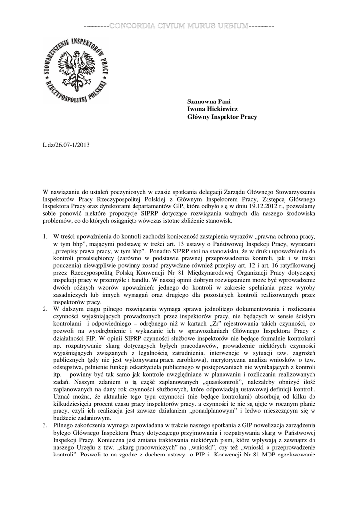 Szanowna Pani Iwona Hickiewicz Główny Inspektor Pracy L.dz/26.07-1/2013 W nawiązaniu do ustaleń poczynionych w czasie spotkania delegacji Zarządu Głównego Stowarzyszenia Inspektorów Pracy Rzeczypospolitej Polskiej z Głównym Inspektorem Pracy, Zastępcą Głównego Inspektora Pracy oraz dyrektorami departamentów GIP, które odbyło się w dniu 19.12.2012 r., pozwalamy sobie ponowić niektóre propozycje SIPRP dotyczące rozwiązania ważnych dla naszego środowiska problemów, co do których osiągnięto wówczas istotne zbliżenie stanowisk. 1. W treści upoważnienia do kontroli zachodzi konieczność zastąpienia wyrazów „prawna ochrona pracy, w tym bhp”, mającymi podstawę w treści art. 13 ustawy o Państwowej Inspekcji Pracy, wyrazami „przepisy prawa pracy, w tym bhp”. Ponadto SIPRP stoi na stanowisku, że w druku upoważnienia do kontroli przedsiębiorcy (zarówno w podstawie prawnej przeprowadzenia kontroli, jak i w treści pouczenia) niewątpliwie powinny zostać przywołane również przepisy art. 12 i art. 16 ratyfikowanej przez Rzeczypospolitą Polską Konwencji Nr 81 Międzynarodowej Organizacji Pracy dotyczącej inspekcji pracy w przemyśle i handlu. W naszej opinii dobrym rozwiązaniem może być wprowadzenie dwóch różnych wzorów upoważnień: jednego do kontroli w zakresie spełniania przez wyroby zasadniczych lub innych wymagań oraz drugiego dla pozostałych kontroli realizowanych przez inspektorów pracy. 2. W dalszym ciągu pilnego rozwiązania wymaga sprawa jednolitego dokumentowania i rozliczania czynności wyjaśniających prowadzonych przez inspektorów pracy, nie będących w sensie ścisłym kontrolami i odpowiedniego – odrębnego niż w kartach „Zr” rejestrowania takich czynności, co pozwoli na wyodrębnienie i wykazanie ich w sprawozdaniach Głównego Inspektora Pracy z działalności PIP. W opinii SIPRP czynności służbowe inspektorów nie będące formalnie kontrolami np. rozpatrywanie skarg dotyczących byłych pracodawców, prowadzenie niektórych czynności wyjaśniających związanych z legalnością zatrudnienia, interwencje w sytuacji tzw. zagrożeń publicznych (gdy nie jest wykonywana praca zarobkowa), merytoryczna analiza wniosków o tzw. odstępstwa, pełnienie funkcji oskarżyciela publicznego w postępowaniach nie wynikających z kontroli itp. powinny być tak samo jak kontrole uwzględniane w planowaniu i rozliczaniu realizowanych zadań. Naszym zdaniem o tą część zaplanowanych „quasikontroli”, należałoby obniżyć ilość zaplanowanych na dany rok czynności służbowych, które odpowiadają ustawowej definicji kontroli. Uznać można, że aktualnie tego typu czynności (nie będące kontrolami) absorbują od kilku do kilkudziesięciu procent czasu pracy inspektorów pracy, a czynności te nie są ujęte w rocznym planie pracy, czyli ich realizacja jest zawsze działaniem „ponadplanowym” i ledwo mieszczącym się w budżecie zadaniowym. 3. Pilnego zakończenia wymaga zapowiadana w trakcie naszego spotkania z GIP nowelizacja zarządzenia byłego Głównego Inspektora Pracy dotyczącego przyjmowania i rozpatrywania skarg w Państwowej Inspekcji Pracy. Konieczna jest zmiana traktowania niektórych pism, które wpływają z zewnątrz do naszego Urzędu z tzw. „skarg pracowniczych” na „wnioski”, czy też „wnioski o przeprowadzenie kontroli”. Pozwoli to na zgodne z duchem ustawy o PIP i Konwencji Nr 81 MOP egzekwowanie „tajemnicy skargowej” przewidzianej dla skarg - tylko do pism pracobiorców lub byłych pracobiorców, a ochroną taką nie będą objęte informacje zawarte we wnioskach pochodzących od osób trzecich, a także od instytucji. Uchroni to inspektorów pracy m.in. przed niczym nieuzasadnioną koniecznością przekonywania strony, że realizowana kontrola jest kontrolą rutynową w sytuacji, gdy np. krótko przed inspektorem pracy inne organy, nie objęte postanowieniami Konwencji Nr 81 MOP, jawnie rozpatrywały sąsiedzki donos lub anonim. Procedura rozpatrywania tego typu spraw powinna zagwarantować jawność postępowania i zachowanie określonych w Kpa praw stron tego postępowania. Aktualnie brak jest także procedury potwierdzania tożsamości osób składających wnioski o przeprowadzenie kontroli , w tym tzw. „skargi pracownicze”. W praktyce każdy może więc wnieść skargę na dowolny podmiot, podając np. nie swoje dane osobowe, nie istniejący adres, lub co gorsza adres i dane osoby trzeciej. Niejednokrotnie kierowana do wnioskodawcy („skarżącego”) korespondencja jest zwracana do urzędu, najczęściej z adnotacją „adresat nieznany”. Znane są też przypadki interwencji obywateli, których danymi osobowymi ktoś nieuprawniony się posłużył składając skargę do PIP. Zauważyć należy, iż traktowanie owych „wniosków o kontrolę”, jako skarg utrudnia, a w wielu sytuacjach nawet uniemożliwia racjonalne zaplanowanie i podjęcie kontroli w tych zakładach, w których potencjalnie istnieją największe zagrożenia czy nieprawidłowości, gdyż wszystkie te „wnioski o kontrole” załatwiane są niezależnie od ich wagi w pierwszej kolejności, w przejętym z Kpa jednomiesięcznym terminem rozpatrzenia sprawy. W wielu przypadkach organ wyznaczać musi kolejne terminy rozpatrzenia sprawy, chociaż zupełnie nie ma wpływu na istniejące obiektywnie ograniczenia (np. pobyt pracodawcy za granicą). Składający wniosek o kontrolę nie musi wskazywać swojego interesu prawnego, często „skargi” składają sąsiedzi, konkurencja czy nawet skłócona rodzina. Prowadzi to do sytuacji wielokrotnie powtarzanych kontroli tego samego podmiotu, nawet w sytuacji nie stwierdzenia istnienia wskazywanych nieprawidłowości. Uważamy, że przy rozpatrywaniu tego typu spraw przepisy Kpa dotyczące skarg, na które powołuje się obecne zarządzenie GIP – mogą być stosowane tylko „odpowiednio” lub przez analogię. Kraków, dnia 25.07.2013 r. Preze