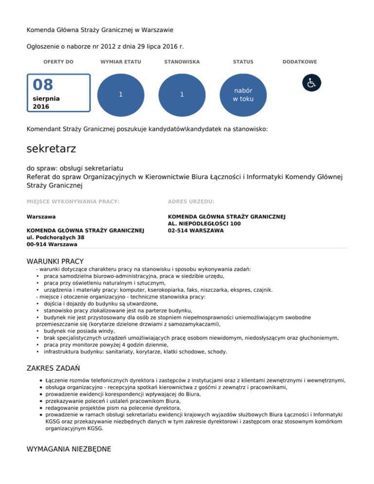 Komenda Główna Straży Granicznej w Warszawie Ogłoszenie o naborze nr 2012 z dnia 29 lipca 2016 r. OFERTY DO WYMIAR ETATU STANOWISKA STATUS 1 1 nabór w toku 08 sierpnia 2016 DODATKOWE Komendant Straży Granicznej poszukuje kandydatów\kandydatek na stanowisko: sekretarz do spraw: obsługi sekretariatu Referat do spraw Organizacyjnych w Kierownictwie Biura Łączności i Informatyki Komendy Głównej Straży Granicznej MIEJSCE WYKONYWANIA PRACY: ADRES URZĘDU: Warszawa KOMENDA GŁÓWNA STRAŻY GRANICZNEJ AL. NIEPODLEGŁOŚCI 100 02-514 WARSZAWA KOMENDA GŁÓWNA STRAŻY GRANICZNEJ ul. Podchorążych 38 00-914 Warszawa WARUNKI PRACY - warunki dotyczące charakteru pracy na stanowisku i sposobu wykonywania zadań: • praca samodzielna biurowo-administracyjna, praca w siedzibie urzędu, • praca przy oświetleniu naturalnym i sztucznym, • urządzenia i materiały pracy: komputer, kserokopiarka, faks, niszczarka, ekspres, czajnik. - miejsce i otoczenie organizacyjno - techniczne stanowiska pracy: • dojścia i dojazdy do budynku są utwardzone, • stanowisko pracy zlokalizowane jest na parterze budynku, • budynek nie jest przystosowany dla osób ze stopniem niepełnosprawności uniemożliwiającym swobodne przemieszczanie się (korytarze dzielone drzwiami z samozamykaczami), • budynek nie posiada windy, • brak specjalistycznych urządzeń umożliwiających pracę osobom niewidomym, niedosłyszącym oraz głuchoniemym, • praca przy monitorze powyżej 4 godzin dziennie, • infrastruktura budynku: sanitariaty, korytarze, klatki schodowe, schody. ZAKRES ZADAŃ Łączenie rozmów telefonicznych dyrektora i zastępców z instytucjami oraz z klientami zewnętrznymi i wewnętrznymi, obsługa organizacyjno - recepcyjna spotkań kierownictwa z gośćmi z zewnątrz i pracownikami, prowadzenie ewidencji korespondencji wpływającej do Biura, przekazywanie poleceń i ustaleń pracownikom Biura, redagowanie projektów pism na polecenie dyrektora, prowadzenie w ramach obsługi sekretariatu ewidencji krajowych wyjazdów służbowych Biura Łączności i Informatyki KGSG oraz przekazywanie niezbędnych danych w tym zakresie dyrektorowi i zastępcom oraz stosownym komórkom organizacyjnym KGSG. WYMAGANIA NIEZBĘDNE Wykształcenie: średnie pozytywne przejście procedury sprawdzającej w celu uzyskania poświadczenia bezpieczeństwa osobowego uprawniającego do dostępu do informacji niejawnych, umiejętność samodzielnej pracy, podstawowa obsługa środowiska WINDOWS i pakiet OFFICE. Posiadanie obywatelstwa polskiego Korzystanie z pełni praw publicznych Nieskazanie prawomocnym wyrokiem za umyślne przestępstwo lub umyśle przestępstwo skarbowe WYMAGANIA DODATKOWE doświadczenie zawodowe: 3 miesiące praca biurowa język angielski – komunikatywny, przeszkolenie – kurs sekretarki – asystentki DOKUMENTY I OŚWIADCZENIA NIEZBĘDNE Życiorys/CV i list motywacyjny Kopie dokumentów potwierdzających spełnienie wymagania niezbędnego w zakresie wykształcenia Oświadczenie o posiadaniu obywatelstwa polskiego albo kopia dokumentu potwierdzającego posiadanie polskiego obywatelstwa Oświadczenie o wyrażeniu zgody na przetwarzanie danych osobowych do celów naboru Oświadczenie o korzystaniu z pełni praw publicznych Oświadczenie o nieskazaniu prawomocnym wyrokiem za umyślne przestępstwo lub umyślne przestępstwo skarbowe DOKUMENTY I OŚWIADCZENIA DODATKOWE kopia dokumentu potwierdzającego niepełnosprawność - w przypadku kandydatek/kandydatów, zamierzających skorzystać z pierwszeństwa w zatrudnieniu w przypadku, gdy znajdą się w gronie najlepszych kandydatek/kandydatów Kopie dokumentów potwierdzających spełnienie wymagania dodatkowego w zakresie doświadczenia zawodowego / stażu pracy Kopie dokumentów potwierdzających spełnienie wymagania dodatkowego w zakresie posiadanych kwalifikacji/przeszkolenia w zakresie kursu sekretarsko-asystenckiego, Kopie dokumentów potwierdzających spełnienie wymagania dodatkowego w zakresie stopnia znajomości języka angielskiego lub oświadczenie kandydata o stopniu znajomości języka angielskiego. TERMINY I MIEJSCE SKŁADANIA DOKUMENTÓW Dokumenty należy złożyć do: 08 sierpnia 2016 r. Decyduje data: stempla pocztowego / osobistego dostarczenia oferty do urzędu Miejsce składania dokumentów: Biuro Kadr i Szkolenia Komendy Głównej Straży Granicznej Al. Niepodległości 100 02-514 Warszawa z dopiskiem "oferta pracy –Sekretarz dyrektora BŁiI KGSG oraz numer ogłoszenia" INNE INFORMACJE: W miesiącu poprzedzającym datę upublicznienia ogłoszenia wskaźnik zatrudnienia osób niepełnosprawnych w urzędzie, w rozumieniu przepisów o rehabilitacji zawodowej i społecznej oraz zatrudnianiu osób niepełnosprawnych, nie wynosi co najmniej 6%. wynagrodzenie na powyższym stanowisku wynosi ok. 1720 zł. netto + dodatek za wysługę lat, - dokumenty należy składać osobiście w siedzibie urzędu lub listownie, - oferty otrzymane po terminie nie będą rozpatrywane – decyduje data przyjęcia oferty w urzędzie lub data stempla pocztowego, - rozpatrzeniu nie będą podlegać oferty niespełniające wymagań określonych w ogłoszeniu a także oferty, które nie zawierają kompletu wymaganych oraz uwiarygodnionych (opatrzonych datą i własnoręcznym podpisem kandydata) dokumentów i oświadczeń, - kandydaci zakwalifikowani będą informowani telefonicznie lub za pośrednictwem poczty elektronicznej o terminie rozmowy kwalifikacyjnej, - przyjmujemy tylko kompletne kserokopie dokumentów, - oferty odrzucone zostaną komisyjnie zniszczone, - wzory wymaganych oświadczeń znajdują się na stronie: http://www.strazgraniczna.pl/pl/straz-graniczna/sprawy-kadrowe/korpus-sluzby-cywilnej/2487,Korpus-sluzby-cy wilnej.html Uwaga! Weryfikacja spełniania przez kandydatów wymagań formalnych dokonana zostanie na podstawie dokumentów wymienionych w części "dokumenty i oświadczenia niezbędne". W związku z tym podkreślamy, że kompletne 
