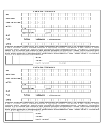 KARTA ZGŁOSZENIOWA IMIĘ NAZWISKO - DATA URODZENIA - ADRES ULICA KOD POCZTOWY MIASTO KLUB PŁEĆ Mężczyzna Kobieta ← właściwe zaznaczyć E-MAIL Wyrażam zgodę na umieszczenie i przetworzenie moich danych osobowych przez organizatorów wyłącznie dla potrzeb imprezy. Ja niżej podpisany/a oświadczam, że jestem zdolny do udziału w w/w imprezie i że brak jest jakichkolwiek przeciwwskazań do mojego czynnego uczestnictwa, a także oświadczam, że jestem ubezpieczony od następstw nieszcześliwych wypadków i zapoznałem się z regulaminem zawodów i go akceptuję, lub niniejszym jako przedstawiciel ustawowy – rodzic/opiekun w/w nieletniego dziecka oświadczam, że jest on(a) zdolny(a) do udziału w zawodach i że brak jest jakichkolwiek przeciwwskazań do uczestnictwa dziecka w zawodach, w związku z czym wyrażam zgodę na jego czynny udział w imprezie oraz oświadczam, że w/w dziecko jest ubezpieczone od następstw nieszczęśliwych wypadków oraz zapoznało się z regulaminem zawodów i go akceptuje. Niniejszym wyrażam zgodę na wykorzystywanie danych osobowych zawartych w kuponie zgłoszeniowym (zgodnie z ustawą z dnia 29.08.97r o ochronie danych osobowych Dz.Ust. nr 133) przez Organizatora do celów marketingowych. Numer startowy (wypełnia organizator) data, podpis KARTA ZGŁOSZENIOWA IMIĘ NAZWISKO - DATA URODZENIA - ADRES ULICA KOD POCZTOWY MIASTO KLUB PŁEĆ Kobieta Mężczyzna ← właściwe zaznaczyć E-MAIL Wyrażam zgodę na umieszczenie i przetworzenie moich danych osobowych przez organizatorów wyłącznie dla potrzeb imprezy. Ja niżej podpisany/a oświadczam, że jestem zdolny do udziału w w/w imprezie i że brak jest jakichkolwiek przeciwwskazań do mojego czynnego uczestnictwa, a także oświadczam, że jestem ubezpieczony od następstw nieszcześliwych wypadków i zapoznałem się z regulaminem zawodów i go akceptuję, lub niniejszym jako przedstawiciel ustawowy – rodzic/opiekun w/w nieletniego dziecka oświadczam, że jest on(a) zdolny(a) do udziału w zawodach i że brak jest jakichkolwiek przeciwwskazań do uczestnictwa dziecka w zawodach, w związku z czym wyrażam zgodę na jego czynny udział w imprezie oraz oświadczam, że w/w dziecko jest ubezpieczone od następstw nieszczęśliwych wypadków oraz zapoznało się z regulaminem zawodów i go akceptuje. Niniejszym wyrażam zgodę na wykorzystywanie danych osobowych zawartych w kuponie zgłoszeniowym (zgodnie z ustawą z dnia 29.08.97r o ochronie danych osobowych Dz.Ust. nr 133) przez Organizatora do celów marketingowych. Numer startowy (wypełnia organizator) data, podpis