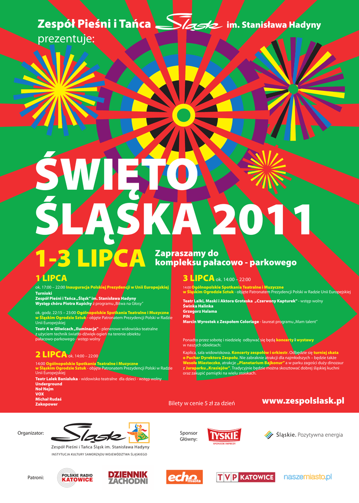 Zespół Pieśni i Tańca prezentuje: im. Stanisława Hadyny ŚWIĘTO ŚLĄSKA 2011 1-3 LIPCA Zapraszamy do kompleksu pałacowo - parkowego 1 LIPCA 3 LIPCA ok. 14:00 – 22:00 ok. 17:00 – 22:00 Inauguracja Polskiej Prezydencji w Unii Europejskiej Turnioki Zespół Pieśni i Tańca „Śląsk” im. Stanisława Hadyny Występ chóru Piotra Kupichy z programu „Bitwa na Głosy” 14:00 Ogólnopolskie Spotkania Teatralne i Muzyczne ok. godz. 22:15 – 23:00 Ogólnopolskie Spotkania Teatralne i Muzyczne w Śląskim Ogrodzie Sztuk - objęte Patronatem Prezydencji Polski w Radzie Unii Europejskiej Teatr A w Gliwicach „Iluminacje" - plenerowe widowisko teatralne z użyciem technik światło-dźwięk-ogień na terenie obiektu pałacowo-parkowego - wstęp wolny 2 LIPCA ok. 14:00 – 22:00 w Śląskim Ogrodzie Sztuk - objęte Patronatem Prezydencji Polski w Radzie Unii Europejskiej Teatr Lalki, Maski i Aktora Groteska „Czerwony Kapturek" - wstęp wolny Świnka Halinka Grzegorz Halama PIN Marcin Wyrostek z Zespołem Coloriage - laureat programu „Mam talent” Ponadto przez sobotę i niedzielę odbywać się będą koncerty i wystawy w naszych obiektach: Kaplica, sala widowiskowa. Koncerty zespołów i orkiestr. Odbędzie się turniej skata o Puchar Dyrektora Zespołu. Nie zabraknie atrakcji dla najmłodszych – będzie także Wesołe Miasteczko, atrakcje „Planetarium Bajkonur” a w parku zagości duży dinozaur z Juraparku „Krasiejów”. Tradycyjnie będzie można skosztować dobrej śląskiej kuchni oraz zakupić pamiątki na wielu stoiskach. 14:00 Ogólnopolskie Spotkania Teatralne i Muzyczne w Śląskim Ogrodzie Sztuk - objęte Patronatem Prezydencji Polski w Radzie Unii Europejskiej Teatr Lalek Banialuka - widowisko teatralne dla dzieci - wstęp wolny Underground Noł Nejm VOX Michał Rudaś Bilety w cenie 5 zł za dzień Zakopower Organizator: Sponsor Główny: INSTYTUCJA KULTURY SAMORZĄDU WOJEWÓDZTWA ŚLĄSKIEGO Patroni: www.zespolslask.pl