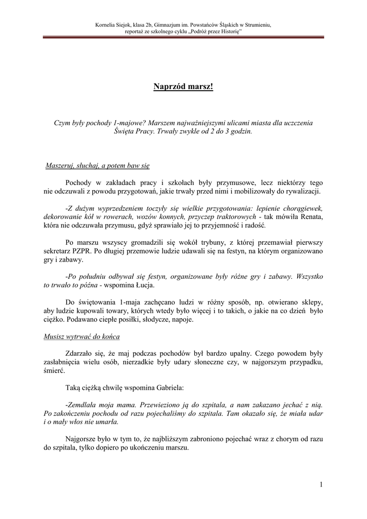 Kornelia Siejok, klasa 2b, Gimnazjum im. Powstańców Śląskich w Strumieniu, reportaż ze szkolnego cyklu „Podróż przez Historię” Naprzód marsz! Czym były pochody 1-majowe? Marszem najważniejszymi ulicami miasta dla uczczenia Święta Pracy. Trwały zwykle od 2 do 3 godzin. Maszeruj, słuchaj, a potem baw się Pochody w zakładach pracy i szkołach były przymusowe, lecz niektórzy tego nie odczuwali z powodu przygotowań, jakie trwały przed nimi i mobilizowały do rywalizacji. -Z dużym wyprzedzeniem toczyły się wielkie przygotowania: lepienie chorągiewek, dekorowanie kół w rowerach, wozów konnych, przyczep traktorowych - tak mówiła Renata, która nie odczuwała przymusu, gdyż sprawiało jej to przyjemność i radość. Po marszu wszyscy gromadzili się wokół trybuny, z której przemawiał pierwszy sekretarz PZPR. Po długiej przemowie ludzie udawali się na festyn, na którym organizowano gry i zabawy. -Po południu odbywał się festyn, organizowane były różne gry i zabawy. Wszystko to trwało to późna - wspomina Łucja. Do świętowania 1-maja zachęcano ludzi w różny sposób, np. otwierano sklepy, aby ludzie kupowali towary, których wtedy było więcej i to takich, o jakie na co dzień było ciężko. Podawano ciepłe posiłki, słodycze, napoje. Musisz wytrwać do końca Zdarzało się, że maj podczas pochodów był bardzo upalny. Czego powodem były zasłabnięcia wielu osób, nierzadkie były udary słoneczne czy, w najgorszym przypadku, śmierć. Taką ciężką chwilę wspomina Gabriela: -Zemdlała moja mama. Przewieziono ją do szpitala, a nam zakazano jechać z nią. Po zakończeniu pochodu od razu pojechaliśmy do szpitala. Tam okazało się, że miała udar i o mały włos nie umarła. Najgorsze było w tym to, że najbliższym zabroniono pojechać wraz z chorym od razu do szpitala, tylko dopiero po ukończeniu marszu. 1 Kornelia Siejok, klasa 2b, Gimnazjum im. Powstańców Śląskich w Strumieniu, reportaż ze szkolnego cyklu „Podróż przez Historię” Jakby na przekór okazało się, że maj może nie tylko zaskoczyć ciepłem, a wręcz upalną pogodą, ale również chłodną i mroźną aurą. Największą niespodzianką dla wszystkich był padający śnieg. -Tego dnia było bardzo chłodno. Podczas pochodu zaczął padać śnieg. Tamten dzień najbardziej utkwił mi w pamięci - opowiada Zofia. -Zapowiadała się piękna pogoda i nauczyciele kazali nam przyjść w letnich ubraniach. W pewnym momencie zrobiło się ciemno i zimno, zaczął padać śnieg - opowiada z kolei Wojciech, który uczęszczał wtedy do Technikum Żeglugi. Z dwóch stron Ludzie biorący udział w pochodach 1-majowych otrzymywali biało-czerwone chorągiewki, z którymi musieli maszerować po ulicach miasta. Zdarzało się, że wyrzucali je po drodze do domu. Dla niektórych 1 maja był dniem szczęśliwym, dla innych zaś smutnym. Jednych przygotowania do pochodu uszczęśliwiały, innych złościły. Jedni maszerowali z uśmiechem na twarzy inni uciekali do domów przy jakiejkolwiek okazji. Niestety, groziło to również obniżeniem zachowania, a w klasach starszych niedopuszczeniem do matury. -Z wielką niechęcią brałam udział w tych uroczystościach, więc gdy tylko mogłam zostawałam w domu. Pochód kierował się w stronę rynku, na którym mieściła się trybuna honorowa. Wtedy rozpoczynała się najnudniejsza część uroczystości, więc gdy tylko nadarzyła się okazja uciekaliśmy do domów. Wiele z moich koleżanek i kolegów bojąc się kary jaką było obniżenie zachowania zostawało do końca. W późniejszych latach, gdy chodziłam do szkoły średniej przestawałam uczęszczać na pochody – tak Alina wspomina swoje lata szkolne w czasie pochodów. Pochody dzieliły kiedyś, dzielą i dziś ludzi, którzy je wspominają. Czy więcej było tam entuzjazmu czy nakazów? Czy bardziej łączyły w działaniu, czy podporządkowywały władzy? Wydaje się, że ludzie mieli zwykle dobre intencje, ale byli manipulowani i to tak bardzo, że przestawały się liczyć ich uczucia. Może tak zaczął rodzić się bunt? Ludzie pomaszerowali ku wolnej Polsce, ku niezależnym związkom zawodowym, ku wolności słowa... 2
