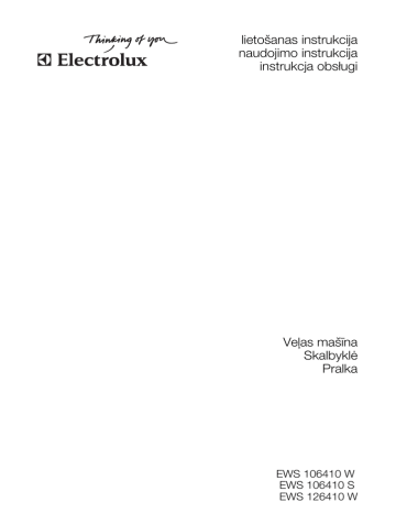 lietošanas instrukcija naudojimo instrukcija instrukcja obsługi Veļas mašīna Skalbyklė Pralka EWS 106410 W EWS 106410 S EWS 126410 W 2 electrolux Electrolux. Thinking of you. Dalieties ar mums savā pieredzē un pārdomās vietnē www.electrolux.com SATURS Drošības informācija Izstrādājuma apraksts Vadības panelis Pirmā ieslēgšana Personalizācija Izmantošana ikdienā Noderīgi ieteikumi un padomi Mazgāšanas programmas 2 4 5 7 8 8 11 13 Kopšana un tīrīšana Ko darīt, ja ... Tehniskie dati Patēriņa lielumi Uzstādīšana Elektrības padeves pieslēgšana Apsvērumi par vides aizsardzību 16 20 22 23 23 26 26 Izmaiņu tiesības rezervētas. DROŠĪBAS INFORMĀCIJA Svarīgi rūpīgi izlasiet tos un saglabājiem turpmākām uzziņām. • Ierīces drošība atbilst visiem noteiktajiem nozares standartiem un normatīvajām prasībām par mājsaimniecības ierīču drošību. Tomēr kā ražotāji, mēs uzskatām, ka mums ir pienākums informēt par noteiktiem drošības apsvērumiem. • Ir ļoti svarīgi turēt šo rokasgrāmatu ierīces tuvumā, lai Jūs varētu vienmēr tajā ieskatīties. Ja veļas mašīna tiek pārdota vai atdota jaunam īpašniekam vai ja pārceļaties uz citu mājokli, bet ierīci atstāat, pievienojiet tai šo rokasgrāmatu, lai jaunais īpašnieks varētu iegūt informāciju par veļas mašīnas darbību un drošību. • IZLASIET padomus rūpīgi pirms veļas mašīnas uzstādīšanas vai lietošanas. • Pirms pirmās iedarbināšanas pārliecinieties, vai veļas mašīnai nav radušies bojājumi tās pārvietošanas laikā. Nekādā gadījumā nepieslēdziet bojātu veļas mašīnu. Ja kāda detaļa ir bojāta, sazinieties ar piegādātāju. • Ja veļas mašīna piegādāta ziemā, kad gaisa temperatūra ir zem nulles: paturiet veļas mašīnu istabas temperatūrā 24 stundas pirms pirmās lietošanas reizes. VISPĀRĪGI NORĀDĪJUMI PAR DROŠĪBU • Mainīt ierīces specifikācijas vai mēģināt to pārbūvēt ir bīstami. • Ja mazgāšana notiek, izmantojot karstu ūdeni, durtiņu stikla lūka var sakarst. Nepieskarties tai! • Nodrošiniet, lai mājdzīvnieki nevarētu iekļūt veļas tilpnē. Lai to nepieļautu, pirms lietošanas pārbaudiet cilindru. • Dažādi priekšmeti, piemēram, spraužamadatas, naglas, skrūves, akmentiņi vai citi cieti un asi materiāli var sabojāt veļas mašīnu, tādēļ uzmanieties, lai tādi tur nenokļūst. • Izmantojiet tikai ieteiktos mazgāšanas līdzekļu un mīkstinātāju daudzumus. Pārsniedzot devas, var sabojāt audumu. Skatiet ražotāja ieteiktos mazgāšanas līdzekļu daudzumus. • Mazus apģērba gabalus, piemēram, zeķes, mežģīnes, jostas u.tml. ievietojiet mazgāšanas maisā vai spilvendrānā, jo tie var iekļūt starp ierīces tvertni un veļas tilpni. • Nemazgājiet veļas mašīnā apģērbu, kas ir neapvīlēts vai saplēsts. • Pēc lietošanas, tīrīšanas vai apkopes atvienojiet veļas mašīnu no elektrotīkla un atslēdziet ūdens piegādi. • Nekādā gadījumā nemēģiniet mašīnu remontēt pašrocīgi. Nepieredzējušas personas veikts remonts var izraisīt ievainojumus vai nopietnus ierīces darbības traucējumus. Sazinieties ar vietējo klientu atbalsta centru. Pieprasiet tikai oriģinālas rezerves daļas. electrolux 3 UZSTĀDĪŠANA • Šī iekārta ir smaga. Tās pārvietošana jāveic uzmanīgi. • Izsaiņojot pārbaudiet, vai tai nav bojājumu. Ja rodas šaubas, sazinieties ar klientu atbalsta centru. • Pirms lietošanas noņemiet iesaiņojuma materiālus un transportēšanai paredzētās skrūves. Pretējā gadījumā var rasties nopietni izstrādājuma bojājumi. Skatiet attiecīgo lietošanas rokasgrāmatas sadaļu. • Pēc ierīces uzstādīšanas, pārbaudiet, vai tā nav novietota uz ūdens ieplūdes un aizplūdes šļūtenēm, un vai darbvirsma nesaskaras ar strāvas kabeli. • Ja veļas mašīna novietota uz paklāja, noregulējiet ierīces kājiņas tā, lai nodrošinātu brīvu gaisa cirkulāciju. • Pēc uzstādīšanas pārliecinieties, vai ūdens šļūtenēm vai to savienojumiem nav noplūdes. • Ja ierīce tiek uzstādīta vietā ar zemu gaisa temperatūru, lūdzu, iepazīstieties ar rokasgrāmatas sadaļā "Sasalšanas bīstamība" • Santehnikas darbus saistībā ar veļas mašīnas uzstādīšanu drīkst veikt tikai kvalificēts santehniķis vai cita zinoša persona. • Elektrisko pieslēgumu drīkst veikt tikai kvalificēts elektriķis vai cita zinoša persona. LIETOŠANA • Šī ierīce ir paredzēta izmantošanai mājsaimniecībā. To drīkst izmantot tikai paredzētajiem nolūkiem. • Mazgājiet tikai tādu veļu, ko paredzēts mazgāt veļas mašīnā. Ievērojiet norādījumus uz veļas informatīvajām etiķetēm. • Nepārslogojiet iekārtu. Skatiet mazgāšanas programmu tabulu. • Pirms mazgāšanas pārliecinieties, vai visas mazgājamo apģērbu kabatas ir tukšas un rāvējslēdzēji aizvilkti. Nav ieteicams mazgāt izdilušu vai saplēstu veļu, bet traipus, piemēram, krāsas, tintes, rūsas vai zāles, pirms mazgāšanas jāapstrādā. Krūšturus ar stiprinājumiem NEDRĪKST mazgāt veļas mašīnā. • Veļu ar gaistošu naftas produktu traipiem nedrīkst mazgāt veļas mašīnā. Ja tiek iz- mantoti gaistoši tīrīšanas šķidrumi, iztīriet tos no veļas pirms ievietošanas mašīnā. • Neraujiet elektrības kabeli, lai izvilktu kontaktdakšu no sienas kontaktligzdas; bet vienmēr velciet pašu kontaktdakšu. • Neizmantojiet veļas mazgājamo mašīnu, ja bojāts strāvas kabelis, vadības panelis, darba virsma vai ierīce bojāta tā, ka iespējams piekļūt tās iekšpusei. BĒRNU DROŠĪBA • Šo ierīci nedrīkst izmantot cilvēki (ieskaitot bērnus) ar samazinātu jutību, garīgi nespējīgi, bez pieredzes un zināšanām, ja vien tie netiek atbilstoši uzraudzīti vai arī zinoša persona viņiem nesniedz attiecīgus norādījumus. • Bērni ir jāuzrauga, lai tie nespēlēt