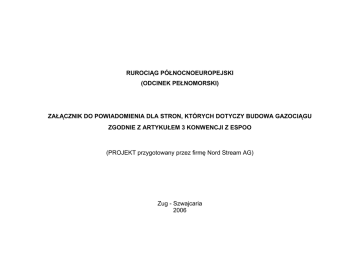 RUROCIĄG PÓŁNOCNOEUROPEJSKI (ODCINEK PEŁNOMORSKI) ZAŁĄCZNIK DO POWIADOMIENIA DLA STRON, KTÓRYCH DOTYCZY BUDOWA GAZOCIĄGU ZGODNIE Z ARTYKUŁEM 3 KONWENCJI Z ESPOO (PROJEKT przygotowany przez firmę Nord Stream AG) Zug - Szwajcaria 2006 1. INFORMACJA NA TEMAT PROPONOWANEJ DZIAŁALNOŚCI i) Informacja o charakterze proponowanej działalności Typ proponowanej działalności Przesył gazu ziemnego na odcinku pełnomorskim - z Rosji przez Morze Bałtyckie do Niemiec. Czy proponowana działalność jest Tak. wymieniona w załączniku I do Konwencji? Załącznik I lit. 8: Rurociąg do transportu ropy naftowej i gazu o dużej średnicy. Przedmiot proponowanej działalności Budowa, rozruch technologiczny, eksploatacja i konserwacja oraz wyłączenie z użycia pełnomorskiego systemu przesyłowego gazu ziemnego o długości ok. 1.200 km, obejmującego dwa równoległe rurociągi ze stacją sprężania. Zakres proponowanej działalności Działalność obejmuje: Budowa 2 (dwóch) gazociągów o dużej średnicy o łącznej przepustowości 55 mld. nm3 rocznie. Długość rurociągów od stacji sprężania w Portovaya, Rosja, do stacji pomiarowo-regulacyjnej w Greifswald, Niemcy, wynosi ok. 1.200 km. Budowa pełnomorskiej platformy ze stacją sprężania. Położenie platformy określa się wstępnie na ok. 90 km NE/E od Gotlandii w szwedzkiej EEZ. Rozruch technologiczny, eksploatacja i konserwacja oraz wyłączenie z użycia systemu przesyłowego. Opis proponowanej działalności Patrz opis ‘Dokument informacyjny dot. projektu’. Cel proponowanej działalności Przesył gazu ziemnego do sieci europejskiej Uzasadnienie proponowanej działalności Działalność - jako projekt priorytetowy NG1 transeuropejskiej sieci energetycznej UE (TEN-E's) - ma na celu pokrycie zapotrzebowania na gaz ziemny w Unii Europejskiej. W tym kontekście działalność należy traktować jako nową i alternatywną trasę przesyłową do istniejących rurociągów lądowych (np. rurociąg Jamalski przez Białoruś i rurociągi europejskie przez Ukrainę) oraz jako poprawę ogólnego bezpieczeństwa dostaw gazu do UE. 2z7 ii) Informacja na temat przestrzennych i czasowych granic proponowanej działalności Położenie System przesyłowy będzie zlokalizowany na wodach rosyjskich, fińskich, szwedzkich, duńskich i niemieckich z miejscami zetknięcia z lądem odpowiednio w Rosji i Niemczech. Rurociąg - z wyjątkiem miejsc zetknięcia z lądem - będzie zlokalizowany wyłącznie na wodach międzynarodowych (EEZ - wyłączna strefa ekonomiczna). Platforma pełnomorska będzie zlokalizowana na terenie szwedzkiej EEZ- wyłącznej strefy ekonomicznej - NE/E od Gotlandii. Miejsca budów zostaną czasowo przygotowane (i utrzymywane w czasie budowy) na wybrzeżu Rosji i Niemiec. Inne środki pomocnicze związane z logistyką budowy i instalacji w tym obszarze (jeżeli są) zostaną określone w szczegółowej fazie projektowej, np. zaplecze dostawcze budowy rurociągu. Opis lokalizacji System rurociągu będzie przebiegać w przybliżeniu w środkowej części Morza Bałtyckiego, patrz opis w ‘Dokumencie informacyjnym dot. projektu’. Uzasadnienie lokalizacji proponowanej działalności Działalność jest zlokalizowana na wodach terytorialnych oraz EEZ Rosji, EEZ Finlandii, Szwecji i Danii oraz na EEZ i wodach terytorialnych Niemiec. Wybór trasy został dokonany w oparciu o zintegrowaną ocenę aspektów technicznych, środowiskowych, kulturowych i ekonomicznych. W ramach zintegrowanej analizy wykonalności przeprowadzonej w latach 1997-99 obliczono 3 alternatywne trasy: • Od strony lądu z Rosji przez Finlandię z połączeniem do Szwecji przez Zatokę Botnicką, a następnie lądem na południe Szwecji i przez Morze Bałtyckie bezpośrednio do Niemiec • Od strony lądu z Rosji przez południowo-zachodnią Finlandię i Morze Bałtyckie do Niemiec. • Od strony lądu z Rosji przez Zatokę Fińską i Morze Bałtyckie do Niemiec (proponowana działalność). Proponowana działalność została oceniona jako najlepiej wykonalny sposób poprowadzenia rurociągów przesyłowych, zaś projekt koncepcji dla tej opcji zostanie zakończony w lipcu 2006 r. Harmonogram proponowanej działalności Analiza wykonalności: 1997 – 1999 (North Transgas Oy) Projekt koncepcji: w toku - 07/2006 Szczegółowy projekt: 01/2007 – 12/2007 Wyprodukowanie i dostarczenie rur rurociągu: 04/2007 – 10/2009 Budowa pierwszego rurociągu i platformy pełnomorskiej: 01/2008 – 12/2009 Rozruch technologiczny pierwszego rurociągu i platformy pełnomorskiej: 06/2009 – 02/2010 Budowa drugiego rurociągu: 11/2011 - 10/2013 Osiągnięcie pełnej zdolności systemu przesyłowego przewidziano na rok 2013. 3z7 iii) Informacja na temat oczekiwanego wpływu na środowisko i proponowanych środków zaradczych Zakres oceny Podczas projektowania gazociągu północnoeuropejskiego uwagę zwrócono na zminimalizowanie wpływu na środowisko naturalne podczas wyboru trasy rurociągu i obszarów zetknięcia z lądem. Podczas oceny wpływu na środowisko uwypuklone zostaną następujące punkty główne: • Trasa rurociągu (zostanie ponownie omówiona i skonsolidowana podczas szczegółowej fazy projektu) • Instalacje w miejscach zetknięcia z lądem (szczegółowy plan i metody instalacji (podejście do linii brzegowej/szczegóły części lądowej w Niemczech)) • Platforma pełnomorska (projekt wizualny, sposób budowy) • Lokalizacja środków pomocniczych (zaplecze dostawcze, magazynowanie rur itd.) • Obszary z amunicją konwencjonalną i chemiczną • W czasie budowy/układania rurociągu punkty takie, jak: ryzyko kolizji ze statkiem, wpływ składowisk amunicji, różnych metod pogłębiania, wstępnych i końcowych wykopów oraz prób ciśnieniowych. Wstępną ocenę środowiskową przeprowadzono w oparciu o podstawowe badania środowiskowe przygotowane w czasie analizy wykonalności (1997-99). Badania podstawowe są obecnie aktualizow
