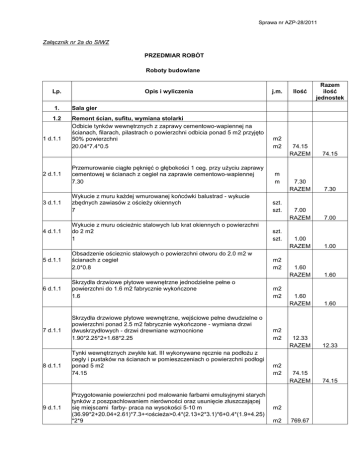 Sprawa nr AZP-28/2011 Załącznik nr 2a do SIWZ PRZEDMIAR ROBÓT Roboty budowlane Lp. Opis i wyliczenia j.m. 1. Sala gier 1.2 Remont ścian, sufitu, wymiana stolarki Odbicie tynków wewnętrznych z zaprawy cementowo-wapiennej na ścianach, filarach, pilastrach o powierzchni odbicia ponad 5 m2 przyjęto 50% powierzchni 20.04*7.4*0.5 m2 m2 1 d.1.1 2 d.1.1 3 d.1.1 4 d.1.1 5 d.1.1 6 d.1.1 7 d.1.1 8 d.1.1 9 d.1.1 Przemurowanie ciągłe pęknięć o głębokości 1 ceg. przy użyciu zaprawy cementowej w ścianach z cegieł na zaprawie cementowo-wapiennej 7.30 Wykucie z muru każdej wmurowanej końcówki balustrad - wykucie zbędnych zawiasów z ościeży okiennych 7 Wykucie z muru ościeżnic stalowych lub krat okiennych o powierzchni do 2 m2 1 Obsadzenie ościeznic stalowych o powierzchni otworu do 2.0 m2 w ścianach z cegieł 2.0*0.8 Skrzydła drzwiowe płytowe wewnętrzne jednodzielne pełne o powierzchni do 1.6 m2 fabrycznie wykończone 1.6 Skrzydła drzwiowe płytowe wewnętrzne, wejściowe pełne dwudzielne o powierzchni ponad 2.5 m2 fabrycznie wykończone - wymiana drzwi dwuskrzydłowych - drzwi drewniane wzmocnione 1.90*2.25*2+1.68*2.25 Tynki wewnętrznych zwykłe kat. III wykonywane ręcznie na podłożu z cegły i pustaków na ścianach w pomieszczeniach o powierzchni podłogi ponad 5 m2 74.15 Przygotowanie powierzchni pod malowanie farbami emulsyjnymi starych tynków z poszpachlowaniem nierówności oraz usunięcie złuszczającej się miejscami farby- praca na wysokości 5-10 m (36.99*2+20.04+2.61)*7.3+<ościeża>0.4*(2.13+2*3.1)*6+0.4*(1.9+4.25) *2*9 m m szt. szt. szt. szt. m2 m2 m2 m2 m2 m2 m2 m2 Ilość 74.15 RAZEM 74.15 7.30 RAZEM 7.30 7.00 RAZEM 7.00 1.00 RAZEM 1.00 1.60 RAZEM 1.60 1.60 RAZEM 1.60 12.33 RAZEM 12.33 74.15 RAZEM 74.15 m2 m2 Razem ilość jednostek 769.67 Sprawa nr AZP-28/2011 <tynk>-74.15 <okna>-(1.9*4.25)*9-(2.13*3.1)*6 <drzwi>-3*1.9*2.2 <opaska podsufitem>-0.4*(20.04+2*36.99) 10 d.1.1 11 d.1.1 12 d.1.1 13 d.1.1 14 d.1.1 15 d.1.1 16 d.1.1 Dwukrotne malowanie farbami emulsyjnymi starych tynków wewnętrznych ścian - 5-10 m ponad podłogą ( farby w ciemnym kolorze) 769.67 Lakierowanie powierzchni metalowych gładkich - praca na wysokości 510 m -sufit 36.99*20.04+0.4*(36.99*2+20.04) Ostrożny demontaż boazerii drewnianych płytowych lub z listewek z przezn.do ponow.wbud.o pow. powyżej 5.0 m2 35.75*2.5<zabudowa grzejników> 0.9*3.60*14<drabinki> 18 d.1.1 19 d.1.1 20 d.1.1 -74.15 m2 m2 -12.54 -37.61 RAZEM 645.37 769.67 RAZEM 769.67 778.89 RAZEM 778.89 89.38 45.36 RAZEM 134.74 134.74 RAZEM 134.74 134.74 RAZEM 134.74 134.74 RAZEM 134.74 1.00 RAZEM 1.00 112.67 RAZEM 112.67 250.25 RAZEM 250.25 30.00 RAZEM 30.00 m2 m2 m2 m2 m2 m2 m2 Ręczne cyklinowanie i szlifowanie elem.(płaszczyzn) gładkich o pow.ponad 1.0 m2 134.74 m2 m2 Dwukrotne lakierowanie stolarki drzwiowej ścianek i szafek o powierzchni ponad 1.0 m2 134.74 m2 m2 Przepierzenia ze szkieletem z desek lub łat obitych deskami lub łatami w odstępach (ażurowe) - ponowny montaż zabudowy i drabinek wymiana 10% desek w zabudowie ilość - 89,40 x 10% x 0,02 = 0,17m3 134.74 malowanie 2x farbą olejną konstrukcji wsporczej tablic do koszykówki 1 17 d.1.1 m2 Dwukrotne malowanie farbą olejną siatek ciągnionych i plecionych z ramkami stalowymi - malowanie krat zabezpieczających okna 6*2.15*3.10+9*1.9*4.25 m2 m2 kpl. kpl. m2 m2 Dwukrotne malowanie farbą olejną rur wodociągowych i gazowych o średnicy ponad 50 do 100 mm 35.75*7 m m montaż uchwytów w ścianie murowanej do wieszania siatek 30 szt szt 1 szt szt montaż obudowy nagłośnienia sali (wg ST poz. 2.3) 1.00 RAZEM Załącznik nr 2a do SIWZ 1.00 2 Sprawa nr AZP-28/2011 21 d.1.1 Rusztowania ramowe warszawskie jednokolumnowe wysokości do 8 m 1 22 d.1.1 Czas pracy rusztowań grupy 1 (poz.:1,8,9,11,16,17) 1.2 23 d.1.2 Remont posadzki Rozebranie posadzek z klepek parkietowych 200.0 24 d.1.2 25 d.1.2 26 d.1.2 m2 m2 Ślepa podłoga z desek o grubości 25 mm na legarach ułożonych krzyżowo- wymiana desek pod parkietem przyjęto 30% powierzchni parkietu przewidzianego do rozbiórki 200.0*0.3 m2 m2 Uzupełnienie posadzki o powierzchni do 5 m2 w jednym miejscu z deszczułek dębowych lub jesionowych o grubości 22 mm mocowanych na gwoździe 200.0 m2 m2 Wymiana pojedynczych deszczułek z drewna liściastego 230 27 d.1.2 28 d.1.2 29 d.1.2 30 d.1.2 31 d.1.2 32 d.1.2 33 d.1.2 kol. kol. Mechaniczne szlifowanie starych posadzek z deszczułek o powierzchni ponad 8 m2 z demontażem i ponownym montażem listew przyściennych 36.99*(20.04-2.50) Dwukrotne malowanie farbą olejną lub ftalową podłóg drewnianych lakierowanie parkietu 2x -capon 648.80 szt. szt. m2 m2 m2 m2 Dwukrotne malowanie farbą olejną lub ftalową podłóg drewnianych lakierowanie parkietu 3x -lakier twardy do sal sportowych 648.80 m2 m2 Dwukrotne malowanie farbą olejną lub ftalową drewnianych cokołów o wysokości do 20cm - lakierowanie 20.0+37.0*2 m m wymiana tartanu na bieżni (36.99+5.0)*2.22 m m malowanie linii boisk boiska do badmintona 6 szt - 525,30m boisko do koszykówki - 249,80m boisko do unihokeja - 205,00m boisko do siatkówki - 81,00m boisko do piłki recznej 214,20m razem 1 275,30mb 1 kpl kpl 1 szt. szt. malowanie logo AWF 1.00 RAZEM 1.00 200.00 RAZEM 200.00 60.00 RAZEM 60.00 200.00 RAZEM 200.00 230.00 RAZEM 230.00 648.80 RAZEM 648.80 648.80 RAZEM 648.80 648.80 RAZEM 648.80 94.00 RAZEM 94.00 93.22 RAZEM 93.22 1.00 RAZEM 1.00 1.00 RAZEM Załącznik nr 2a do SIWZ 1.00 3 Sprawa nr AZP-28/2011 2. 34 d.2 35 d.2 36 d.2 37 d.2 38 d.2 39 d.2 40 d.2 41 d.2 42 d.2 43 d.2 44 d.2 3. 45 d.3 Balkon Rozebranie posadzek wraz z cokolikami 1.72*27.0+(2.90+1.72)/2*3.67 Malowanie pędzlem farbami do gruntowania chlorokauczukowymi konstrukcji szkieletowych 10.0 Wymiana listew przyściennych z drewna liściastego - wymiana desek czołowych na balkonie szer. 45 cm 1.72+27.0+3.90 Izolacje cieplne i przeciwdźwiękowe z płyt wiórowo-cementowych poziome na sucho zpłyt OSB gr 18mm 54.92 Obudowa bele