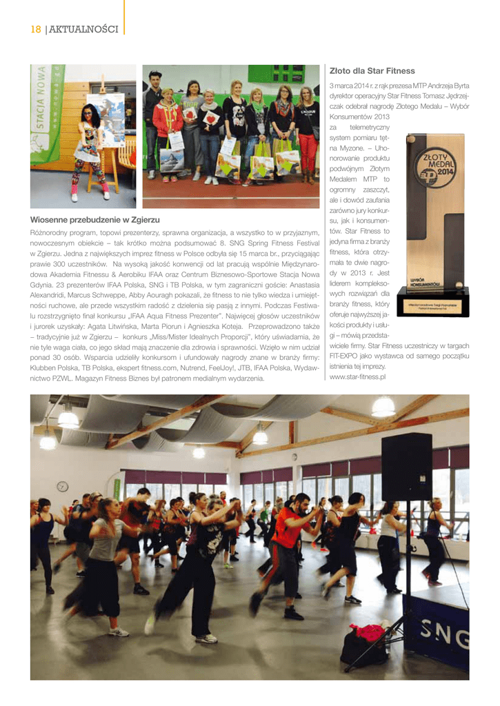 18 |AKTUALNOŚCI Złoto dla Star Fitness Wiosenne przebudzenie w Zgierzu Różnorodny program, topowi prezenterzy, sprawna organizacja, a wszystko to w przyjaznym, nowoczesnym obiekcie – tak krótko można podsumować 8. SNG Spring Fitness Festival w Zgierzu. Jedna z największych imprez fitness w Polsce odbyła się 15 marca br., przyciągając prawie 300 uczestników. Na wysoką jakość konwencji od lat pracują wspólnie Międzynarodowa Akademia Fitnessu & Aerobiku IFAA oraz Centrum Biznesowo-Sportowe Stacja Nowa Gdynia. 23 prezenterów IFAA Polska, SNG i TB Polska, w tym zagraniczni goście: Anastasia Alexandridi, Marcus Schweppe, Abby Aouragh pokazali, że fitness to nie tylko wiedza i umiejętności ruchowe, ale przede wszystkim radość z dzielenia się pasją z innymi. Podczas Festiwalu rozstrzygnięto finał konkursu „IFAA Aqua Fitness Prezenter”. Najwięcej głosów uczestników i jurorek uzyskały: Agata Litwińska, Marta Piorun i Agnieszka Koteja. Przeprowadzono także − tradycyjnie już w Zgierzu − konkurs „Miss/Mister Idealnych Proporcji”, który uświadamia, że nie tyle waga ciała, co jego skład mają znaczenie dla zdrowia i sprawności. Wzięło w nim udział ponad 30 osób. Wsparcia udzieliły konkursom i ufundowały nagrody znane w branży firmy: Klubben Polska, TB Polska, ekspert fitness.com, Nutrend, FeelJoy!, JTB, IFAA Polska, Wydawnictwo PZWL. Magazyn Fitness Biznes był patronem medialnym wydarzenia. 3 marca 2014 r. z rąk prezesa MTP Andrzeja Byrta dyrektor operacyjny Star Fitness Tomasz Jędrzejczak odebrał nagrodę Złotego Medalu – Wybór Konsumentów 2013 za telemetryczny system pomiaru tętna Myzone. − Uhonorowanie produktu podwójnym Złotym Medalem MTP to ogromny zaszczyt, ale i dowód zaufania zarówno jury konkursu, jak i konsumentów. Star Fitness to jedyna firma z branży fitness, która otrzymała te dwie nagrody w 2013 r. Jest liderem kompleksowych rozwiązań dla branży fitness, który oferuje najwyższej jakości produkty i usługi – mówią przedstawiciele firmy. Star Fitness uczestniczy w targach FIT-EXPO jako wystawca od samego początku istnienia tej imprezy. www.star-fitness.pl