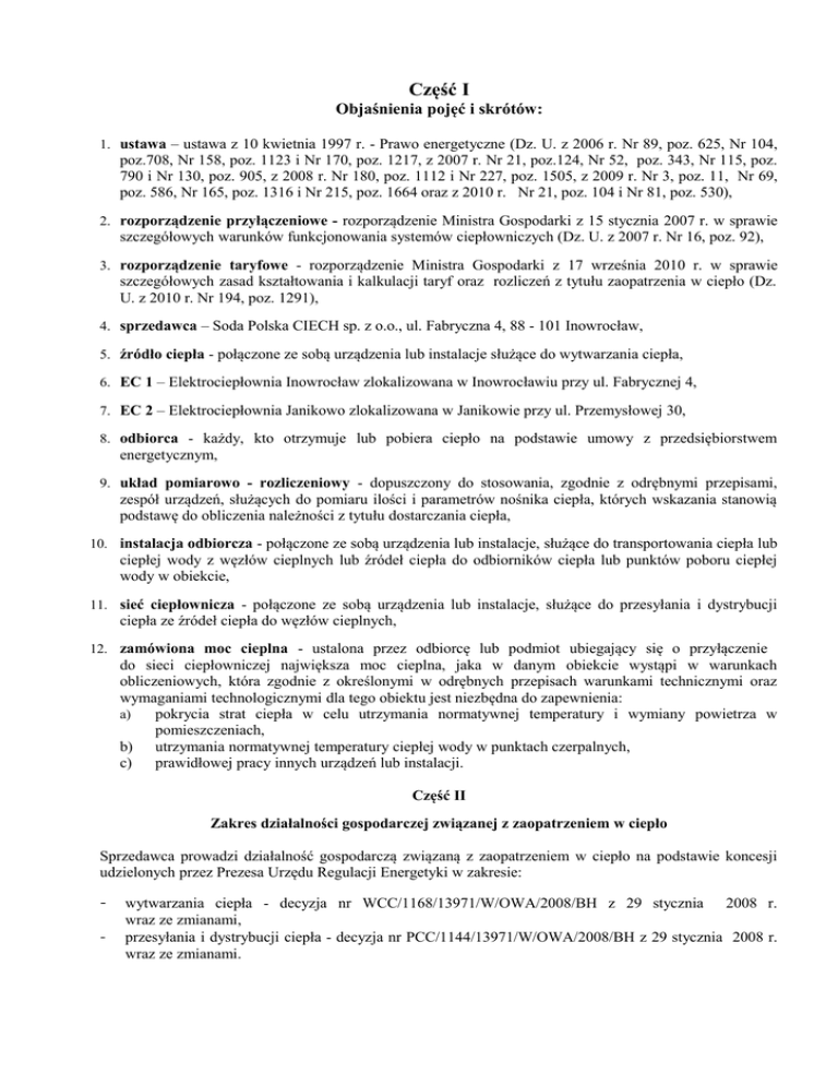 Część I Objaśnienia pojęć i skrótów: 1. ustawa – ustawa z 10 kwietnia 1997 r. - Prawo energetyczne (Dz. U. z 2006 r. Nr 89, poz. 625, Nr 104, poz.708, Nr 158, poz. 1123 i Nr 170, poz. 1217, z 2007 r. Nr 21, poz.124, Nr 52, poz. 343, Nr 115, poz. 790 i Nr 130, poz. 905, z 2008 r. Nr 180, poz. 1112 i Nr 227, poz. 1505, z 2009 r. Nr 3, poz. 11, Nr 69, poz. 586, Nr 165, poz. 1316 i Nr 215, poz. 1664 oraz z 2010 r. Nr 21, poz. 104 i Nr 81, poz. 530), 2. rozporządzenie przyłączeniowe - rozporządzenie Ministra Gospodarki z 15 stycznia 2007 r. w sprawie szczegółowych warunków funkcjonowania systemów ciepłowniczych (Dz. U. z 2007 r. Nr 16, poz. 92), 3. rozporządzenie taryfowe - rozporządzenie Ministra Gospodarki z 17 września 2010 r. w sprawie szczegółowych zasad kształtowania i kalkulacji taryf oraz rozliczeń z tytułu zaopatrzenia w ciepło (Dz. U. z 2010 r. Nr 194, poz. 1291), 4. sprzedawca – Soda Polska CIECH sp. z o.o., ul. Fabryczna 4, 88 - 101 Inowrocław, 5. źródło ciepła - połączone ze sobą urządzenia lub instalacje służące do wytwarzania ciepła, 6. EC 1 – Elektrociepłownia Inowrocław zlokalizowana w Inowrocławiu przy ul. Fabrycznej 4, 7. EC 2 – Elektrociepłownia Janikowo zlokalizowana w Janikowie przy ul. Przemysłowej 30, 8. odbiorca - każdy, kto otrzymuje lub pobiera ciepło na podstawie umowy z przedsiębiorstwem energetycznym, 9. układ pomiarowo - rozliczeniowy - dopuszczony do stosowania, zgodnie z odrębnymi przepisami, zespół urządzeń, służących do pomiaru ilości i parametrów nośnika ciepła, których wskazania stanowią podstawę do obliczenia należności z tytułu dostarczania ciepła, 10. instalacja odbiorcza - połączone ze sobą urządzenia lub instalacje, służące do transportowania ciepła lub ciepłej wody z węzłów cieplnych lub źródeł ciepła do odbiorników ciepła lub punktów poboru ciepłej wody w obiekcie, 11. sieć ciepłownicza - połączone ze sobą urządzenia lub instalacje, służące do przesyłania i dystrybucji ciepła ze źródeł ciepła do węzłów cieplnych, 12. zamówiona moc cieplna - ustalona przez odbiorcę lub podmiot ubiegający się o przyłączenie do sieci ciepłowniczej największa moc cieplna, jaka w danym obiekcie wystąpi w warunkach obliczeniowych, która zgodnie z określonymi w odrębnych przepisach warunkami technicznymi oraz wymaganiami technologicznymi dla tego obiektu jest niezbędna do zapewnienia: a) pokrycia strat ciepła w celu utrzymania normatywnej temperatury i wymiany powietrza w pomieszczeniach, b) utrzymania normatywnej temperatury ciepłej wody w punktach czerpalnych, c) prawidłowej pracy innych urządzeń lub instalacji. Część II Zakres działalności gospodarczej związanej z zaopatrzeniem w ciepło Sprzedawca prowadzi działalność gospodarczą związaną z zaopatrzeniem w ciepło na podstawie koncesji udzielonych przez Prezesa Urzędu Regulacji Energetyki w zakresie: - wytwarzania ciepła - decyzja nr WCC/1168/13971/W/OWA/2008/BH z 29 stycznia 2008 r. wraz ze zmianami, przesyłania i dystrybucji ciepła - decyzja nr PCC/1144/13971/W/OWA/2008/BH z 29 stycznia 2008 r. wraz ze zmianami. Sprzedawca prowadzi działalność gospodarczą związaną z zaopatrzeniem odbiorców w ciepło, które wytwarzane jest w dwóch źródłach ciepła i przesyłane jest za pośrednictwem sieci ciepłowniczych, w których nośnikiem ciepła jest woda i para wodna. Majątek zaangażowany do wykonywania tej działalności stanowi własność sprzedawcy. Część III Podział odbiorców na grupy Zgodnie z § 10 rozporządzenia taryfowego określono siedem grup odbiorców: Grupa EC 1 SW - odbiorcy ciepła wytwarzanego w EC 1, przesyłanego za pośrednictwem sieci ciepłowniczej, w której nośnikiem ciepła jest woda o maksymalnych parametrach 130/90°C. Grupa EC 1 SWI - odbiorcy ciepła wytwarzanego w EC 1, przesyłanego za pośrednictwem sieci ciepłowniczej, w której nośnikiem ciepła jest woda o maksymalnych parametrach 130/90°C, do indywidualnych węzłów cieplnych. Grupa EC 1 SWG - odbiorcy ciepła wytwarzanego w EC 1, przesyłanego za pośrednictwem sieci ciepłowniczej, w której nośnikiem ciepła jest woda o maksymalnych parametrach 130/90°C, do grupowych węzłów cieplnych. Grupa EC 1 SP - odbiorcy ciepła wytwarzanego w EC 1, przesyłanego za pośrednictwem sieci ciepłowniczej, w której nośnikiem ciepła jest para wodna o maksymalnym ciśnieniu 7,1 MPa i temperaturze 465°C. Grupa EC 2 SW - odbiorcy ciepła wytwarzanego w EC 2, przesyłanego za pośrednictwem sieci ciepłowniczej, w której nośnikiem ciepła jest woda o maksymalnych parametrach 130/90°C. Grupa EC 2 SWIN - odbiorcy ciepła wytwarzanego w EC 2, przesyłanego za pośrednictwem sieci ciepłowniczej, w której nośnikiem ciepła jest woda o maksymalnych parametrach 130/90°C, poprzez węzeł cieplny i instalacje odbiorcze. Grupa EC 2 SP - odbiorcy ciepła wytwarzanego w EC 2, przesyłanego za pośrednictwem sieci ciepłowniczej, w której nośnikiem ciepła jest para wodna o maksymalnym ciśnieniu 3,5 MPa i temperaturze 280°C. Część IV Rodzaje oraz wysokość cen i stawek opłat 1. Wysokość cen w zakresie wytwarzania ciepła 1.1. Cena za zamówioną moc cieplną Lp. 1.2. Grupa odbiorców roczna zł/MW/rok netto rata miesięczna zł/MW/m-c netto 1. EC 1 SW, EC 1 SWI, EC 1 SWG, EC 1 SP 41 386,04 3 448,84 2. EC 2 SW, EC 2 SWIN, EC 2 SP 58 444,76 4 870,40 Cena ciepła Lp. zł/GJ netto Grupa odbiorców 1. EC 1 SW, EC 1 SWI, EC 1 SWG, EC 1 SP 17,51 2. EC 2 SW, EC 2 SWIN, EC 2 SP 17,74 1.3. Cena nośnika ciepła 2 Lp. Grupa odbiorców 1. EC 1 SW, EC 1 SWI, EC1SWG, 2. EC 1 SP 3. EC 2 SW, EC 2 SWIN 4. EC 2 SP zł/m3 netto zł/t netto 2,29 - - 2,38 3,52 - - 3,67 Wysokość stawek opłat w zakresie przesyłania i dystrybucji ciepła 2.1. Stawka opłaty stałej Lp. Grupa odbiorców 1. 2. 3. 4. 5. 6. 7. EC 1 SW EC 1 SWI EC 1 SWG EC 1 SP EC 2 SW EC 2 SWIN EC 2 SP roczna zł/MW/rok netto 18 099,