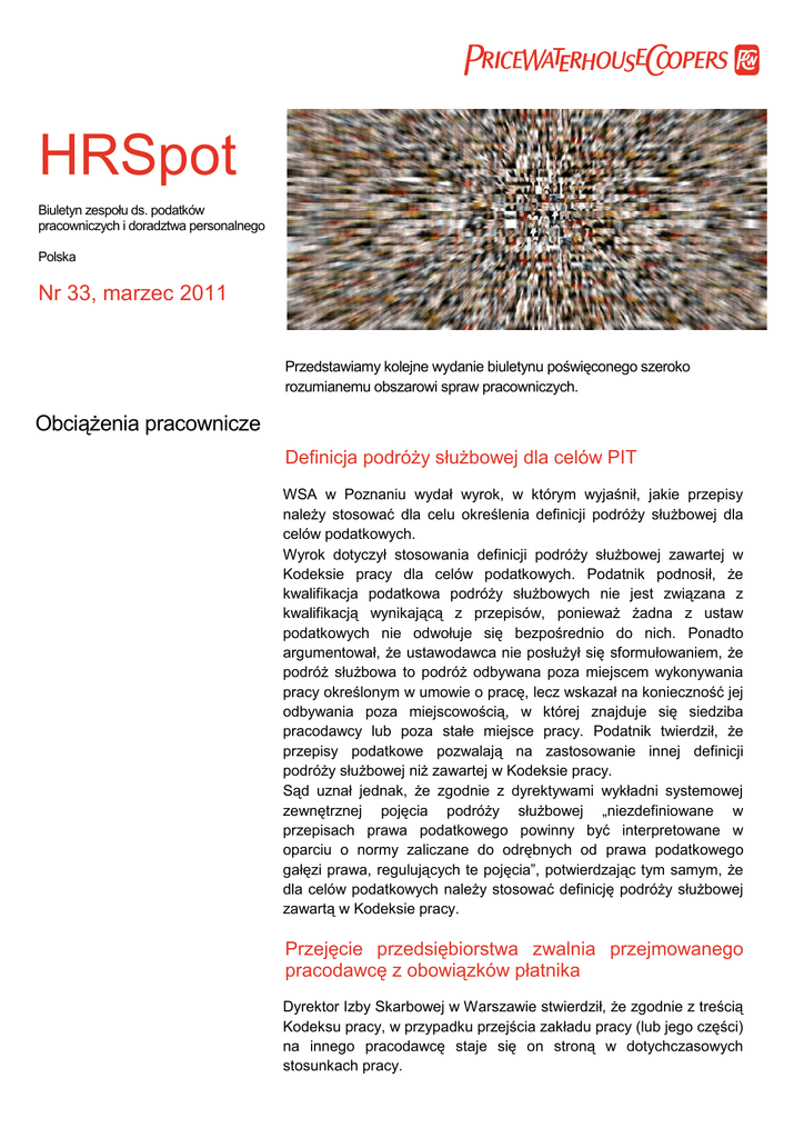 HRSpot Biuletyn zespołu ds. podatków pracowniczych i doradztwa personalnego Polska Nr 33, marzec 2011 Przedstawiamy kolejne wydanie biuletynu poświęconego szeroko rozumianemu obszarowi spraw pracowniczych. Obciążenia pracownicze Definicja podróży służbowej dla celów PIT WSA w Poznaniu wydał wyrok, w którym wyjaśnił, jakie przepisy należy stosować dla celu określenia definicji podróży służbowej dla celów podatkowych. Wyrok dotyczył stosowania definicji podróży służbowej zawartej w Kodeksie pracy dla celów podatkowych. Podatnik podnosił, że kwalifikacja podatkowa podróży służbowych nie jest związana z kwalifikacją wynikającą z przepisów, ponieważ żadna z ustaw podatkowych nie odwołuje się bezpośrednio do nich. Ponadto argumentował, że ustawodawca nie posłużył się sformułowaniem, że podróż służbowa to podróż odbywana poza miejscem wykonywania pracy określonym w umowie o pracę, lecz wskazał na konieczność jej odbywania poza miejscowością, w której znajduje się siedziba pracodawcy lub poza stałe miejsce pracy. Podatnik twierdził, że przepisy podatkowe pozwalają na zastosowanie innej definicji podróży służbowej niż zawartej w Kodeksie pracy. Sąd uznał jednak, że zgodnie z dyrektywami wykładni systemowej zewnętrznej pojęcia podróży służbowej „niezdefiniowane w przepisach prawa podatkowego powinny być interpretowane w oparciu o normy zaliczane do odrębnych od prawa podatkowego gałęzi prawa, regulujących te pojęcia”, potwierdzając tym samym, że dla celów podatkowych należy stosować definicję podróży służbowej zawartą w Kodeksie pracy. Przejęcie przedsiębiorstwa zwalnia przejmowanego pracodawcę z obowiązków płatnika Dyrektor Izby Skarbowej w Warszawie stwierdził, że zgodnie z treścią Kodeksu pracy, w przypadku przejścia zakładu pracy (lub jego części) na innego pracodawcę staje się on stroną w dotychczasowych stosunkach pracy. HRSpot Polska PricewaterhouseCoopers Nr 33, marzec 2011 Strona 2 W takim przypadku, stosunek pracy nie zostaje rozwiązany mimo dokonanych przekształceń podmiotowych. Kodeks pracy przewiduje natomiast konstrukcję automatycznego wejścia w stosunek pracy po stronie jednego zakładu (lub jego części) w miejsce innego pracodawcy. Z powyższego wynika, że obowiązki płatnika, wynikające z ustawy o PIT ( Art. 32, art. 37 oraz art.39) przechodzą na nowego płatnika, który po zakończeniu roku podatkowego ma obowiązek sporządzania stosownych informacji za cały rok podatkowy (PIT-11 oraz na żądanie podatnika PIT-40) oraz obowiązek naliczania i poboru zaliczek na PIT na zasadzie kontynuacji. Human Resources Znaczenie procesu adaptacji w osiąganiu pełnej efektowności pracy przez nowo przyjętego pracownika Adaptacja polega na zapewnieniu, że nowo przyjęty pracownik zaczyna sprawnie funkcjonować w firmie i szybko osiąga oczekiwany na jego stanowisku poziom efektywności pracy. Odpowiednio przeprowadzony proces adaptacji zmniejsza ryzyko odejścia pracownika, zwiększa jego poczucie bezpieczeństwa, a tym samym wzmacnia więź z firmą i zaangażowanie w pracę. Dodatkowo, skraca okres przystosowania pracownika do wymagań na stanowisku pracy i przyśpiesza moment, w którym pracownik osiąga pełną efektywność. Brak lub niewłaściwa adaptacja, z kolei, często kończy się odejściem lub zwolnieniem pracownika, co wiąże się z konsekwencjami w postaci kosztów płynności kadr i obniżonej efektywności pracy w organizacji. Głównymi błędami popełnianymi w procesie przystosowania nowego pracownika jest m.in.: przeciążenie informacyjne w ciągu pierwszych dni pracy i założenie, że wszystkie podane wówczas informacje powinny zostać zapamiętane; ograniczanie procesu adaptacji do kilku pierwszych dni, podczas gdy nowo przyjęty pracownik może potrzebować kilku miesięcy na to, aby w pełni przystosować się do nowego środowiska pracy; nieobecność menedżera, co może prowadzić do przekonania nowo przyjętego pracownika, że jest mało znaczący dla organizacji; brak jednoznacznego wyjaśnienia, jakie plany strategiczne i cele ma dana organizacja / departament / zespół, w jaki sposób będzie oceniana praca jednostki, naliczane premie i jak przedstawiają się kryteria awansu oraz co oczekiwane jest od nowo przyjętego pracownika w ciągu pierwszego okresu (tygodnia, miesiąca pracy); HRSpot Polska PricewaterhouseCoopers Nr 33, marzec 2011 Strona 3 przekazywanie wszystkim nowo przyjętym pracownikom takich samych informacji w wystandaryzowany sposób, bez odwoływania się do indywidualnych potrzeb i zainteresowań nowo przyjętych pracowników oraz sposobów, w jaki przetwarzają te informacje. Wymiar społeczny Akceptacja norm i zasad współpracy w zespole, stylu kierowania, kontaktów ze współpracownikami Akceptacja misji i podstawowych wartości, którymi kieruje się firma Wymiar zawodowy Prawidłowa adaptacja powinna przebiegać na dwóch wymiarach: zawodowym oraz społecznym, jak i obejmować zarówno: stanowisko pracy i środowisko organizacji. Przystosowanie się do treści i warunków pracy Przygotowanie się do wewnętrznego podziału pracy, technologii, organizacji pracy Stanowisko pracy, rola w organizacji Środowisko organizacji Źródło: A. Pocztowski, Zarządzanie zasobami ludzkimi Prawo pracy Klauzula dotycząca wypowiedzenia umowy o pracę na czas określony W wyroku z dnia 10 czerwca 2010 r. wydanym w sprawie I PK 52/10 Sąd Najwyższy wyraził pogląd, iż strony mogą przewidzieć dopuszczalność wcześniejszego rozwiązania umowy o pracę na czas określony dłuższy niż 6 miesięcy za dwutygodniowym wypowiedzeniem również w okresie trwania umowy o pracę. Ponadto Sąd Najwyższy zwrócił uwagę, że pracodawca powinien najpóźniej w dniu rozpoczęcia pracy przez pracownika potwierdzić mu na piśmie ustalenia dotyczące umowy, jej rodzaju i warunków, jednakże z uwagi na fakt, iż form