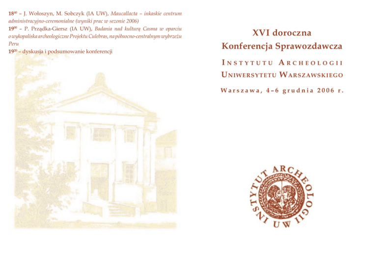 1840 – J. Wołoszyn, M. Sobczyk (IA UW), Maucallacta – inkaskie centrum administracyjno-ceremonialne (wyniki prac w sezonie 2006) 1900 – P. Prządka-Giersz (IA UW), Badania nad kulturą Casma w oparciu o wykopaliska archeologiczne Projektu Culebras, na północno-centralnym wybrzeżu Peru 1920 – dyskusja i podsumowanie konferencji XVI doroczna Konferencja Sprawozdawcza INSTYTUTU ARCHEOLOGII U NIWERSYTETU W ARSZAWSKIEGO Warszawa, 4–6 grudnia 2006 r. Poniedziałek, 4 grudnia 2006 900 – POWITANIE UCZESTNIKÓW KONFERENCJI PRZEZ DYREKTORA IA UW Sesja I: od epoki kamienia do wczesnej epoki żelaza 915 – W. Migal (PMA), M. Przeździecki (IA UW), Sprawozdanie z badań na stan. „Mały Gawroniec” w Ćmielowie, woj. świętokrzyskie 935 – K. Pyrzewicz, W. Migal (PMA) i M. Przeździecki (IA UW), Wyniki badań na stan. 3 w miejscowości Suchodółka, woj. świętokrzyskie 945 – A. Brzóska, G. Kałwak i A. Grabarek (IA UW), Nadzory archeologiczne podczas budowy autostrady A1, w woj. pomorskim w 2006 r. 955 – M. Nowakowska (IA UW), Cmentarzysko kultury łużyckiej w Pomiotowie, stan. 25, woj. zachodniopomorskie. Sprawozdanie z badań w sezonie 2006 1005 – A. Waluś, P. Prejs (IA UW), Badania wykopaliskowe i podwodne w Ząbiu, stan. X, woj. warmińsko-mazurskie w 2006 r. 1025 – A. Jaremek (IA UW), Wstępne wyniki badań wielokulturowego kompleksu osadniczego w Jeziorku stan. I, woj. warmińsko-mazurskie w 2006 r. 1045 – dyskusja 1100 – przerwa na kawę Sesja II: z badań nad okresem wczesnego średniowiecza w Polsce (1) 1115 – POWITANIE GOŚCI SESJI II-V PRZEZ DYREKTORA IA UW 1125 – H. Kóčka-Krenz (UAM, Poznań), Najdawniejszy Poznań wciąż odkrywany 1145 – J. Gąssowski (AH, Pułtusk), Ważniejsze badania Instytutu Antropologii i Archeologii Akademii Humanistycznej im. Aleksandra Gieysztora w Pułtusku 1205 – S. Moździoch (IAiE PAN, Wrocław), M. Przysiężna-Pizarska (UO, Opole), Wczesnośredniowieczny gród w Ryczynie na Śląsku. Siedziba biskupia czy pogańskie miejsce kultu? 1225 – J. Piekalski (UWr, Wrocław), Archeologia Wrocławia 1245 – dyskusja 1300 – przerwa obiadowa Sesja XIII: prahistoria i protohistoria – w Polsce i nie tylko… (3) 1430 – A. Szela (IA UW), Mazowsze z przełomu er na podstawie badań wykopaliskowych na stanowiskach w Kuczborku i Brudnicach, pow. Żuromin 1450 – L. Sawicka (IA UW), „Cudze chwalicie, swojego nie znacie” – z badań nad zbiorami archiwalnymi IA UW 1500 – W. Nowakowski (IA UW), Wojownicy bez mieczy – 12 lat później 1520 – M. Rudnicki II (IA UW), Wyniki badań wykopaliskowych w Pieckach k/Mrągowa na Mazurach 1530 – B. Kontny (IA UW), Komu i w jakim celu przyprawiano rogi? – zaskakujące znalezisko z grobu 22 w Čertogor (d. Trausitten) na Sambii 1540 – dyskusja 1555 – przerwa na kawę Sesja XIV: ex Oriente lux (2) et Varia 1610 – M. Kornacka (IA UW), Wieże milczenia – starożytność i współczesność 1630 – M. Łuszczewska (IA UW), „Co dwie głowy, to nie jedna”. O pewnych aspektach dekoracji rzeźbiarskiej świątyni w Chhim (Liban) 1640 – A. Sołtysiak (IA UW), Próchnica zębów jako źródło historyczne. Przykład z dorzecza Haburu (Syria) 1700 – J. Żelazowski (IA UW), R. Żukowski (IAiE PAN, Warszawa), Na styku archeologii, numizmatyki i epigrafiki. Srebrna patera z medalionem Teodozjusza II z Muzeum Narodowego w Warszawie 1720 – dyskusja 1735 – przerwa na spotkanie się z rozumem… (jeszcze jedna kawa ?!?) Sesja XV: śladami Ra 1750 – S. Rzepka (IA UW), Graffiti naskalne w Tebach Zachodnich 1810 – J.K. Winnicki (IA UW), Dary wotywne w Egipcie Epoki Późnej 1820 – A. Wodzińska (IA UW), Giza Plateau Mapping Project w 2006 r., ze szczególnym uwzględnieniem szkoły dla inspektorów egipskich. Prace nad podręcznikiem do ceramiki egipskiej Środa, 6 grudnia 2006 Sesja XI: prahistoria i protohistoria – w Polsce i nie tylko… (1) 900 – W. Brzeziński (PMA), Badania wykopaliskowe Państwowego Muzeum Archeologicznego – wyniki sezonu 2006 920 – S.K. Kozłowski (IA UW), Włodzimierz Antoniewicz, czyli studiować archeologię w cesarskim Wiedniu 940 – R.F. Mazurowski (IA UW), Tell Qaramel. Osada z okresu wczesnego neolitu przedceramicznego w Syrii 1000 – M. Białowarczuk (IA UW), Wczesnoneolityczne konstrukcje ścian we współczesnym budownictwie północnej Syrii 1020 – J. Urban (IA UW), Uprawa roli w gospodarce ludności kultury łużyckiej – wybrane zagadnienia 1030 – dyskusja 1045 – przerwa na kawę Sesja XII: prahistoria i protohistoria – w Polsce i nie tylko… (2) 1100 – M. Rudnicki I (IA UW), Krowa, trzy piece i coś jeszcze…, czyli sezon 2006 w Pełczyskach 1120 – P. Dulęba (IA UW), Celtowie na Pogórzu Wielickim 1140 – M.F. Stępniowski (IA UW), O pożytkach ze spacerów 1150 – A. Cieśliński (IA UW), A. Kasprzak (Muzeum w Koszalinie), Najnowsze wyniki badań na cmentarzysku kurhanowym kultury wielbarskiej w Nowym Łowiczu, pow. drawski 1200 – A. Cieśliński (IA UW), J. Schuster (Universität Bonn), Polsko-niemieckie badania kurhanu książęcego w Lubieszewie na Pomorzu Zachodnim 1220 – A. Maciałowicz (IA UW), Teczki i wykrywacze, czyli 110 lat badań na cmentarzysku kultury przeworskiej w Gołębiewie, na północnym Mazowszu 1240 – dyskusja 1300 – przerwa obiadowa Sesja III: z badań nad okresem wczesnego średniowiecza w Polsce (2) 1430 – W. Chudziak (UMK, Toruń), Z badań nad miejscami kultu na Pomorzu. Góra św. Wawrzyńca w Kałdusie i wyspa na Jeziorze Zarańskim w Żółtem 1450 – M. Dulinicz (IAiE PAN, Warszawa), Wczesnośredniowieczne Mazowsze w badaniach IAiE PAN 1510 – A. Andrzejewski (UŁ, Łódź), Dwór Sapiehów w Dubnie w woj. podlaskim w świetle najnowszych badań 1530 – E. Marczak (IA UW), Czy w Truszkach-Zalesiu istniał warsztat szklarski? 1540 – dyskusja 1600 – przerwa na kawę Sesja IV: z badań nad okresem wczesnego średniowiecza w Polsce (3) 1615 – W. Wr