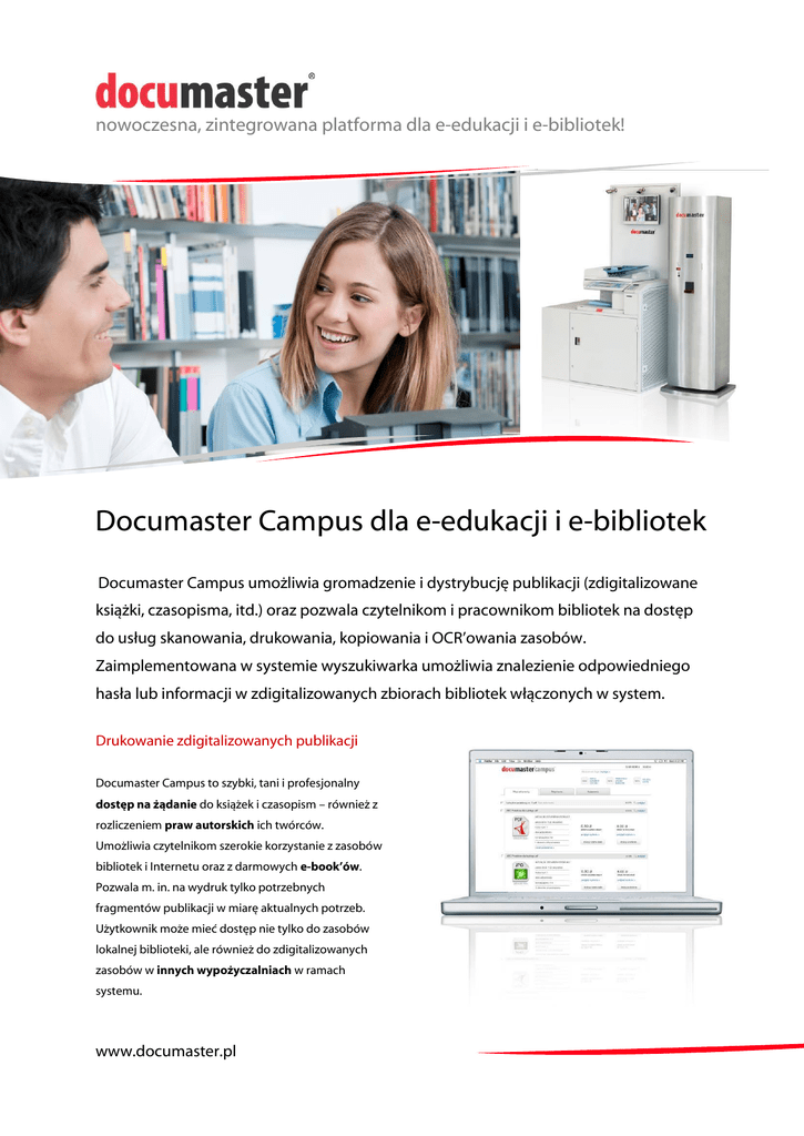 nowoczesna, zintegrowana platforma dla e-edukacji i e-bibliotek! Documaster Campus dla e-edukacji i e-bibliotek Documaster Campus umożliwia gromadzenie i dystrybucję publikacji (zdigitalizowane książki, czasopisma, itd.) oraz pozwala czytelnikom i pracownikom bibliotek na dostęp do usług skanowania, drukowania, kopiowania i OCR’owania zasobów. Zaimplementowana w systemie wyszukiwarka umożliwia znalezienie odpowiedniego hasła lub informacji w zdigitalizowanych zbiorach bibliotek włączonych w system. Drukowanie zdigitalizowanych publikacji Documaster Campus to szybki, tani i profesjonalny dostęp na żądanie do książek i czasopism – również z rozliczeniem praw autorskich ich twórców. Umożliwia czytelnikom szerokie korzystanie z zasobów bibliotek i Internetu oraz z darmowych e-book’ów. Pozwala m. in. na wydruk tylko potrzebnych fragmentów publikacji w miarę aktualnych potrzeb. Użytkownik może mieć dostęp nie tylko do zasobów lokalnej biblioteki, ale również do zdigitalizowanych zasobów w innych wypożyczalniach w ramach systemu. www.documaster.pl Documaster Campus dla e-edukacji i e-bibliotek Łatwa obsługa Opłaty w systemie „pre-paid” Korzystanie z Documaster Campus zapewnione jest W systemie Documaster Campus można rozliczać z poziomu dowolnego urządzenia z dostępem do opłaty za prawa autorskie do poszczególnych Internetu, tj. smartfon, tablet, notebook, czy komputer materiałów lub za dostęp do systemu czy korzystanie stacjonarny w bibliotece lub w domu. Użytkownicy z wyszukiwarki. Koszt wydruku i kopii jest obliczany na mogą logować się za pomocą kart miejskich, kart podstawie procentowego pokrycia strony tonerem, bibliotecznych, itp. lub przy użyciu logina i hasła. gwarantując konkurencyjną cenę. Opłaty można uiścić Wybór dokumentów może następować z poziomu jako mikropłatności poprzez bankowość internetową komputera lub bezpośrednio z ekranu urządzenia lub gotówką w jednym z wpłatomatów systemu. wielofunkcyjnego. Documaster Campus może być Użytkownik ma pełny wgląd w swoje saldo i historię zintegrowany z innymi elektronicznymi systemami zrealizowanych transakcji. i umożliwiać druk dokumentów z różnych źródeł i zasobów. Documaster Campus to portal internetowy Wyrównanie szans społecznych i zmniejszenie (rozwiązanie chmurowe) urządzenia efektu wykluczenia cyfrowego – wszyscy obywatele wielofunkcyjne, specjalizowane skanery, mają równy dostęp do wiedzy wytworzonej przez wpłatomaty i systemy płatności internetowych naszą cywilizację oraz mają możliwość korzystania przeznaczony dla uczniów szkół podstawowych, z najnowszej technologii. Wszystkie interfejsy gimnazjów, szkół średnich, studentów uczelni w systemie są tak proste w użyciu jak to tylko możliwe wyższych, Uniwersytetów Trzeciego Wieku oraz ze szczególnym uwzględnieniem osób czytelników bibliotek. niepełnosprawnych, dzieci 6+ oraz osób w wieku 70+. Informacje zawarte w tej publikacji nie są ofertą handlową. Specyfikacja techniczna oraz wygląd prezentowanych produktów System wyprodukowano w Polsce przez EUROIMPEX S.A. mogą ulec zmianie bez powiadomienia. Dariusz Kędziora tel. +48 71 78 48 106 tel. kom. +48 601 767 790 e-mail: [email protected] www.documaster.pl Euroimpex SA | ul. Mydlana 3b | 51-502 Wrocław tel. 71 7848100 | [email protected] | www.euroimpex.pl