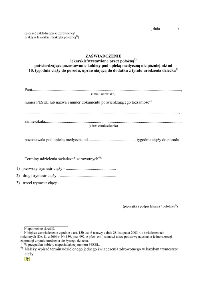 ...................................................... ................................, dnia ....... ..... r. (pieczęć zakładu opieki zdrowotnej/ praktyki lekarskiej/praktyki położnej1)) ZAŚWIADCZENIE lekarskie/wystawione przez położną1) potwierdzające pozostawanie kobiety pod opieką medyczną nie później niż od 10. tygodnia ciąży do porodu, uprawniającą do dodatku z tytułu urodzenia dziecka2) Pani..............................................................................................................................................., (imię i nazwisko) numer PESEL lub nazwa i numer dokumentu potwierdzającego tożsamość3) ...................................................................................................................................................., zamieszkała:.................................................................................................................................. (adres zamieszkania) pozostawała pod opieką medyczną od ............................................. tygodnia ciąży do porodu. Terminy udzielenia świadczeń zdrowotnych4): 1) pierwszy trymestr ciąży - ................................................ 2) drugi trymestr ciąży - ...................................................... 3) trzeci trymestr ciąży - ..................................................... ..................................................... (pieczątka i podpis lekarza / położnej 1)) _________________________ Niepotrzebne skreślić. 2) Niniejsze zaświadczenie zgodnie z art. 15b ust. 6 ustawy z dnia 28 listopada 2003 r. o świadczeniach rodzinnych (Dz. U. z 2006 r. Nr 139, poz. 992, z późn. zm.) stanowi także podstawę uzyskania jednorazowej zapomogi z tytułu urodzenia się żywego dziecka. 3) W przypadku kobiety nieposiadającej numeru PESEL. 1) 4) Należy wpisać termin udzielonego jednego świadczenia zdrowotnego w każdym trymestrze ciąży.