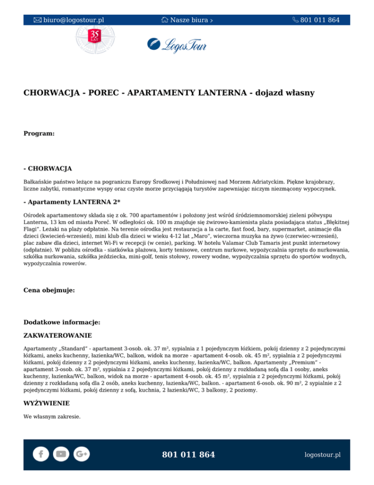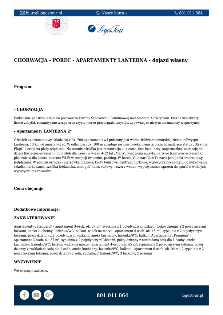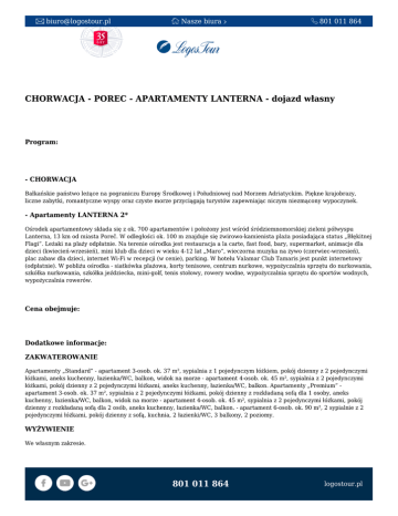 [email protected] Nasze biura 801 011 864 CHORWACJA - POREC - APARTAMENTY LANTERNA - dojazd własny Program: - CHORWACJA Bałkańskie państwo leżące na pograniczu Europy Środkowej i Południowej nad Morzem Adriatyckim. Piękne krajobrazy, liczne zabytki, romantyczne wyspy oraz czyste morze przyciągają turystów zapewniając niczym niezmącony wypoczynek. - Apartamenty LANTERNA 2* Ośrodek apartamentowy składa się z ok. 700 apartamentów i położony jest wśród śródziemnomorskiej zieleni półwyspu Lanterna, 13 km od miasta Poreč. W odległości ok. 100 m znajduje się żwirowo-kamienista plaża posiadająca status „Błękitnej Flagi”. Leżaki na plaży odpłatnie. Na terenie ośrodka jest restauracja a la carte, fast food, bary, supermarket, animacje dla dzieci (kwiecień-wrzesień), mini klub dla dzieci w wieku 4-12 lat „Maro”, wieczorna muzyka na żywo (czerwiec-wrzesień), plac zabaw dla dzieci, internet Wi-Fi w recepcji (w cenie), parking. W hotelu Valamar Club Tamaris jest punkt internetowy (odpłatnie). W pobliżu ośrodka - siatkówka plażowa, korty tenisowe, centrum nurkowe, wypożyczalnia sprzętu do nurkowania, szkółka nurkowania, szkółka jeździecka, mini-golf, tenis stołowy, rowery wodne, wypożyczalnia sprzętu do sportów wodnych, wypożyczalnia rowerów. Cena obejmuje: Dodatkowe informacje: ZAKWATEROWANIE Apartamenty „Standard” - apartament 3-osob. ok. 37 m², sypialnia z 1 pojedynczym łóżkiem, pokój dzienny z 2 pojedynczymi łóżkami, aneks kuchenny, łazienka/WC, balkon, widok na morze - apartament 4-osob. ok. 45 m², sypialnia z 2 pojedynczymi łóżkami, pokój dzienny z 2 pojedynczymi łóżkami, aneks kuchenny, łazienka/WC, balkon. Apartamenty „Premium” apartament 3-osob. ok. 37 m², sypialnia z 2 pojedynczymi łóżkami, pokój dzienny z rozkładaną sofą dla 1 osoby, aneks kuchenny, łazienka/WC, balkon, widok na morze - apartament 4-osob. ok. 45 m², sypialnia z 2 pojedynczymi łóżkami, pokój dzienny z rozkładaną sofą dla 2 osób, aneks kuchenny, łazienka/WC, balkon. - apartament 6-osob. ok. 90 m², 2 sypialnie z 2 pojedynczymi łóżkami, pokój dzienny z sofą, kuchnia, 2 łazienki/WC, 3 balkony, 2 poziomy. WYŻYWIENIE We własnym zakresie. 801 011 864 logostour.pl [email protected] Nasze biura 801 011 864 TRANSPORT dojazd własny TERMINY Turnusy tygodniowe od soboty do soboty w okresie od czerwca do września CENY W PLN za apartament bez wyżywienia, za turnus tygodniowy. WARUNKI PLATNOŚCI 30% zaliczki przy podpisaniu umowy, dopłata do 100% na 21 dni przed wyjazdem. UBIEZPIECZENIE Obowiązkowe Signal Iduna NW (7000 PLN), KL (15 000 EUR), dodatkowo płatne 25 PLN/osoba. INNE Opłata klimatyczna, udział w imprezach sportowych (animacje) i konkursach w cenie. Parking płatny dodatkowo 1 EUR/dziennie. Terminy: 801 011 864 logostour.pl