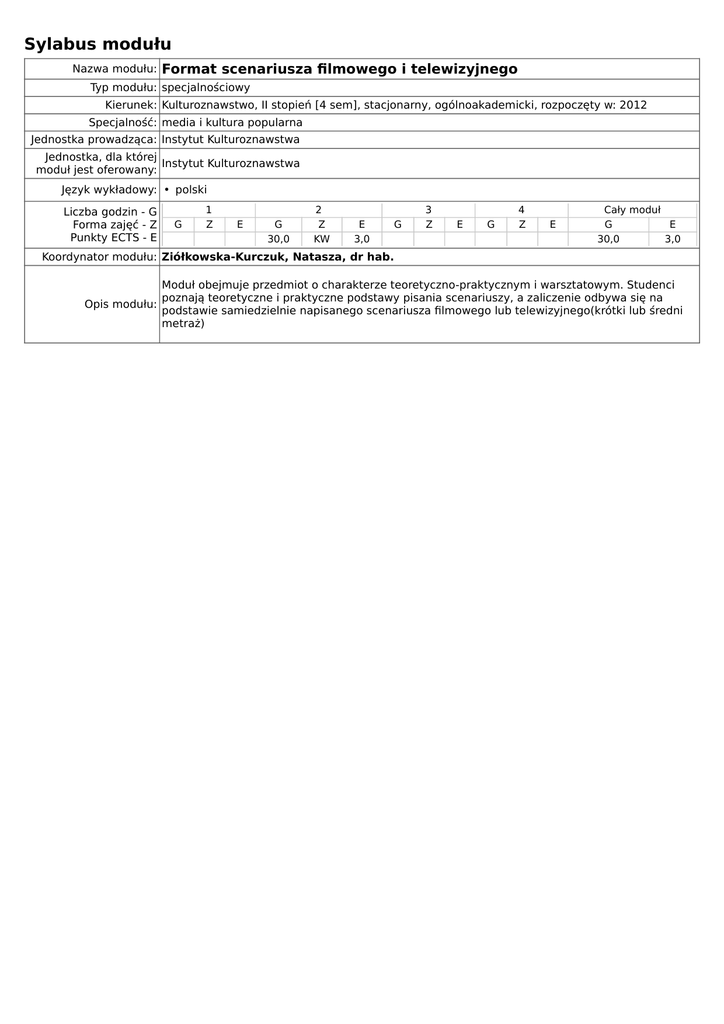 Sylabus modułu Nazwa modułu: Format scenariusza filmowego i telewizyjnego Typ modułu: specjalnościowy Kierunek: Kulturoznawstwo, II stopień [4 sem], stacjonarny, ogólnoakademicki, rozpoczęty w: 2012 Specjalność: media i kultura popularna Jednostka prowadząca: Instytut Kulturoznawstwa Jednostka, dla której Instytut Kulturoznawstwa moduł jest oferowany: Język wykładowy: • polski Liczba godzin - G Forma zajęć - Z Punkty ECTS - E G 1 Z E G 30,0 2 Z KW E 3,0 G 3 Z E G 4 Z E Cały moduł G E 30,0 3,0 Koordynator modułu: Ziółkowska-Kurczuk, Natasza, dr hab. Moduł obejmuje przedmiot o charakterze teoretyczno-praktycznym i warsztatowym. Studenci poznają teoretyczne i praktyczne podstawy pisania scenariuszy, a zaliczenie odbywa się na Opis modułu: podstawie samiedzielnie napisanego scenariusza filmowego lub telewizyjnego(krótki lub średni metraż) Wstępne wymagania: Student musi wykazać się średnio zaawansowana wiedzą na temat historii i teorii filmu, posiadać umiejętności analizy i interpretowania dzieła filmowego oraz wykazywać aktywne zainteresowanie współczesna sztuka filmową. Student powinien również przedstawić próby w zakresie pisania tekstów literackich i dziennikarskich, scenariuszy filmowych, sztuk teatralnych i innych. Pożądane jest również amatorskie czy też profesjonalne doświadczenie w zakresie sztuki filmowej i teatralnej, takie jak własne próby scenopisarskie, reżyserskie, czy też aktorskie. Tematy konwersatoriów: 1. 2. 3. 4. 5. 6. 7. 8. 9. 10. 11. 12. 13. 14. 15. Podstawy języka filmowego Analiza wybranej sceny filmowej pod względem narracji Filmowe sposoby narracji Struktura scenariusza filmowego Scenariusz filmu dokumentalnego Scenariusz formatu telewizyjnego Scenariusz a gatunek filmowy Dokumentacja scenariuszowa Podstawy dramaturgii Adaptacja tekstu literackiego Budowanie postaci filmowej Budowanie konfliktu Konstruowanie sceny filmowej Scenopis i storyboardy Analiza prac scenopisarskich studentów Literatura podstawowa: 1. Karabasz Kazimierz, Odczytać czas, Łódź, PWSFTviT 2009. 2. Kędzielawska Grażyna, Przewodnik dokumentalisty. Podstawy warsztatu, Wydawnictwo Dodatkowe informacje: Biblioteki PWSFTviT, Łódź 2012. 3. Królikiewicz Grzegorz, Różyczka. Próba analizy filmu Orsona Wellesa "Obywatel Kane", Wydawnictwo Biblioteki, Łódź PWSFTviT 2012. 4. Płażewski J., Język filmu, Książka i Wiedza, Warszawa 2008. 5. Russin Robin U., Downs William Missouri, Jak napisać scenariusz filmowy, Wydawnictwo Marzec, Warszawa 2005. 6. Schabenbeck Martin, Format scenariusza filmowego, Wydawnictwo Marzec, Warszawa 2008. 7. Żyto Kamila, Strategie labiryntowe w filmie fikcji , Wydawnictwo Uniwersytetu Łódzkiego, Łódź 2010. Literatura uzupełniająca: 1. Arijon Daniel, Gramatyka języka filmowego, Wydawnictwo Wojciech Marzec, Warszawa 2008. 2. Bergman Ingmar, Scenariusze, Wydawnictwa Artystyczne i Filmowe 1987. 3. Brylski Ryszard, Żurek. Między wierszami, czyli adaptacja nietypowa , Wydawnictwo Biblioteki PWSFTviT, Łódź 2011. 4. Katz Steven D., Reżyseria filmowa ujęcie po ujęciu”, Fundacja Edukacji i Sztuki Filmowej Macieja Ślesickiego i Bogusława Lindy, Laterna Magica. Warszawa 2007. 5. Kuźniak Henryk, Analiza strukturalna obrazu filmowego. Punkt wyjścia dla ukształtowania warstwy dźwiękowej filmu, PWSFTviT, Łódź 2011. 6. Przedpełska-Bieniek Małgorzata, Dźwięk w filmie, Wydawnictwo Sonoria, Warszawa 2006. 7. Zonn Lidia, Wokół montażu, PWSFTviT, Łódź 2001. Metody nauczania: konwersatorium połączone z prezentacją fragmentów wybranych filmów. Ćwiczenia praktyczne w zakresie pisania scenariuszy. Zaliczenie: przedmiot kończy się ustnym zaliczeniem w formie pitchingu, podczas którego student prezentuje autorski scenariusz filmu fabularnego lub dokumentalnego o czasie trwania od 15 do 30 minut. Wykonuje też bieżące ćwiczenia scenopisarskie, które mogą stać się podstawą do napisania scenariusza zaliczeniowego. Tematy ćwiczeń:„Bohater”, „Zamknięta przestrzeń”, „Pierwsze zdanie”, „Ciemność”, „Światło”, „Bez słów”, „W potrzasku”, „Pościg” i inne. 01 Ma pogłębioną, szczegółową wiedzę dotyczącą współczesnych mediów oraz ich wpływu na życie społeczne i kulturę; zna i rozumie specyfikę powiązań pomiędzy nauką o nowych mediach a innymi dziedzinami nauki i dyscyplinami naukowymi odnoszącymi się do badań nad kulturą, dostrzega interdyscyplinarny charakter badań nad problematyką mediów współczesnych; ma uporządkowaną wiedzę dotyczącą roli i znaczenia filmu w kulturze współczesnej, a także o wykorzystywaniu różnego rodzaju mediów współczesnych w działaniach na polu sztuki, zna metody analizy i interpretacji wytworów kultury na polu nowych mediów, zna i rozumie podstawowe pojęcia i zasady z zakresu prawa autorskiego i ochrony własności intelektualnej w kontekście rozwoju i społecznego funkcjonowania nowych mediów. 02 Potrafi współdziałać i pracować w grupie, zarówno w czasie zajęć jak i poza nimi podczas Modułowe efekty przygotowywania projektów, przyjmując w niej różne role. kształcenia: 03 Posiada pogłębione umiejętności w zakresie zdobywania i analizowania informacji z wykorzystaniem różnych źródeł, odnoszących się do szeroko rozumianej problematyki kulturowej w odniesieniu do wytworów współczesnych mediów. Potrafi przeprowadzić krytyczną analizę i interpretację różnych rodzajów wytworów kultury (film, sztuki intermedialne, teksty kultury popularnej). Posiada umiejętność formułowania opinii krytycznych o wytworach kultury na podstawie posiadanej wiedzy zdobytej w toku studiów oraz umiejętność prezentacji opracowań krytycznych (np. recenzje) w różnych formach i w różnych mediach. 04 Interesuje się aktualnymi wydarzeniami kulturalnymi, nowatorskimi formami wyrazu artystycznego i nowymi zjawiskami w sztuce i kulturze. Dostrzega relacje między 