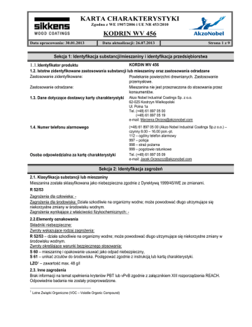 KARTA CHARAKTERYSTYKI Zgodna z WE 1907/2006 i UE NR 453/2010 KODRIN WV 456 Data opracowania: 30.01.2013 Data aktualizacji: 26.07.2013 Strona 1 z 9 Sekcja 1: Identyfikacja substancji/mieszaniny i identyfikacja przedsiębiorstwa KORDIN WV 456 1.2. Istotne zidentyfikowane zastosowania substancji lub mieszaniny oraz zastosowania odradzane Zastosowanie zidentyfikowane: Powlekanie powierzchni drewnianych. Zastosowanie przemysłowe. Zastosowanie odradzane: Mieszanina nie jest przeznaczona do stosowania przez konsumentów. 1.3. Dane dotyczące dostawcy karty charakterystyki Akzo Nobel Industrial Coatings Sp. z o.o. 1.1.Identyfikator produktu 62-025 Kostrzyn Wielkopolski Ul. Polna 1a Tel. (+48) 61 897 05 00 (+48) 61 897 05 19 e-mail: [email protected] 1.4. Numer telefonu alarmowego Osoba odpowiedzialna za kartę charakterystyki (+48) 61 897 05 00 (Akzo Nobel Industrial Coatings Sp.z o.o.) – czynny 8.00 – 16.00 pon.-pt. 112 – ogólny telefon alarmowy 997 – policja 998 – straż pożarna 999 – pogotowie ratunkowe Tel. (+48) 61 897 05 09 e-mail: [email protected] Sekcja 2: Identyfikacja zagrożeń 2.1. Klasyfikacja substancji lub mieszaniny Mieszanina została sklasyfikowana jako niebezpieczna zgodnie z Dyrektywą 1999/45/WE ze zmianami. R 52/53 Zagrożenia dla człowieka: Zagrożenia dla środowiska: Działa szkodliwie na organizmy wodne; może powodować długo utrzymujące się niekorzystne zmiany w środowisku wodnym. Zagrożenia wynikające z właściwości fizykochemicznych: 2.2.Elementy oznakowania Składniki niebezpieczne: Zwroty wskazujące rodzaj zagrożenia: R 52/53 – działa szkodliwie na organizmy wodne; może powodować długo utrzymujące się niekorzystne zmiany w środowisku wodnym. Zwroty określające warunki bezpiecznego stosowania: S 60 – mieszaninę i opakowanie usuwać jako odpad niebezpieczny, S 61 – unikać zrzutów do środowiska. Postępować zgodnie z instrukcją lub kartą charakterystyki. LZO1 – zawartość max. 48 g/l 2.3. Inne zagrożenia Brak informacji na temat spełnienia kryteriów PBT lub vPvB zgodnie z załącznikiem XIII rozporządzenia REACH. Odpowiednie badania nie zostały przeprowadzone. 1 Lotne Związki Organiczne (VOC – Volatile Organic Compound) KARTA CHARAKTERYSTYKI Zgodna z WE 1907/2006 i UE NR 453/2010 KODRIN WV 456 Data opracowania: 30.01.2013 Data aktualizacji: 26.07.2013 Strona 2 z 9 Sekcja 3: Skład/informacja o składnikach 3.1. Substancje Nie dotyczy. 3.2. Mieszaniny Nazwa substancji Nr identyfikacyjne Stężenie Klasyfikacja wg Klasyfikacja wg % Dyrektywy 67/548/EWG Rozporządzenia WE nr 1272/2008 (2metoksymetyloetoksy)propanol WE: 252-104-2 CAS:34590-94-8 1-5 Nie klasyfikowany. REACH:012119450011-60 2-etyloheksylo difenylofosforan WE: 214-987-2 0,25-2,5 N; R50/53 CAS:1241-94-7 Poli(oksy-1,2-etanodiyl).alfa.WE: hydro-.omega.-hydroksy-, eter CAS: 65545-80-4 .alfa.-fluoro-.omega.-(2<0,25 N; R51/53 hydroksyetylo)poli(difluorometyle n) (1:1) Pełna treść wszystkich istotnych zwrotów wskazujących zagrożenie znajduje się w rozdziale 16. Nie klasyfikowany. Aquatic Acute 1 H400 Aquatic Chronic 1 H410 Aquatic Chronic 2 H411 Sekcja 4: Środki pierwszej pomocy 4.1. Opis środków pierwszej pomocy W razie jakichkolwiek wątpliwości, lub jeżeli objawy nie ustępują, należy zasięgnąć pomocy lekarskiej. Nigdy nie podawać niczego doustnie osobie nieprzytomnej. W razie utraty przytomności, należy poszkodowanego ułożyć w pozycji stabilizowanej (położenie na boku) i uzyskać pomoc lekarską. Wdychanie: Wynieść na świeże powietrze. Zapewnić osobie ciepło i spokój. Jeżeli osoba nie oddycha, oddycha nieregularnie lub gdy oddychanie ustało, wykwalifikowany personel powinien wykonać sztuczne oddychanie lub podać tlen. Kontakt ze skórą: Zdjąć skażoną odzież i buty. Skórę należy myć dokładnie wodą z mydłem lub stosować sprawdzony środek do mycia skóry. NIE wolno używać rozpuszczalników ani rozcieńczalników. Kontakt z okiem: Usunąć szkła kontaktowe jeżeli są. Natychmiast przemywać oczy bieżącą wodą, przez co najmniej 15 minut przy otwartych powiekach. Należy natychmiast zwrócić się po pomoc lekarską. Spożycie: Po połknięciu skonsultować się natychmiast z lekarzem i pokazać opakowanie lub etykietę. Zapewnić osobie ciepło i spokój. Nie wywoływać wymiotów. 4.2. Najważniejsze ostre i opóźnione objawy oraz skutki narażenia Wdychanie: Opary rozpuszczalników wchodzących w skład mieszaniny, w stężeniach wyższych od najwyższego dopuszczalnego stężenia w miejscu pracy, mogą mieć ujemny wpływ na zdrowie powodując podrażnienie błon śluzowych i układu oddechowego, opary mogą wywierać także szkodliwy wpływ na nerki, wątrobę i centralny układ nerwowy. Objawy mogą obejmować ból głowy, zawroty głowy, zmęczenie, obniżenie siły mięśni, a w skrajnych przypadkach utratę przytomności. Spożycie: Połknięcie powoduje nudności, biegunkę i wymioty. Kontakt ze skórą: Składniki mieszaniny mogą po wchłonięciu przez skórę uszkodzić nerki, wątrobę i centralny układ nerwowy. Objawy mogą obejmować ból głowy, zawroty głowy, zmęczenie, obniżenie siły mięśni, a w skrajnych przypadkach utratę przytomności. Kontakt z okiem: Mieszanina w kontakcie z okiem może powodować podrażnienie i przejściowe uszkodzenia. Wielokrotny lub ciągły kontakt z tą mieszaniną, może powodować utratę naturalnych tłuszczów w skórze, co prowadzi do powstawania nie-alergicznych zapaleń kontaktowych i wchłaniania poprzez skórę. 4.3. Wskazania dotyczące wszelkiej natychmiastowej pomocy lekarskiej i szczególnego postępowania z poszkodowanym Wskazania dla lekarza: Leczyć objawowo. W przypadku połknięcia lub wdychania dużej ilości, natychmiast KARTA CHARAKTERYSTYKI Zgodna z WE 1907/2006 i UE NR 453/2010 KODRIN WV 456 Data opracowania: 30.01.2013 Data aktualizacji: 26.07.2013 Strona 3 z 9 skontaktować się z lekarzem specjalizującym się w lecze