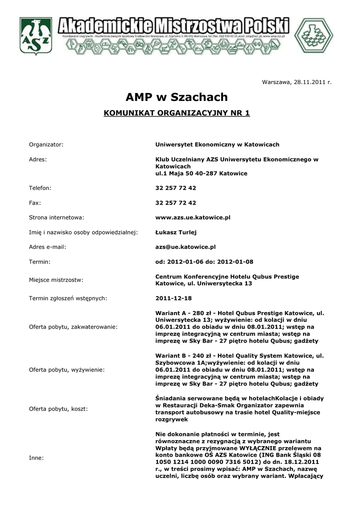 Warszawa, 28.11.2011 r. AMP w Szachach KOMUNIKAT ORGANIZACYJNY NR 1 Organizator: Uniwersytet Ekonomiczny w Katowicach Adres: Klub Uczelniany AZS Uniwersytetu Ekonomicznego w Katowicach ul.1 Maja 50 40-287 Katowice Telefon: 32 257 72 42 Fax: 32 257 72 42 Strona internetowa: www.azs.ue.katowice.pl Imię i nazwisko osoby odpowiedzialnej: Łukasz Turlej Adres e-mail: [email protected] Termin: od: 2012-01-06 do: 2012-01-08 Miejsce mistrzostw: Centrum Konferencyjne Hotelu Qubus Prestige Katowice, ul. Uniwersytecka 13 Termin zgłoszeń wstępnych: 2011-12-18 Oferta pobytu, zakwaterowanie: Wariant A - 280 zł - Hotel Qubus Prestige Katowice, ul. Uniwersytecka 13; wyżywienie: od kolacji w dniu 06.01.2011 do obiadu w dniu 08.01.2011; wstęp na imprezę integracyjną w centrum miasta; wstęp na imprezę w Sky Bar - 27 piętro hotelu Qubus; gadżety Oferta pobytu, wyżywienie: Wariant B - 240 zł - Hotel Quality System Katowice, ul. Szybowcowa 1A;wyżywienie: od kolacji w dniu 06.01.2011 do obiadu w dniu 08.01.2011; wstęp na imprezę integracyjną w centrum miasta; wstęp na imprezę w Sky Bar - 27 piętro hotelu Qubus; gadżety Oferta pobytu, koszt: Śniadania serwowane będą w hotelachKolacje i obiady w Restauracji Deka-Smak Organizator zapewnia transport autobusowy na trasie hotel Quality-miejsce rozgrywek Inne: Nie dokonanie płatności w terminie, jest równoznaczne z rezygnacją z wybranego wariantu Wpłaty będą przyjmowane WYŁĄCZNIE przelewem na konto bankowe OŚ AZS Katowice (ING Bank Śląski 08 1050 1214 1000 0090 7316 5012) do dn. 18.12.2011 r., w treści prosimy wpisać: AMP w Szachach, nazwę uczelni, liczbę osób oraz wybrany wariant. Wpłacający zobowiązany jest do przesłania danych do faktury na adres: [email protected] z informacją o wybranym wariancie, w terminie do 18.12.2011 r Wszystkie informacje na temat Mistrzostw znajdują się na stronie www.amp.katowice.pl Funkcja / imię i nazwisko organizatora: Prezes KU AZS UE Katowice Artur Główka