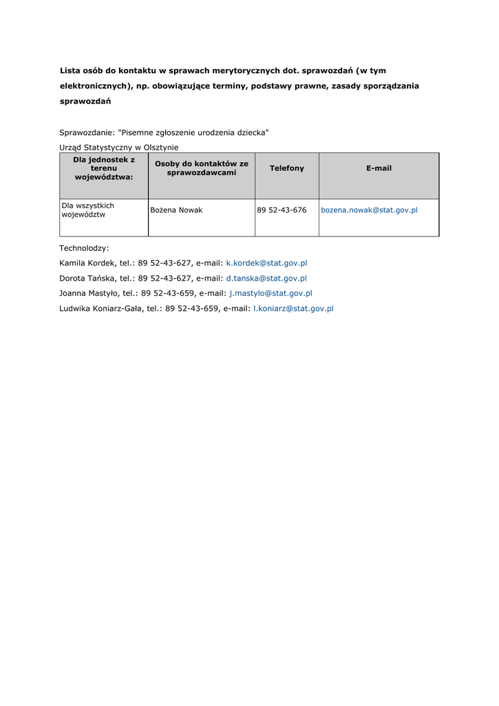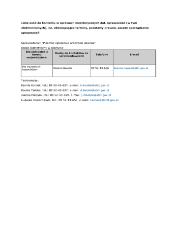 Lista osób do kontaktu w sprawach merytorycznych dot. sprawozdań (w tym elektronicznych), np. obowiązujące terminy, podstawy prawne, zasady sporządzania sprawozdań Sprawozdanie: "Pisemne zgłoszenie urodzenia dziecka" Urząd Statystyczny w Olsztynie Dla jednostek z terenu województwa: Dla wszystkich województw Osoby do kontaktów ze sprawozdawcami Bożena Nowak Telefony 89 52-43-676 E-mail [email protected] Technolodzy: Kamila Kordek, tel.: 89 52-43-627, e-mail: [email protected] Dorota Tańska, tel.: 89 52-43-627, e-mail: [email protected] Joanna Mastyło, tel.: 89 52-43-659, e-mail: [email protected] Ludwika Koniarz-Gała, tel.: 89 52-43-659, e-mail: [email protected]