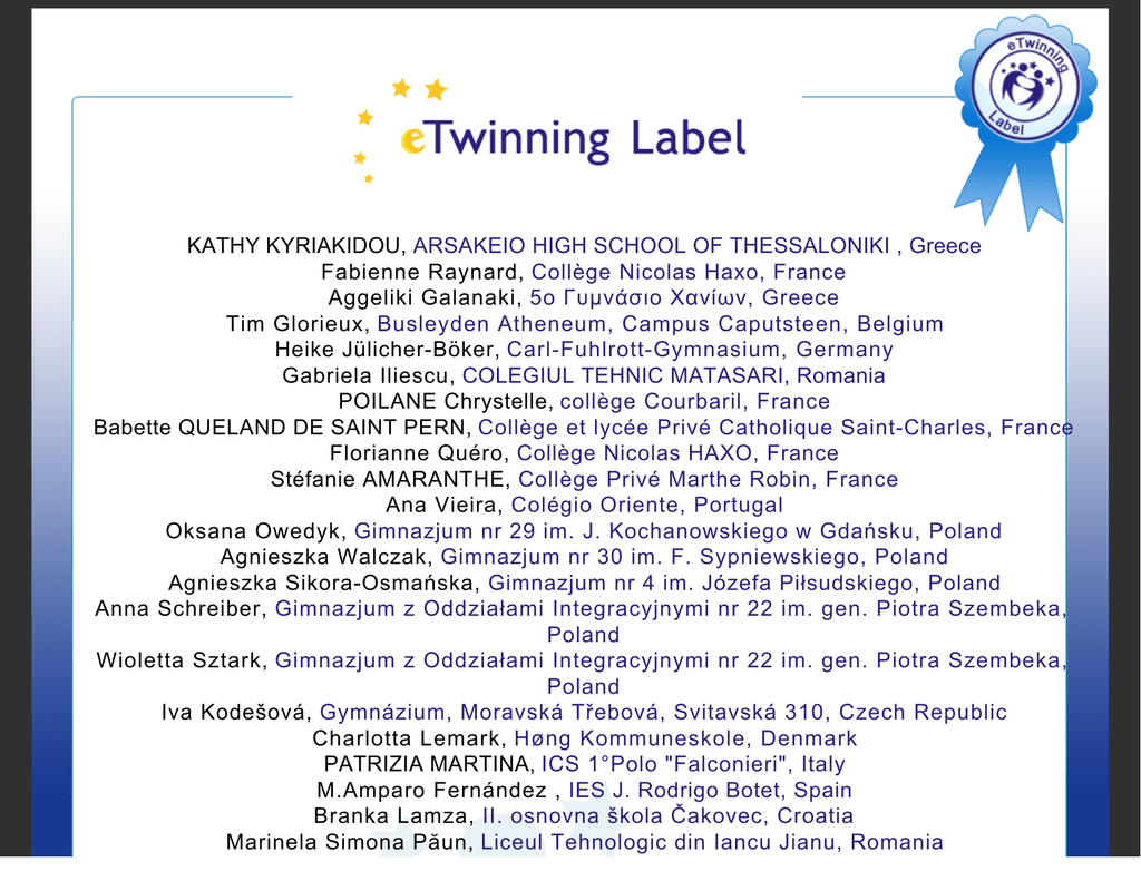 KATHY KYRIAKIDOU, ARSAKEIO HIGH SCHOOL OF THESSALONIKI , Greece Fabienne Raynard, Collège Nicolas Haxo, France Aggeliki Galanaki, 5ο Γυμνάσιο Χανίων, Greece Tim Glorieux, Busleyden Atheneum, Campus Caputsteen, Belgium Heike Jülicher-Böker, Carl-Fuhlrott-Gymnasium, Germany Gabriela Iliescu, COLEGIUL TEHNIC MATASARI, Romania POILANE Chrystelle, collège Courbaril, France Babette QUELAND DE SAINT PERN, Collège et lycée Privé Catholique Saint-Charles, France Florianne Quéro, Collège Nicolas HAXO, France Stéfanie AMARANTHE, Collège Privé Marthe Robin, France Ana Vieira, Colégio Oriente, Portugal Oksana Owedyk, Gimnazjum nr 29 im. J. Kochanowskiego w Gdańsku, Poland Agnieszka Walczak, Gimnazjum nr 30 im. F. Sypniewskiego, Poland Agnieszka Sikora-Osmańska, Gimnazjum nr 4 im. Józefa Piłsudskiego, Poland Anna Schreiber, Gimnazjum z Oddziałami Integracyjnymi nr 22 im. gen. Piotra Szembeka, Poland Wioletta Sztark, Gimnazjum z Oddziałami Integracyjnymi nr 22 im. gen. Piotra Szembeka, Poland Iva Kodešová, Gymnázium, Moravská Třebová, Svitavská 310, Czech Republic Charlotta Lemark, Høng Kommuneskole, Denmark PATRIZIA MARTINA, ICS 1°Polo "Falconieri", Italy M.Amparo Fernández , IES J. Rodrigo Botet, Spain Branka Lamza, II. osnovna škola Čakovec, Croatia Marinela Simona Păun, Liceul Tehnologic din Iancu Jianu, Romania EMILIE MOISAN, Lycée professionnel Marcel Dassault, France EMILIE MOISAN, Lycée professionnel Marcel Dassault, France Nataša Grčar, Osnovna šola Miška Kranjca, Slovenia Darja Smole, OŠ Rudolfa Maistra Šentilj, Slovenia Tina Ipavec, OŠ Šmarje pri Jelšah, Slovenia Tigna Podniece, Palsmanes pamatskola, Latvia Agata Sudyka, Publiczne Gimnazjum nr 1 im. Jana Pawła II w Pcimiu, Poland Małgorzata Sarnowska, Publiczne Gimnazjum nr 3 im. Stanisława Staszica, Poland Ewa Stępień, Samorządowy Zespół Szkół Nr 1, Poland Anca Cecilia Belascu, SCOALA "ION AGARBICEANU", Romania Anna Torino, Scuola Secondaria Statale di I Grado "Fresa-Pascoli", Italy Annika Rottinghaus, Städtisches Gymnasium Velbert-Langenberg, Germany Teresa Cupriak, Szkoła Podstawowa nr 30, Poland Julia Kokot, Szkoła Podstawowa nr 36, Poland Lisbeth Bank-Kodal, Sønderrisskolen, Denmark Edita Kvietkute, Tauragės r. Žygaičių gimnazija, Lithuania Torunn Gabrielsen, Vannvåg skole, Norway Magdalena Goc, Zespół Szkół Szkoła Podstawowa im. K. Odnowiciela i Gimnazjum w Pobiedziskach, Poland Sylwia Andrzejak, Zespół Szkół w Sławsku, Poland Alena Rapavá, Základná škola Sľažany, Slovakia Jana Blábolilová, Základní škola Louny, Školní 2426, Czech Republic Petra Mančíková, ZŠ Jindřicha Matiegky, p.o., Czech Republic were awarded the Label for their project: HOMEMADE POSTCARDS FOR THE EUROPEAN DAY OF LANGUAGES 19.08.2015 Marie-Christine Clément-Bonhomme Dr. Michael Paraskevas National Support Service France Marc Durando Central Support Service National Support Service Greece