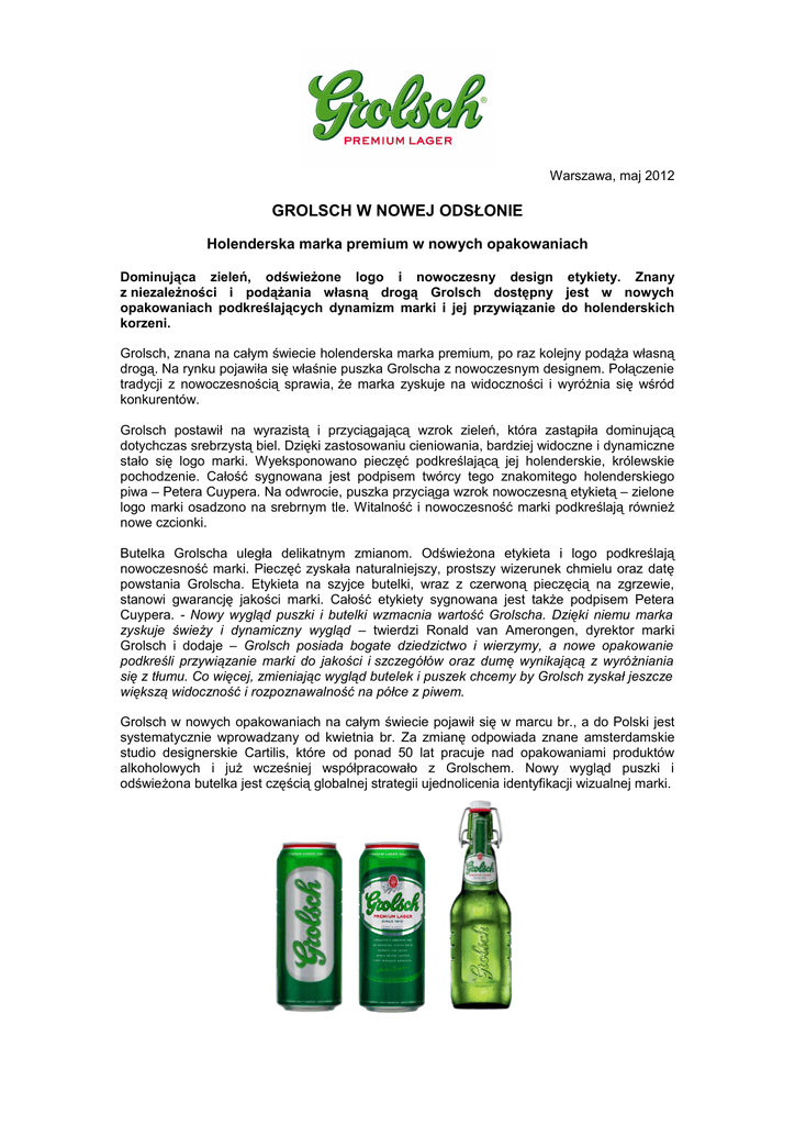 Warszawa, maj 2012 GROLSCH W NOWEJ ODSŁONIE Holenderska marka premium w nowych opakowaniach Dominująca zieleń, odświeżone logo i nowoczesny design etykiety. Znany z niezależności i podążania własną drogą Grolsch dostępny jest w nowych opakowaniach podkreślających dynamizm marki i jej przywiązanie do holenderskich korzeni. Grolsch, znana na całym świecie holenderska marka premium, po raz kolejny podąża własną drogą. Na rynku pojawiła się właśnie puszka Grolscha z nowoczesnym designem. Połączenie tradycji z nowoczesnością sprawia, że marka zyskuje na widoczności i wyróżnia się wśród konkurentów. Grolsch postawił na wyrazistą i przyciągającą wzrok zieleń, która zastąpiła dominującą dotychczas srebrzystą biel. Dzięki zastosowaniu cieniowania, bardziej widoczne i dynamiczne stało się logo marki. Wyeksponowano pieczęć podkreślającą jej holenderskie, królewskie pochodzenie. Całość sygnowana jest podpisem twórcy tego znakomitego holenderskiego piwa – Petera Cuypera. Na odwrocie, puszka przyciąga wzrok nowoczesną etykietą – zielone logo marki osadzono na srebrnym tle. Witalność i nowoczesność marki podkreślają również nowe czcionki. Butelka Grolscha uległa delikatnym zmianom. Odświeżona etykieta i logo podkreślają nowoczesność marki. Pieczęć zyskała naturalniejszy, prostszy wizerunek chmielu oraz datę powstania Grolscha. Etykieta na szyjce butelki, wraz z czerwoną pieczęcią na zgrzewie, stanowi gwarancję jakości marki. Całość etykiety sygnowana jest także podpisem Petera Cuypera. - Nowy wygląd puszki i butelki wzmacnia wartość Grolscha. Dzięki niemu marka zyskuje świeży i dynamiczny wygląd – twierdzi Ronald van Amerongen, dyrektor marki Grolsch i dodaje – Grolsch posiada bogate dziedzictwo i wierzymy, a nowe opakowanie podkreśli przywiązanie marki do jakości i szczegółów oraz dumę wynikającą z wyróżniania się z tłumu. Co więcej, zmieniając wygląd butelek i puszek chcemy by Grolsch zyskał jeszcze większą widoczność i rozpoznawalność na półce z piwem. Grolsch w nowych opakowaniach na całym świecie pojawił się w marcu br., a do Polski jest systematycznie wprowadzany od kwietnia br. Za zmianę odpowiada znane amsterdamskie studio designerskie Cartilis, które od ponad 50 lat pracuje nad opakowaniami produktów alkoholowych i już wcześniej współpracowało z Grolschem. Nowy wygląd puszki i odświeżona butelka jest częścią globalnej strategii ujednolicenia identyfikacji wizualnej marki. Więcej na: www.grolsch.pl oraz http://www.facebook.com/Grolsch.Polska *** Grolsch. Idziesz własną drogą? Grolsch to wyjątkowa, marka piwa dla ludzi niezależnych duchem, podążających własną drogą, którzy doceniają nie tylko jego wyśmienity smak ale przede wszystkim jego oryginalność i zaangażowanie. Grolsch powstaje w jednym z najnowocześniejszych i najbardziej ekologicznych browarów w Europie, w holenderskim mieście Enschede. Swój doskonały smak zawdzięcza unikalnej technice warzenia w niskiej temperaturze. Grolsch to najwyższej jakości holenderskie piwo typu lager, zawierające 5% alkoholu i 11,3% ekstraktu. Najlepiej smakuje podawane w temperaturze 6-8 C. Grolsch to marka dystrybuowana przez Kompanię Piwowarską od sierpnia 2009 roku. Grolsch w Polsce patronuje niezależnym wydarzeniom artystycznym, angażując się także w działania, których celem jest wspieranie niestandardowego sposobu myślenia. Kompania Piwowarska - Lider branży piwowarskiej w Polsce Kompania Piwowarska jest największym przedsiębiorstwem piwowarskim w Polsce. Kilkusetletnie doświadczenia w warzeniu piwa, nowoczesne technologie i rygorystyczne przestrzeganie zasad produkcji na światowym poziomie gwarantują najwyższą jakość naszych produktów. Do portfela marek KP należą najpopularniejsze polskie piwa m.in. Tyskie, Żubr, Lech, Dębowe Mocne, Redd's, a także międzynarodowe marki premium: Pilsner Urquell, Grolsch oraz Peroni Nastro Azzurro. Kompania Piwowarska (utworzona w 1999 roku) posiada trzy browary (w Tychach, Poznaniu i Białymstoku) oraz czternaście oddziałów handlowych na terenie całego kraju. Kompania Piwowarska prowadzi także działalność społeczną nastawioną na walkę z wykluczeniem społecznym na tle ubóstwa oraz programy edukacyjne popularyzujące odpowiedzialność i umiar w konsumowaniu alkoholu. Wielkość sprzedaży osiągniętej przez KP w roku finansowym zakończonym 31 marca 2010 r. wyniosła 14,6 mln hektolitrów piwa. SABMiller – jeden z największych na świecie producentów piwa Kompania Piwowarska jest częścią jednego z największych na świecie producentów piwa - SABMiller plc. Grupa produkuje lub dystrybuuje piwo na sześciu kontynentach, a jej ogólnoświatowy portfel obejmuje międzynarodowe piwa premium, takie jak Grolsch, Miller Genuine Draft, Peroni Nastro Azzurro czy Pilsner Urquell oraz czołowe marki lokalne, takie jak Aquila, Castle, Miller Lite, Snow czy Tyskie. SABMiller jest jedną z największych na świecie (poza USA) firm rozlewających produkty Coca-Coli. W roku finansowym zakończonym 31 marca 2009 SABMiller osiągnął przychody w wysokości 25,3 mld USD oraz wypracował zysk brutto w wysokości 3,4 mld USD. SABMiller plc jest notowany na giełdach papierów wartościowych w Londynie i Johannesburgu. Dodatkowych informacji udzielają: Agata KALIŃSKA Senior PR Consultant RACZKIEWICZ CHENCZKE CONSULTANTS (RC2) [email protected] tel. + 48 22 43 511 60 tel. + 48 507 000 833 fax + 48 22 43 511 70 Tomasz KANTON Kierownik ds. PR marek KOMPANIA PIWOWARSKA S.A. [email protected] Tel. +48 61 87 87 776 Fax. +48 61 87 87 850 Tel. Kom. +48 695 592 651