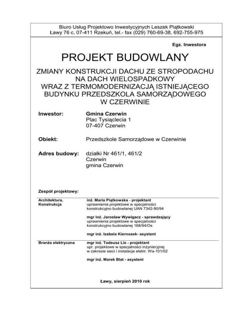 Biuro Usług Projektowo Inwestycyjnych Leszek Piątkowski Ławy 76 c, 07-411 Rzekuń, tel.- fax (029) 760-69-38, 692-755-975 Egz. Inwestora PROJEKT BUDOWLANY ZMIANY KONSTRUKCJI DACHU ZE STROPODACHU NA DACH WIELOSPADKOWY WRAZ Z TERMOMODERNIZACJĄ ISTNIEJĄCEGO BUDYNKU PRZEDSZKOLA SAMORZĄDOWEGO W CZERWINIE Inwestor: Gmina Czerwin Plac Tysiąclecia 1 07-407 Czerwin Obiekt: Przedszkole Samorządowe w Czerwinie Adres budowy: działki Nr 461/1, 461/2 Czerwin gmina Czerwin Zespół projektowy: Architektura, Konstrukcja inŜ. Maria Piątkowska - projektant uprawnienia projektowe w specjalności konstrukcyjno budowlanej UAN 7342-90/94 mgr inŜ. Jarosław Wywigacz - sprawdzający uprawnienia projektowe w specjalności konstrukcyjno budowlanej 168/94/Os mgr inŜ. Izabela Kiernozek- asystent BranŜa elektryczna mgr inŜ. Tadeusz Lis - projektant upr. projektowe w specjalności inŜynieryjnej w zakresie sieci i instalacje elektr. Wa-101/02 mgr inŜ. Marek Blat - asystent Ławy, sierpień 2010 rok Inwestor: Gmina Czerwin Adres budowy: działka nr 461/1, 461/2, Czerwin, gm. Czerwin Zawartość opracowania 1. Materiały formalno – prawne - Mapa do celów projektowych w skali 1:500 2 - Decyzja o ustaleniu warunków zabudowy 3 2. Część opisowa i rysunkowa projektu Opis techniczny do projektu zagospodarowania działki - Rys. nr 1 - Projekt zagospodarowania działki 9 skala 1:500 Opis techniczny do projektu budowlanego 10 11 Inwentaryzacja - Rys. nr 2 – Elewacje skala 1:100 21 - Rys. nr 3 – Elewacje skala 1:100 22 - Rys. nr 4 – Elewacje skala 1:100 23 - Rys. nr 5 – Elewacje skala 1:100 24 - Rys. nr 6 – Rzut dachu skala 1:100 25 Projekt - Rys. nr 7 – Rzut więźby dachowej skala 1:100 26 - Rys. nr 8 – Rzut dachu skala 1:100 27 - Rys. nr 9 – Przekrój pionowy A-A skala 1:100 28 - Rys. nr 10 – Przekrój pionowy B-B - Rys. nr 11 - Elewacja północna skala 1:100 30 - Rys. nr 12 – Elewacja wschodnia skala 1:100 31 - Rys. nr 13 – Elewacja południowa skala 1:100 32 - Rys. nr 14 – Elewacja zachodnia skala 1:100 33 - Rys. nr 15 – 23 Detale szkice 42 skala 1:100 29 3. Oświadczenie 43 4. Informacja dotycząca bezpieczeństwa i ochrony zdrowia 44 Biuro Usług Projektowo – Inwestycyjnych Leszek Piątkowski, Ławy 76 c, 07-411 Rzekuń, tel. fax (0-29) 760-69-38 Inwestor: Gmina Czerwin Adres budowy: działka nr 461/1, 461/2, Czerwin, gm. Czerwin OPIS TECHNICZNY DO PROJEKTU ZAGOSPODAROWANIA DZIAŁKI 1. Przedmiot opracowania: projekt zagospodarowania działki nr 461/1, 461/2 w Czerwinie. 2. Inwestor: Gmina Czerwin, 07-407 Czerwin, Plac 1000-lecia 1 3. Adres budowy: działka nr 461/1, 461/2, Czerwin gmina Czerwin. 4. Podstawa opracowania: - materiały formalno-prawne, - uzgodnienia z Inwestorem. 5. Opis ogólny zagospodarowania terenu Zgodnie z decyzją Nr 42/10 o ustaleniu warunków zabudowy wydaną przez Wójta Gminy Czerwin, z dnia 10.08.2010r., działki nr 461/1, 461/2 połoŜone są we wsi Czerwin, gmina Czerwin. Jest to teren istniejącej zabudowy oświaty. Teren całkowicie jest zagospodarowany. Inwestycja polega na zmianie konstrukcji dachu ze stropodachu na dach wielospadkowy wraz z termomodernizacją istniejącego budynku Przedszkola Samorządowego w Czerwinie. Projektowane prace dotyczą istniejących budynków oświatowych zrealizowanych na działce nr 461/1, 461/2. Nie projektuje się zmian w stosunku do istniejącego zagospodarowania działki. Działka usytuowana jest przy ulicy Parkowej nr geod. 463. Działka jest ogrodzona i zabudowana. W zakresie infrastruktury technicznej – zaopatrzenie istniejące. Na działce usytuowane jest przedszkole wraz z placem zabaw, chodnikami, terenem zielonym. Wjazd na teren działki istniejący. Budynek wyposaŜony jest w urządzenia infrastruktury technicznej. Bilans powierzchni terenu bez zmian. Projektowany budynek nie znajduje się w strefie ochrony konserwatorskiej. Projektowany budynek nie stwarza zagroŜenia dla środowiska oraz higieny i zdrowia uŜytkowników jak teŜ ich otoczenia w zakresie zgodnym z przepisami odrębnymi. Biuro Usług Projektowo – Inwestycyjnych Leszek Piątkowski, Ławy 76 c, 07-411 Rzekuń, tel. fax (0-29) 760-69-38 Inwestor: Gmina Czerwin Adres budowy: działka nr 461/1, 461/2, Czerwin, gm. Czerwin OPIS TECHNICZNY DO PROJEKTU BUDOWLANEGO 1. Przedmiot opracowania: projekt budowlany zmiany konstrukcji dachu na dach wielospadkowy wraz z termomodernizacją istniejącego budynku przedszkola w Czerwinie 2. Inwestor: Gmina Czerwin, 07-407 Czerwin, Plac 1000-lecia 1 3. Adres budowy: działka nr 461/1, 461/2, Czerwin, gmina Czerwin. 4. Podstawa opracowania: - materiały formalno-prawne, - inwentaryzacja skrócona, - uzgodnienia z Inwestorem. I. DANE OGÓLNE 1. Przedmiot opracowania: Przedmiotem opracowania jest projekt budowlany zmiany konstrukcji dachu na dach wielospadkowy wraz z termomodernizacją istniejącego budynku przedszkola w Czerwinie. Zakres robót obejmuje: docieplenie ścian zewnętrznych, zmianę konstrukcji dachu z płaskiego na wielospadkowy i wykonanie ocieplenia, wybór tynku i kolorystykę elewacji. 2. Podstawa opracowania: umowa z Inwestorem wizja lokalna i wykonana w lipcu 2010 roku inwentaryzacja budowlana. Obowiązujące normy i przepisy prawne Uzgodnienia z inwestorem. Audyt energetyczny budynku sporządzony przez Pana Stanisława Bębenek. 3. Zakres opracowania Zakresem powyŜszego opracowania objęto roboty polegające na dociepleniu ścian zewnętrznych, zmianie konstrukcji dachu oraz wszystkich robót związanych z wykonawstwem tych robót. Planowane roboty budowlane w budynku przedszkola mają na celu likwidację wad technologicznych typu przemarzanie oraz przecieki dachu, dostosowanie obiektu do obowiązujących przepisów dotyczących izolacyjności cieplnej przegród zewnętrznych (co jednocześnie zmniejszy zuŜycie energii cieplnej potrzebnej do uŜytkowania budynku zgodnie z jego przeznaczeniem) oraz poprawę stanu technicznego i estetyki obiektu. Planowane roboty zmieniają konst