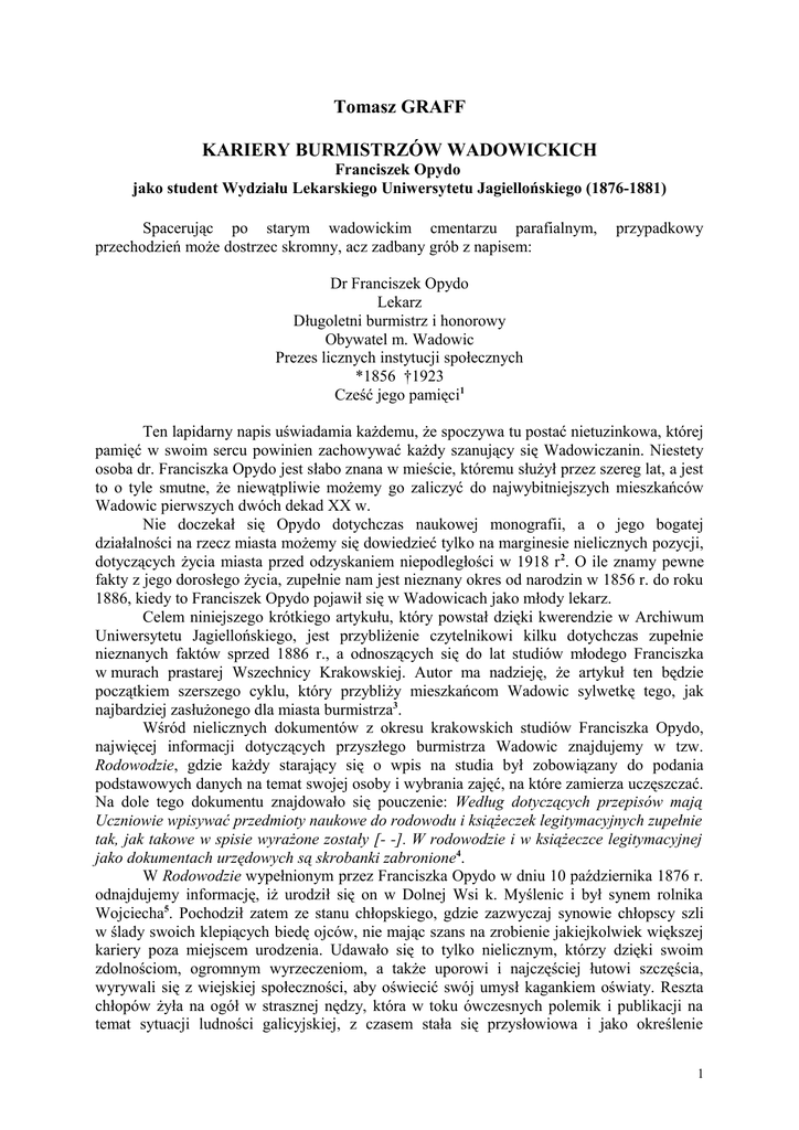 Tomasz GRAFF KARIERY BURMISTRZÓW WADOWICKICH Franciszek Opydo jako student Wydziału Lekarskiego Uniwersytetu Jagiellońskiego (1876-1881) Spacerując po starym wadowickim cmentarzu parafialnym, przechodzień może dostrzec skromny, acz zadbany grób z napisem: przypadkowy Dr Franciszek Opydo Lekarz Długoletni burmistrz i honorowy Obywatel m. Wadowic Prezes licznych instytucji społecznych *1856 †1923 Cześć jego pamięci1 Ten lapidarny napis uświadamia każdemu, że spoczywa tu postać nietuzinkowa, której pamięć w swoim sercu powinien zachowywać każdy szanujący się Wadowiczanin. Niestety osoba dr. Franciszka Opydo jest słabo znana w mieście, któremu służył przez szereg lat, a jest to o tyle smutne, że niewątpliwie możemy go zaliczyć do najwybitniejszych mieszkańców Wadowic pierwszych dwóch dekad XX w. Nie doczekał się Opydo dotychczas naukowej monografii, a o jego bogatej działalności na rzecz miasta możemy się dowiedzieć tylko na marginesie nielicznych pozycji, dotyczących życia miasta przed odzyskaniem niepodległości w 1918 r 2. O ile znamy pewne fakty z jego dorosłego życia, zupełnie nam jest nieznany okres od narodzin w 1856 r. do roku 1886, kiedy to Franciszek Opydo pojawił się w Wadowicach jako młody lekarz. Celem niniejszego krótkiego artykułu, który powstał dzięki kwerendzie w Archiwum Uniwersytetu Jagiellońskiego, jest przybliżenie czytelnikowi kilku dotychczas zupełnie nieznanych faktów sprzed 1886 r., a odnoszących się do lat studiów młodego Franciszka w murach prastarej Wszechnicy Krakowskiej. Autor ma nadzieję, że artykuł ten będzie początkiem szerszego cyklu, który przybliży mieszkańcom Wadowic sylwetkę tego, jak najbardziej zasłużonego dla miasta burmistrza3. Wśród nielicznych dokumentów z okresu krakowskich studiów Franciszka Opydo, najwięcej informacji dotyczących przyszłego burmistrza Wadowic znajdujemy w tzw. Rodowodzie, gdzie każdy starający się o wpis na studia był zobowiązany do podania podstawowych danych na temat swojej osoby i wybrania zajęć, na które zamierza uczęszczać. Na dole tego dokumentu znajdowało się pouczenie: Według dotyczących przepisów mają Uczniowie wpisywać przedmioty naukowe do rodowodu i książeczek legitymacyjnych zupełnie tak, jak takowe w spisie wyrażone zostały [- -]. W rodowodzie i w książeczce legitymacyjnej jako dokumentach urzędowych są skrobanki zabronione4. W Rodowodzie wypełnionym przez Franciszka Opydo w dniu 10 października 1876 r. odnajdujemy informację, iż urodził się on w Dolnej Wsi k. Myślenic i był synem rolnika Wojciecha5. Pochodził zatem ze stanu chłopskiego, gdzie zazwyczaj synowie chłopscy szli w ślady swoich klepiących biedę ojców, nie mając szans na zrobienie jakiejkolwiek większej kariery poza miejscem urodzenia. Udawało się to tylko nielicznym, którzy dzięki swoim zdolnościom, ogromnym wyrzeczeniom, a także uporowi i najczęściej łutowi szczęścia, wyrywali się z wiejskiej społeczności, aby oświecić swój umysł kagankiem oświaty. Reszta chłopów żyła na ogół w strasznej nędzy, która w toku ówczesnych polemik i publikacji na temat sytuacji ludności galicyjskiej, z czasem stała się przysłowiowa i jako określenie 1 przetrwała do naszych czasów6. W tym kontekście tych nielicznych, którym udało się dalej kształcić na poziomie uniwersyteckim, można bez wątpienia nazwać elitą stanu chłopskiego. Ostatnio A. K. Banach wykazał, iż w latach 1876-1881, czyli w okresie studiów lekarskich Franciszka Opydo, studenci pochodzenia chłopskiego stanowili ok. 12-20% ogólnej liczby studentów UJ. Natomiast na Wydziale Lekarskim ich liczba była mniejsza, bowiem oscylowała w granicach 2% ogólnej liczby studentów7. Franciszek Opydo będąc osobą o wybitnych zdolnościach, był zatem jedną z nielicznych jednostek pochodzenia chłopskiego, którym udało się podjąć studia lekarskie. Z wiadomości jakich udzielił młody żak podczas dokonywania swego wpisu w poczet studentów Wydziału Lekarskiego dowiadujemy się, że przed studiami uczył się on w powszechnie szanowanym i bardzo popularnym Gimnazjum św. Anny w Krakowie i tam uzyskał świadectwo dojrzałości. Tę informację podał Opydo, kiedy wypełniał rubrykę zatytułowaną: Wskazanie zakładu naukowego na którym Uczeń strawił ostatnie półrocze 8. My ze swej strony dodamy, iż ukończenie w tamtych czasach 8-klasowego gimnazjum, które zazwyczaj było okupione wielkim wysiłkiem materialnym, stanowiło niejako przepustkę do dalszego kształcenia i niejednokrotnie wielkiej kariery9. W momencie dokonania swego wpisu w poczet słuchaczy Uniwersytetu Jagiellońskiego, początkujący żak był zobowiązany również do udzielenia innych informacji, i tak na pytanie o miejsce zamieszkania Opydo napisał, że obecnie mieszka na Małym Rynku w Bursie Akademickiej pod numerem 432, czyli w bliskim sąsiedztwie Kościoła Mariackiego. Określił się ponadto jako Polak wyznania rzymsko-katolickiego, który jest poddanym austriackim. Z zachowanych danych wiemy, że wszystkie te informacje zostały udzielone w Kwesturze UJ, gdzie wpisano 20-letniego Franciszka jako 192 słuchacza z kolei wśród wszystkich młodych studentów wpisujących się na to półrocze zimowe10. Ponadto Opydo został także przyporządkowany do listy studentów Wydziału Lekarskiego pod numerem 2611. Po dokonaniu wpisu na studia, każdy z nowych słuchaczy był zobowiązany wybrać zajęcia na jakie zamierza uczęszczać, zatem i Opydo to uczynił. Jego wybór przedstawia poniższa tabela. TABELA 1 Wykaz zajęć F. Opydo na Wydziale Lekarskim UJ ( wpis z 10.10. 1876 r.) Przedmiot wykładu Liczba godzin tygodniowa Anatomia opisowa ciała ludzkiego 6 Ćwiczenia praktyczne w sekcjach anatomicznych 6 Fizyka doświadczalna dla lekarzy 5 Chemia nieorganiczna 5 Botanika ogólna dla lekarzy 3 Rodziny roślin podług układu Kuntha 2 Zoologia z uwzględnien