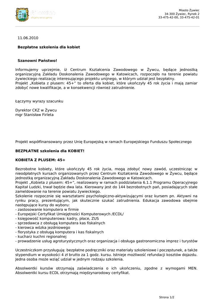 Miasto Żywiec 34-300 Żywiec, Rynek 2 33-475-42-00, 33-475-42-01 11.06.2010 Bezpłatne szkolenia dla kobiet Szanowni Państwo! Informujemy uprzejmie, iż Centrum Kształcenia Zawodowego w Żywcu, będące jednostką organizacyjną Zakładu Doskonalenia Zawodowego w Katowicach, rozpoczęło na terenie powiatu żywieckiego realizację interesującego projektu unijnego, w którym udział jest bezpłatny. Projekt „Kobieta z plusem: 45+” to oferta dla kobiet, które ukończyły 45 rok życia i mają zamiar zdobyć nowe kwalifikacje, a w konsekwencji również zatrudnienie. Łączymy wyrazy szacunku Dyrektor CKZ w Żywcu mgr Stanisław Firleta Projekt współfinansowany przez Unię Europejską w ramach Europejskiego Funduszu Społecznego BEZPŁATNE szkolenia dla KOBIET! KOBIETA Z PLUSEM: 45+ Bezrobotne kobiety, które ukończyły 45 rok życia, mogą zdobyć nowy zawód, uczestnicząc w nieodpłatnych kursach organizowanych przez Centrum Kształcenia Zawodowego w Żywcu, będące jednostką organizacyjną Zakładu Doskonalenia Zawodowego w Katowicach. Projekt „Kobieta z plusem: 45+”, realizowany w ramach poddziałania 6.1.1 Programu Operacyjnego Kapitał Ludzki, trwał będzie dwa lata. Kierowany jest do 144 bezrobotnych pań, posiadających stałe zameldowanie na terenie powiatu żywieckiego. Szkolenie rozpocznie się warsztatami psychologiczno-aktywizującymi oraz kursem pn. Aktywni na rynku pracy, prezentującym, jak skutecznie szukać zatrudnienia. Edukacja zawodowa obejmie następujące kursy do wyboru: - zastosowanie komputera w firmie - Europejski Certyfikat Umiejętności Komputerowych /ECDL/ - księgowość komputerowa: kadry, płace, ZUS - sprzedawca z obsługą komputera kas fiskalnych - kierowca wózka jezdniowego - florystyka z obsługą komputera i kas fiskalnych - kucharz kuchni regionalnej - prowadzenie usług agroturystycznych oraz organizacja i obsługa gastronomiczna imprez i turystów Uczestniczkom przysługują: bezpłatne podręczniki oraz materiały szkoleniowe i poczęstunek, a także stypendium w wysokości 4 zł brutto za 1 godz. kursu. Istnieje możliwość refundacji kosztów dojazdu. Jedna osoba może wziąć udział w jednym rodzaju szkolenia. Absolwentki kursów otrzymają zaświadczenia o ich ukończeniu, zgodne z wymogami MEN. Absolwentki kursu ECDL otrzymają międzynarodowy certyfikat. Strona 1/2 Miasto Żywiec 34-300 Żywiec, Rynek 2 33-475-42-00, 33-475-42-01 Każdej z osób, która ukończy kurs, przedstawione zostaną, do wyboru, 2 propozycje pracy. Zgłoszenia chętnych do udziału w projekcie przyjmowane są w Centrum Kształcenia Zawodowego w Żywcu, ul. Sienkiewicza 65, tel/fax 33 861-43-36, kom. 697-81-87-46, email: [email protected] . Tam też uzyskać można szczegółowe informacje. Strona 2/2 Powered by TCPDF (www.tcpdf.org)