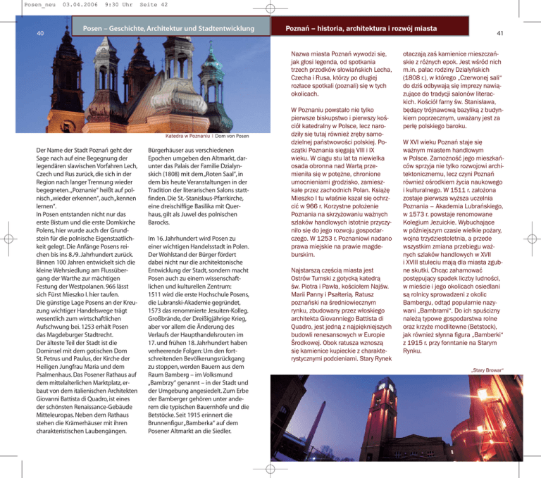 Posen_neu 40 03.04.2006 9:30 Uhr Seite 42 Posen – Geschichte, Architektur und Stadtentwicklung Poznań – historia, architektura i rozwój miasta Nazwa miasta Poznań wywodzi się, jak głosi legenda, od spotkania trzech przodków słowiańskich Lecha, Czecha i Rusa, którzy po długiej rozłace spotkali (poznali) się w tych okolicach. Katedra w Poznaniu | Dom von Posen Der Name der Stadt Poznań geht der Sage nach auf eine Begegnung der legendären slawischen Vorfahren Lech, Czech und Rus zurück, die sich in der Region nach langer Trennung wieder begegneten.„Poznanie“ heißt auf polnisch „wieder erkennen“, auch „kennen lernen“. In Posen entstanden nicht nur das erste Bistum und die erste Domkirche Polens, hier wurde auch der Grundstein für die polnische Eigenstaatlichkeit gelegt. Die Anfänge Posens reichen bis ins 8./9. Jahrhundert zurück. Binnen 100 Jahren entwickelt sich die kleine Wehrsiedlung am Flussübergang der Warthe zur mächtigen Festung der Westpolanen. 966 lässt sich Fürst Mieszko I. hier taufen. Die günstige Lage Posens an der Kreuzung wichtiger Handelswege trägt wesentlich zum wirtschaftlichen Aufschwung bei. 1253 erhält Posen das Magdeburger Stadtrecht. Der älteste Teil der Stadt ist die Dominsel mit dem gotischen Dom St. Petrus und Paulus, der Kirche der Heiligen Jungfrau Maria und dem Psalmenhaus. Das Posener Rathaus auf dem mittelalterlichen Marktplatz, erbaut von dem italienischen Architekten Giovanni Battista di Quadro, ist eines der schönsten Renaissance-Gebäude Mitteleuropas. Neben dem Rathaus stehen die Krämerhäuser mit ihren charakteristischen Laubengängen. Bürgerhäuser aus verschiedenen Epochen umgeben den Altmarkt, darunter das Palais der Familie Dzialynskich (1808) mit dem „Roten Saal“, in dem bis heute Veranstaltungen in der Tradition der literarischen Salons stattfinden. Die St.-Stanislaus-Pfarrkirche, eine dreischiffige Basilika mit Querhaus, gilt als Juwel des polnischen Barocks. Im 16. Jahrhundert wird Posen zu einer wichtigen Handelsstadt in Polen. Der Wohlstand der Bürger fördert dabei nicht nur die architektonische Entwicklung der Stadt, sondern macht Posen auch zu einem wissenschaftlichen und kulturellen Zentrum: 1511 wird die erste Hochschule Posens, die Lubranski-Akademie gegründet, 1573 das renommierte Jesuiten-Kolleg. Großbrände, der Dreißigjährige Krieg, aber vor allem die Änderung des Verlaufs der Haupthandelsrouten im 17. und frühen 18. Jahrhundert haben verheerende Folgen: Um den fortschreitenden Bevölkerungsrückgang zu stoppen, werden Bauern aus dem Raum Bamberg – im Volksmund „Bambrzy“ genannt – in der Stadt und der Umgebung angesiedelt. Zum Erbe der Bamberger gehören unter anderem die typischen Bauernhöfe und die Betstöcke. Seit 1915 erinnert die Brunnenfigur „Bamberka“ auf dem Posener Altmarkt an die Siedler. W Poznaniu powstało nie tylko pierwsze biskupstwo i pierwszy kościół katedralny w Polsce, lecz narodziły się tutaj również zręby samodzielnej państwowości polskiej. Początki Poznania sięgają VIII i IX wieku. W ciągu stu lat ta niewielka osada obronna nad Wartą przemieniła się w potężne, chronione umocnieniami grodzisko, zamieszkałe przez zachodnich Polan. Książę Mieszko I tu właśnie kazał się ochrzcić w 966 r. Korzystne położenie Poznania na skrzyżowaniu ważnych szlaków handlowych istotnie przyczyniło się do jego rozwoju gospodarczego. W 1253 r. Poznaniowi nadano prawa miejskie na prawie magdeburskim. Najstarszą częścią miasta jest Ostrów Tumski z gotycką katedrą św. Piotra i Pawła, kościołem Najśw. Marii Panny i Psałterią. Ratusz poznański na średniowiecznym rynku, zbudowany przez włoskiego architekta Giovanniego Battista di Quadro, jest jedną z najpiękniejszych budowli renesansowych w Europie Środkowej. Obok ratusza wznoszą się kamienice kupieckie z charakterystycznymi podcieniami. Stary Rynek 41 otaczają zaś kamienice mieszczańskie z różnych epok. Jest wśród nich m.in. pałac rodziny Działyńskich (1808 r.), w którego „Czerwonej sali“ do dziś odbywają się imprezy nawiązujące do tradycji salonów literackich. Kościół farny św. Stanisława, będący trójnawową bazyliką z budynkiem poprzecznym, uważany jest za perłę polskiego baroku. W XVI wieku Poznań staje się ważnym miastem handlowym w Polsce. Zamożność jego mieszkańców sprzyja nie tylko rozwojowi architektonicznemu, lecz czyni Poznań również ośrodkiem życia naukowego i kulturalnego. W 1511 r. założona zostaje pierwsza wyższa uczelnia Poznania – Akademia Lubrańskiego, w 1573 r. powstaje renomowane Kolegium Jezuickie. Wybuchające w późniejszym czasie wielkie pożary, wojna trzydziestoletnia, a przede wszystkim zmiana przebiegu ważnych szlaków handlowych w XVII i XVIII stuleciu mają dla miasta zgubne skutki. Chcąc zahamować postępujący spadek liczby ludności, w mieście i jego okolicach osiedlani są rolnicy sprowadzeni z okolic Bambergu, odtąd popularnie nazywani „Bambrami“. Do ich spuścizny należą typowe gospodarstwa rolne oraz krzyże modlitewne (Betstock), jak również słynna figura „Bamberki“ z 1915 r. przy fonntanie na Starym Rynku. „Stary Browar“ Posen_neu 42 03.04.2006 9:30 Uhr Seite 44 Posen – Geschichte, Architektur und Stadtentwicklung Pegaz na Teatrze Wielkim | Pegasus auf der Oper Nach der zweiten Polnischen Teilung 1793 werden Großpolen und die Stadt Posen durch Preußen besetzt. Die Besiedlungspolitik Anfang des 19. Jahrhunderts zielt darauf ab, den Anteil der deutschen Bevölkerung zu erhöhen. Im Gegenzug gründen die polnischen Einwohner wirtschaftliche, soziale, religiöse und kulturelle Vereine und bewahren auf diese Weise ihre nationale Identität. Wichtige Orte des Widerstands aus dieser Zeit sind die Raczynski-Bibliothek, das Hotel Bazar, das Polnische Theater oder das Dzialynski-Palais. Nach dem gescheiterten polnischen Aufstand von 1848 wird die Region in „Prov