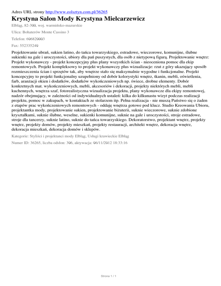 Adres URL strony http://www.eolsztyn.com.pl/36265 Krystyna Salon Mody Krystyna Mielcarzewicz Elbląg, 82-300, woj. warmińsko-mazurskie Ulica: Bohaterów Monte Cassino 3 Telefon: 606820003 Fax: 552335240 Projektowanie ubrań, sukien latino, do tańca towarzyskiego, estradowe, wieczorowe, komunijne, ślubne sukienki na gale i uroczystości, ubiory dla pań puszystych, dla osób z nietypową figurą. Projektowanie wnętrz: Projekt wykonawczy - projekt koncepcyjny plus plany wszystkich ścian - nieoceniona pomoc dla ekip remontowych. Projekt kompleksowy to projekt wykonawczy plus wizualizacje: rzut z góry ukazujący sposób rozmieszczenia ścian i sprzętów tak, aby wnętrze stało się maksymalnie wygodne i funkcjonalne. Projekt koncepcyjny to projekt funkcjonalny uzupełniony od dobór kolorystyki wnętrz, tkanin, mebli, oświetlenia, farb, aranżacji okien i dodatków, dodatków wykończeniowych np. świece, drobne elementy. Dobór konkretnych mat. wykończeniowych, mebli, akcesoriów i dekoracji, projekty niektórych mebli, mebli kuchennych, wnętrza szaf, fotorealistyczna wizualizacja projektu, plany wykonawcze dla ekipy remontowej, nadzór obejmujący, w zależności od indywidualnych ustaleń: kilka do kilkunastu wizyt podczas realizacji projektu, pomoc w zakupach, w kontaktach ze stolarzem itp. Pełna realizacja - nie muszą Państwo się o żaden z etapów prac wykończeniowych remontowych - oddaję wnętrza gotowe pod klucz. Studio Kreowania Ubioru, projektantka mody, projektowanie sukien, projektowanie biżuterii, suknie wieczorowe, suknie zdobione kryształkami, suknie ślubne, weselne, sukienki komunijne, suknie na gale i uroczystości, stroje estradowe, stroje dla tancerzy, suknie latino, suknie do tańca towarzyskiego. Dekoratorstwo, projektant wnętrz, projekty wnętrz, projekty domów, projekty mieszkań, projekty restauracji, architekt wnętrz, dekoracja wnętrz, dekoracja mieszkań, dekoracja domów i sklepów. Kategorie: Styliści i projektanci mody Elbląg, Usługi krawieckie Elbląg Numer ID: 36265, liczba odsłon: 306, aktywacja: 06/11/2012 18:33:16 Strona 1 / 1