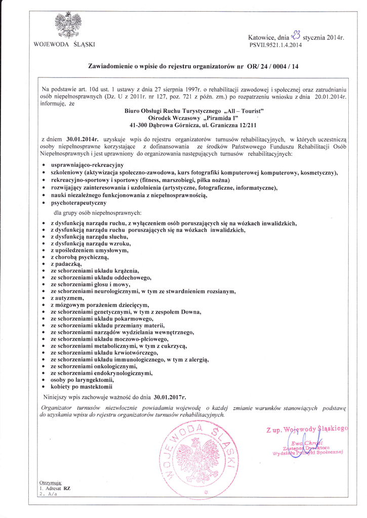 z dniem 30.0l.20l4r. uzyskuje wpis do rejestru organizatorów turnusów rehabilitacyjnych, w których uczestniczą
