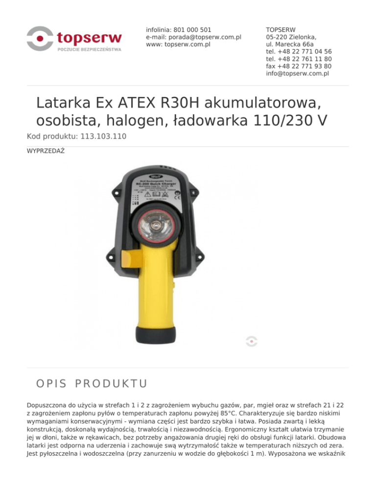 infolinia: 801 000 501 e-mail: [email protected] www: topserw.com.pl TOPSERW 05-220 Zielonka, ul. Marecka 66a tel. +48 22 771 04 56 tel. +48 22 761 11 80 fax +48 22 771 93 80 [email protected] Latarka Ex ATEX R30H akumulatorowa, osobista, halogen, ładowarka 110/230 V Kod produktu: 113.103.110 WYPRZEDAŻ OPIS PRODUKTU Dopuszczona do użycia w strefach 1 i 2 z zagrożeniem wybuchu gazów, par, mgieł oraz w strefach 21 i 22 z zagrożeniem zapłonu pyłów o temperaturach zapłonu powyżej 85°C. Charakteryzuje się bardzo niskimi wymaganiami konserwacyjnymi - wymiana części jest bardzo szybka i łatwa. Posiada zwartą i lekką konstrukcją, doskonałą wydajnością, trwałością i niezawodnością. Ergonomiczny kształt ułatwia trzymanie jej w dłoni, także w rękawicach, bez potrzeby angażowania drugiej ręki do obsługi funkcji latarki. Obudowa latarki jest odporna na uderzenia i zachowuje swą wytrzymałość także w temperaturach niższych od zera. Jest pyłoszczelna i wodoszczelna (przy zanurzeniu w wodzie do głębokości 1 m). Wyposażona we wskaźnik naładowania akumulatora oraz żarówkę halogenową o przedłużonej trwałości, strumieniu światła 4 W oraz maksymalnym natężeniu 54 lumenów. Ponadto zastosowanie najnowocześniejszych akumulatorów litowojonowych pozwala na wyeliminowanie `efektu fałszywej pamięci`. Czas świecenia (pełna moc) do 3,5 godziny, w trybie oszczędzania, czas wydłuża się blisko dwukrotnie - do 6,5 godziny. Dostarczana z paskiem naręcznym oraz pierścieniem zaciskowym. W komplecie ładowarka RC-200H 110/230 V (AC). Czas pełnego naładowania akumulatora (litowo-jonowego) 3 godziny. Waga 0.340 kg. Posiada certyfikat BAS 05 ATEX 0068, kod II 2 GD Ex e ib IIC T4 tD IP67 T85°C oraz znak CE. DANE TECHNICZNE Zasilanie Akumulatorowe Kategoria sprzętu 2 GD Norma EN60079-0, EN60079-7, EN50020, EN6124-0, EN6124-1 Stopień ochrony IP67 Obszar klasyfikacji (gazy) Strefy 1 i 2, grupy gazów II A, IIB i IIC Klasyfikacja temperatury T4 gazy Temperatura otoczenia -20°C do +40°C Certfikacja Baseefa05 ATEX0068 IECEx BAS05,0070 Obudowa Tworzywo termoplastyczne, antystatyczne Soczewka Poliwęglan z twardą powłoką Typ strumienia Średnio skupiony Typ żarówki Halogenowa Napięcie 6,0 V Moc 4W Światłość 54 Czas pracy 3,5 godziny Waga 340 g Ładowarka RC200H lub RC200L AKCESORIA Ładowarka, napięcie zasilania 12/24 V (R30, R50, R55) 113.103.691 Ładowarka, napięcie zasilania 110/230 V (R30, R50, R55) 113.103.690 CERTYFIKATY POWIĄZANE Produkt Ilość lumenów Latarka Ex ATEX R30 akumulatorowa, osobista, halogen -- Latarka Ex ATEX R30L akumulatorowa, osobista, halogen, ładowarka 12/24 V -- Latarka Ex ATEX R30H akumulatorowa, osobista, halogen, ładowarka 110/230 V --