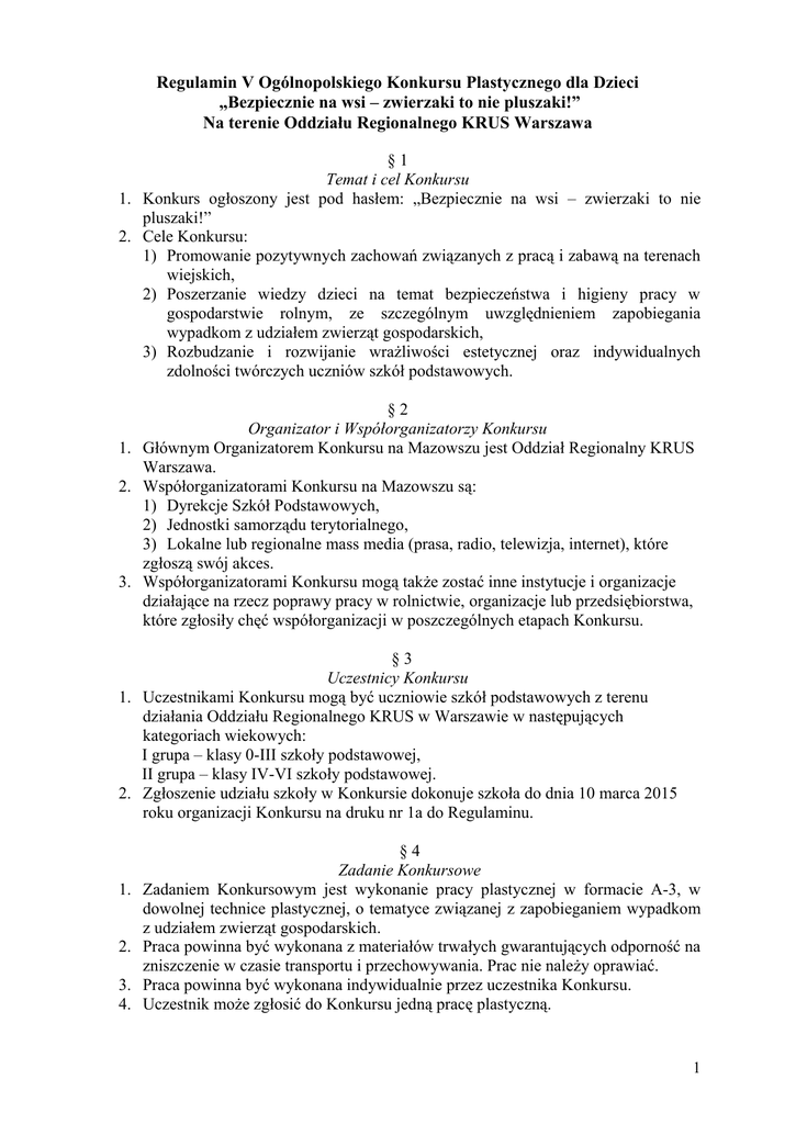 Regulamin V Ogólnopolskiego Konkursu Plastycznego dla Dzieci „Bezpiecznie na wsi – zwierzaki to nie pluszaki!” Na terenie Oddziału Regionalnego KRUS Warszawa §1 Temat i cel Konkursu 1. Konkurs ogłoszony jest pod hasłem: „Bezpiecznie na wsi – zwierzaki to nie pluszaki!” 2. Cele Konkursu: 1) Promowanie pozytywnych zachowań związanych z pracą i zabawą na terenach wiejskich, 2) Poszerzanie wiedzy dzieci na temat bezpieczeństwa i higieny pracy w gospodarstwie rolnym, ze szczególnym uwzględnieniem zapobiegania wypadkom z udziałem zwierząt gospodarskich, 3) Rozbudzanie i rozwijanie wrażliwości estetycznej oraz indywidualnych zdolności twórczych uczniów szkół podstawowych. §2 Organizator i Współorganizatorzy Konkursu 1. Głównym Organizatorem Konkursu na Mazowszu jest Oddział Regionalny KRUS Warszawa. 2. Współorganizatorami Konkursu na Mazowszu są: 1) Dyrekcje Szkół Podstawowych, 2) Jednostki samorządu terytorialnego, 3) Lokalne lub regionalne mass media (prasa, radio, telewizja, internet), które zgłoszą swój akces. 3. Współorganizatorami Konkursu mogą także zostać inne instytucje i organizacje działające na rzecz poprawy pracy w rolnictwie, organizacje lub przedsiębiorstwa, które zgłosiły chęć współorganizacji w poszczególnych etapach Konkursu. §3 Uczestnicy Konkursu 1. Uczestnikami Konkursu mogą być uczniowie szkół podstawowych z terenu działania Oddziału Regionalnego KRUS w Warszawie w następujących kategoriach wiekowych: I grupa – klasy 0-III szkoły podstawowej, II grupa – klasy IV-VI szkoły podstawowej. 2. Zgłoszenie udziału szkoły w Konkursie dokonuje szkoła do dnia 10 marca 2015 roku organizacji Konkursu na druku nr 1a do Regulaminu. 1. 2. 3. 4. §4 Zadanie Konkursowe Zadaniem Konkursowym jest wykonanie pracy plastycznej w formacie A-3, w dowolnej technice plastycznej, o tematyce związanej z zapobieganiem wypadkom z udziałem zwierząt gospodarskich. Praca powinna być wykonana z materiałów trwałych gwarantujących odporność na zniszczenie w czasie transportu i przechowywania. Prac nie należy oprawiać. Praca powinna być wykonana indywidualnie przez uczestnika Konkursu. Uczestnik może zgłosić do Konkursu jedną pracę plastyczną. 1 5. Praca plastyczna powinna być trwale opisana na odwrocie imieniem i nazwiskiem uczestnika Konkursu oraz opatrzona pieczęcią szkolną na odwrocie. 6. Do pracy konkursowej powinny być dołączone: formularz zgłoszeniowy stanowiący załącznik nr 1 do niniejszego regulaminu. §5 Kryteria oceny Przy ocenie prac konkursowych komisje konkursowe wezmą pod uwagę: a) zgodność z tematyką konkursu i jej trafne przedstawienie (max. 6 pkt.); b) walory estetyczne pracy (max. 4 pkt.) 1. 2. 3. 4. 1. 2. 3. 4. §6 Organizacja eliminacji W Województwie Mazowieckim Konkurs przebiega w dwóch etapach: 1) PT KRUS, 2) wojewódzkim. Ogłoszenie Konkursu nastąpi w mass mediach Współorganizatorów Konkursu (prasa, radio, telewizja, internet) w miesiącu lutym/ marcu roku, w którym Konkurs zostanie przeprowadzony. Etap I (etap PT KRUS) obejmuje obszarem jedną Placówkę Terenową z terenu działania Oddziału Regionalnego KRUS w Warszawie. Dyrekcje szkół przekazują zebrane prace konkursowe do siedziby właściwej miejscowo Placówki Terenowej KRUS do dnia 25 marca. Komisja Konkursowa do dnia 10 kwietnia wyłania laureatów I etapu Konkursu i przekazuje do 21 kwietnia po jednej pracy plastycznej z każdej kategorii wiekowej wraz z protokołem komisji (załącznik nr 2b do niniejszego regulaminu) i formularzem zgłoszeniowym stanowiącym załącznik nr 1 do niniejszego regulaminu do Oddziału Regionalnego KRUS w Warszawie. Wręczenie nagród laureatom I etapu następuje do dnia 5 czerwca. Etap II obejmuje obszarem województwo mazowieckie tj. teren działania Oddziału Regionalnego KRUS w Warszawie. Uczestnikami II etapu mogą być laureaci I etapu, którzy zajęli pierwsze miejsce, z każdej kategorii wiekowej. Komisja konkursowa II etapu wyłania laureatów do dnia 5 maja i przekazuje do Centrali KRUS trzy najlepsze prace z obu kategorii wiekowych wraz z protokołem z obrad Wojewódzkiej Komisji Konkursowej (wzór stanowi załącznik nr 2 do niniejszego regulaminu). Wręczenie nagród laureatom II etapu nastąpi do 26 czerwca. §7 Nagrody Nagrody rzeczowe otrzymuje trzech laureatów w dwóch kategoriach wiekowych etapów I i II. Fundatorem nagród dla laureata pierwszego miejsca w obu kategoriach wiekowych z każdego etapu konkursu jest Oddział Regionalny KRUS. Fundatorem nagród mogą zostać inni Współorganizatorzy, którzy zgłosili chęć współorganizacji poszczególnych etapów. Nagrody rzeczowe: a) etap I /etap PT KRUS/: I nagroda o wartości do 200 zł II nagroda o wartości do 170 zł III nagroda o wartości do 130 zł 2 b) etap II /wojewódzki/: I nagroda o wartości do 1.100 zł II nagroda o wartości do 850 zł III nagroda o wartości do 700 zł Wyróżnienie o wartości do 500 zł 5. Laureatom etapu centralnego nagrody funduje Prezes KRUS. 6. Rodzice/opiekunowie prawni uczestników konkursu wyróżnionych nagrodą o wartości powyżej 760,00 zł brutto zobowiązani są do uiszczenia 10% wartości nagród brutto tytułem podatku dochodowego, zgodnie z ustawą o podatku dochodowym od osób fizycznych (Dz.U. z 2012r. Nr 361 z późn. zm.). §8 Rozstrzygnięcie konkursu 1. Sprawdzenie prac i wyłonienie laureatów Konkursu dokonuje komisja konkursowa składająca się z minimum trzech osób. 2. Przewodniczącym komisji konkursowej na poszczególnych etapach jest przedstawiciel Oddziału Regionalnego KRUS w Warszawie. 3. Do zadań Komisji Konkursowych należy: czuwanie nad prawidłowym przebiegiem konkursu, sporządzenie protokołu komisji konkursowej o wynikach, zakup nagród, wręczenie nagród laureatom, sporządzenie pokwitowania odbioru nagród, rozliczenie poniesionych wydatków. 4. Skład Komisji Konkursowych działających na obszarze Placówki Terenowe