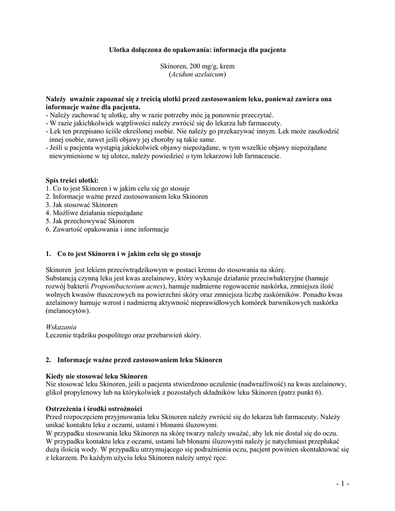 Ulotka dołączona do opakowania: informacja dla pacjenta Skinoren, 200 mg/g, krem (Acidum azelaicum) Należy uważnie zapoznać się z treścią ulotki przed zastosowaniem leku, ponieważ zawiera ona informacje ważne dla pacjenta. - Należy zachować tę ulotkę, aby w razie potrzeby móc ją ponownie przeczytać. - W razie jakichkolwiek wątpliwości należy zwrócić się do lekarza lub farmaceuty. - Lek ten przepisano ściśle określonej osobie. Nie należy go przekazywać innym. Lek może zaszkodzić innej osobie, nawet jeśli objawy jej choroby są takie same. - Jeśli u pacjenta wystąpią jakiekolwiek objawy niepożądane, w tym wszelkie objawy niepożądane niewymienione w tej ulotce, należy powiedzieć o tym lekarzowi lub farmaceucie. Spis treści ulotki: 1. Co to jest Skinoren i w jakim celu się go stosuje 2. Informacje ważne przed zastosowaniem leku Skinoren 3. Jak stosować Skinoren 4. Możliwe działania niepożądane 5. Jak przechowywać Skinoren 6. Zawartość opakowania i inne informacje 1. Co to jest Skinoren i w jakim celu się go stosuje Skinoren jest lekiem przeciwtrądzikowym w postaci kremu do stosowania na skórę. Substancją czynną leku jest kwas azelainowy, który wykazuje działanie przeciwbakteryjne (hamuje rozwój bakterii Propionibacterium acnes), hamuje nadmierne rogowacenie naskórka, zmniejsza ilość wolnych kwasów tłuszczowych na powierzchni skóry oraz zmniejsza liczbę zaskórników. Ponadto kwas azelainowy hamuje wzrost i nadmierną aktywność nieprawidłowych komórek barwnikowych naskórka (melanocytów). Wskazania Leczenie trądziku pospolitego oraz przebarwień skóry. 2. Informacje ważne przed zastosowaniem leku Skinoren Kiedy nie stosować leku Skinoren Nie stosować leku Skinoren, jeśli u pacjenta stwierdzono uczulenie (nadwrażliwość) na kwas azelainowy, glikol propylenowy lub na którykolwiek z pozostałych składników leku Skinoren (patrz punkt 6). Ostrzeżenia i środki ostrożności Przed rozpoczęciem przyjmowania leku Skinoren należy zwrócić się do lekarza lub farmaceuty. Należy unikać kontaktu leku z oczami, ustami i błonami śluzowymi. W przypadku stosowania leku Skinoren na skórę twarzy należy uważać, aby lek nie dostał się do oczu. W przypadku kontaktu leku z oczami, ustami lub błonami śluzowymi należy je natychmiast przepłukać dużą ilością wody. W przypadku utrzymującego się podrażnienia oczu, pacjent powinien skontaktować się z lekarzem. Po każdym użyciu leku Skinoren należy umyć ręce. -1- Dzieci i młodzież Nie badano bezpieczeństwa oraz skuteczności stosowania leku Skinoren u dzieci w wieku poniżej 12 lat. Inne leki i Skinoren Należy powiedzieć lekarzowi o wszystkich przyjmowanych aktualnie lub ostatnio lekach, również tych, które wydawane są bez recepty. Nie przeprowadzono badań dotyczących interakcji. Ciąża, karmienie piersią i wpływ na płodność Przed zastosowaniem jakiegokolwiek leku należy poradzić się lekarza. Nie należy stosować leku Skinoren w czasie ciąży oraz w okresie karmienia piersią, jeśli nie zalecił tego lekarz. Prowadzenie pojazdów i obsługiwanie maszyn Skinoren nie ma wpływu na zdolność prowadzenia pojazdów mechanicznych i obsługiwania maszyn. Ważne informacje o niektórych składnikach leku Skinoren Lek Skinoren zawiera kwas benzoesowy oraz glikol propylenowy. Glikol propylenowy może powodować podrażnienie skóry. Kwas benzoesowy w niewielkim stopniu podrażnia skórę, oczy i błony śluzowe. 3. Jak stosować Skinoren Lek Skinoren należy stosować zgodnie z zaleceniami lekarza. W przypadku wątpliwości należy ponownie skontaktować się z lekarzem lub farmaceutą. Skinoren należy stosować wyłącznie na skórę. Przed zastosowaniem leku Skinoren należy dokładnie umyć skórę zwykłą wodą i osuszyć. Można również użyć łagodnego preparatu przeznaczonego do oczyszczania skóry. O ile lekarz nie zaleci inaczej, zwykle cienką warstwę kremu należy nanosić na chorobowo zmienioną skórę dwa razy na dobę - rano i wieczorem. Krem należy delikatnie wetrzeć. Pasek wyciśniętego z tubki kremu o długości około 2,5 cm (około 0,5 g) całkowicie wystarcza na skórę twarzy. Po nałożeniu leku należy umyć ręce. Czas leczenia lekiem Skinoren jest różny u poszczególnych pacjentów i zależy od nasilenia zmian chorobowych skóry. W leczeniu trądziku pospolitego wyraźną poprawę uzyskuje się po około 4 tygodniach systematycznego stosowania leku. Aby uzyskać optymalny wynik leczenia, należy systematycznie stosować lek przez kilka miesięcy, maksymalnie do 12 miesięcy. W leczeniu przebarwień zaleca się stosowanie leku Skinoren przez co najmniej 3 miesiące. Najlepsze wyniki osiąga się stosując lek systematycznie. Ponieważ promieniowanie słoneczne może nasilać przebarwienia skóry, podczas całego okresu leczenia należy jednocześnie stosować kremy z filtrem UV B i UV A. W przypadku znacznego podrażnienia skóry należy zmniejszyć ilość stosowanego leku lub stosować go raz na dobę, do czasu ustąpienia objawów podrażnienia. Jeżeli to konieczne, należy przerwać leczenie na kilka dni. Stosowanie u dzieci i młodzieży Lek stosować u młodzieży (w wieku od 12 do 18 lat) w leczeniu trądziku pospolitego. Dostosowanie dawki u młodzieży w wieku od 12 do 18 lat nie jest konieczne. Brak danych dotyczących bezpieczeństwa i skuteczności stosowania u dzieci w wieku poniżej 12 lat. -2- W przypadku wrażenia, że działanie leku jest za mocne lub za słabe, należy zwrócić się do lekarza. Przerwanie stosowania leku Skinoren Jeżeli podczas stosowania leku Skinoren utrzymują się objawy podrażnienia skóry, należy przerwać leczenie na kilka dni. 4. Możliwe działania niepożądane Jak każdy lek, Skinoren może powodować działania niepożądane, chociaż nie u każdego one wystąpią. Na początku leczenia może wystąpić podrażnienie skóry. Bardzo często (mogą wystąpić