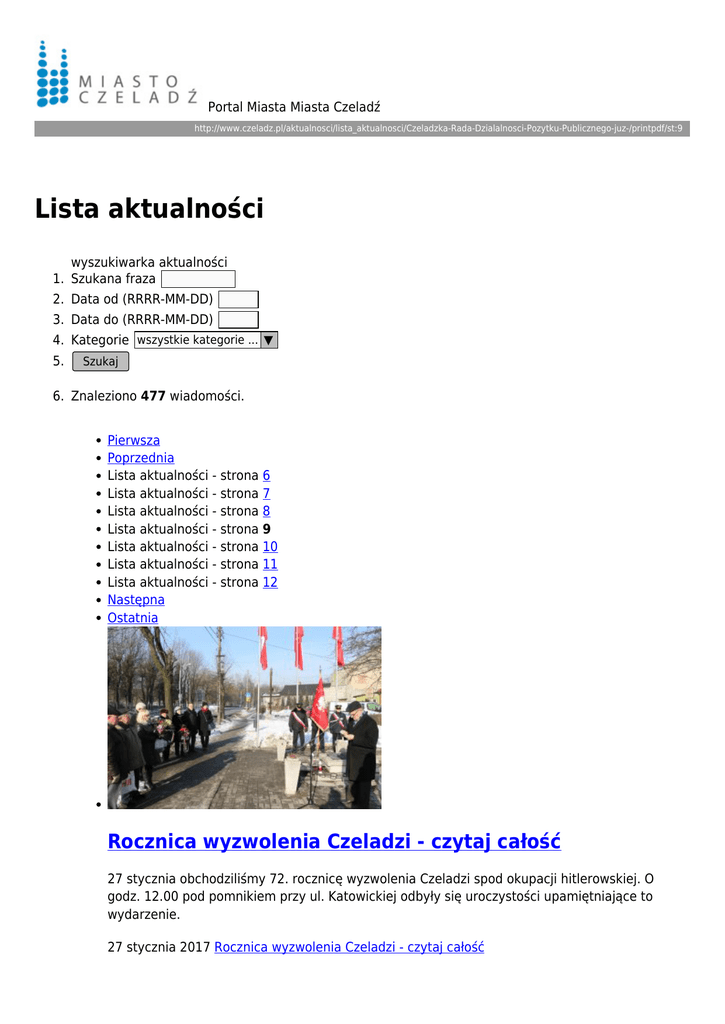 Portal Miasta Miasta Czeladź http://www.czeladz.pl/aktualnosci/lista_aktualnosci/Czeladzka-Rada-Dzialalnosci-Pozytku-Publicznego-juz-/printpdf/st:9 Lista aktualności wyszukiwarka aktualności 1. Szukana fraza 2. Data od (RRRR-MM-DD) 3. Data do (RRRR-MM-DD) 4. Kategorie wszystkie kategorie ... ▼ 5. Szukaj 6. Znaleziono 477 wiadomości. Pierwsza Poprzednia Lista aktualności - strona 6 Lista aktualności - strona 7 Lista aktualności - strona 8 Lista aktualności - strona 9 Lista aktualności - strona 10 Lista aktualności - strona 11 Lista aktualności - strona 12 Następna Ostatnia Rocznica wyzwolenia Czeladzi - czytaj całość 27 stycznia obchodziliśmy 72. rocznicę wyzwolenia Czeladzi spod okupacji hitlerowskiej. O godz. 12.00 pod pomnikiem przy ul. Katowickiej odbyły się uroczystości upamiętniające to wydarzenie. 27 stycznia 2017 Rocznica wyzwolenia Czeladzi - czytaj całość Czeladzianie mogą wymienić się ciepłem - czytaj całość Wspaniała inicjatywa Fundacji Rób Dobro dotarła do Czeladzi! W środę, w studni na rynku starego miasta pojawił się wieszak "Wymiany Ciepła". 26 stycznia 2017 Czeladzianie mogą wymienić się ciepłem - czytaj całość Konsultacje społeczne: przebudowa i adaptacja warsztatów elektrycznych i transformatorowni zabytkowej kopalni SATURN - czytaj całość Konsultacje społeczne dotyczące złożenia wniosku o dofinansowanie w ramach Regionalnego Programu Operacyjnego Województwa Śląskiego na lata 2014-2020, który obejmować będzie przebudowę i adaptację dwóch obiektów: warsztatów elektrycznych i transformatorowni zabytkowej kopalni SATURN w Czeladzi na Centrum Usług Społecznościowych i Aktywności Lokalnej SATURN 25 stycznia 2017 Konsultacje społeczne: przebudowa i adaptacja warsztatów elektrycznych i transformatorowni zabytkowej kopalni SATURN - czytaj całość Miłośnicy białego szaleństwa - czytaj całość Zakończyły się dwa turnusy obozów narciarskich w Białce Tatrzańskiej, organizowanych przez Miejski Szkolny Związek Sportowy. 25 stycznia 2017 Miłośnicy białego szaleństwa - czytaj całość Muzyczne Piątki w Muzeum Saturn - czytaj całość Już w najbliższy piątek 27 stycznia o godz. 18.00 w Muzeum Saturn koncert pt. „Jak za dawnych lat” w wykonaniu Trio Appassionata. 24 stycznia 2017 Muzyczne Piątki w Muzeum Saturn - czytaj całość Miasto walczy ze smogiem - czytaj całość Rozpoczęła się kampania informacyjno-edukacyjna, mająca na celu uświadomienie mieszkańcom zagrożeń, związanych ze smogiem. 24 stycznia 2017 Miasto walczy ze smogiem - czytaj całość Pierwszy tydzień harcerskich ferii dobiegł końca - czytaj całość Od 16 do 20 stycznia siedem drużyn zuchowych uczestniczyło w półkoloniach organizowanych przez Miasto Czeladź, Harcerski Krąg Seniorów oraz Miejski Ośrodek Sportu i Rekreacji. 23 stycznia 2017 Pierwszy tydzień harcerskich ferii dobiegł końca - czytaj całość Konkursowe emocje w Kopalni Kultury - czytaj całość Do uroczystego otwarcia Kopalni Kultury pozostało już kilka dni. 23 stycznia odbędzie się wielkie losowanie wśród zarejestrowanych w specjalnie przygotowanym formularzu. Relację na żywo będzie można obejrzeć na oficjalnej stronie kopalni na Facebooku o 16:00. 23 stycznia 2017 Konkursowe emocje w Kopalni Kultury - czytaj całość Rocznica wybuchu powstania styczniowego - czytaj całość W południe, 23 stycznia pod krzyżem przy ul. Nowopogońskiej na Piaskach oddaliśmy hołd bohaterom powstania styczniowego. 23 stycznia 2017 Rocznica wybuchu powstania styczniowego - czytaj całość Oświadczenie o rocznej wartości sprzedaży napojów alkoholowych tylko do 31 stycznia - czytaj całość Jeśli sprzedajesz napoje alkoholowe powinieneś pamiętać, że na początku każdego roku jesteś zobowiązany złożyć pisemne oświadczenie o wartości sprzedaży poszczególnych rodzajów napojów alkoholowych za rok poprzedni oraz wnieść opłaty za zezwolenie na sprzedaż napojów alkoholowych. 20 stycznia 2017 Oświadczenie o rocznej wartości sprzedaży napojów alkoholowych tylko do 31 stycznia - czytaj całość Pierwsza Poprzednia Lista aktualności - strona 6 Lista aktualności - strona 7 Lista aktualności - strona 8 Lista aktualności - strona 9 Lista aktualności - strona 10 Lista aktualności - strona 11 Lista aktualności - strona 12 Następna Ostatnia