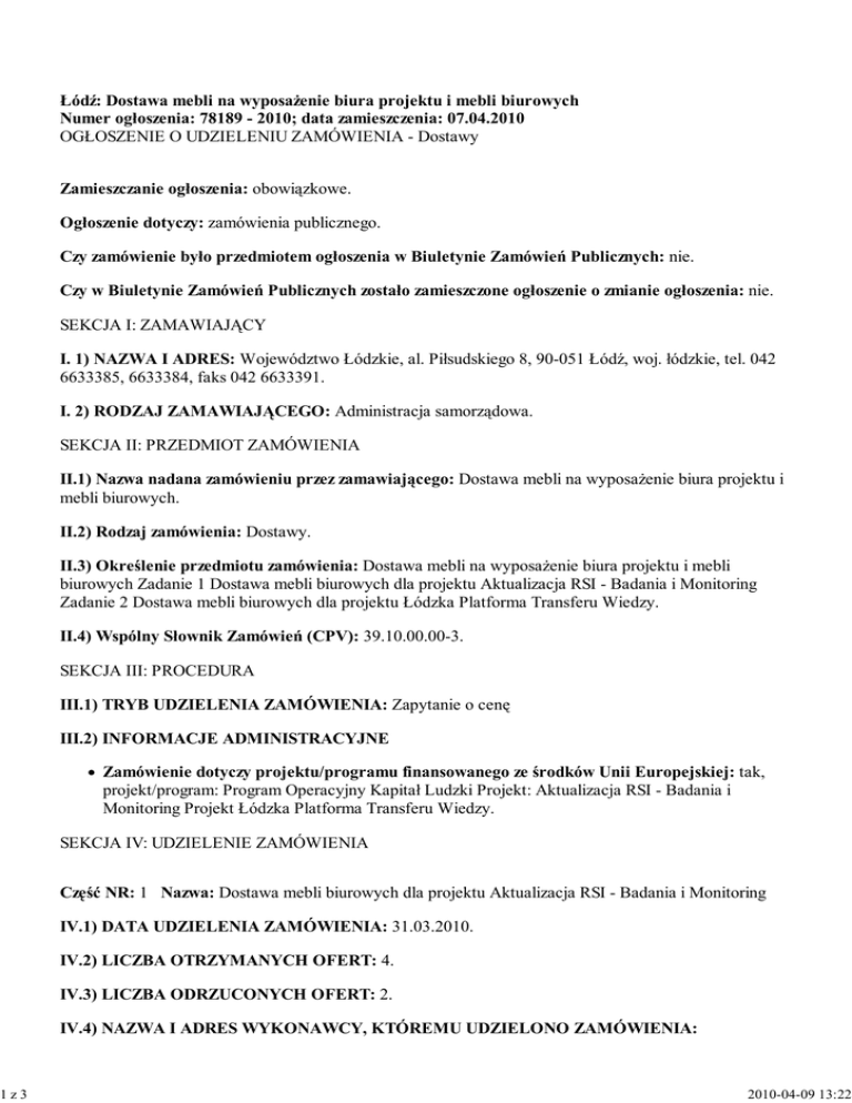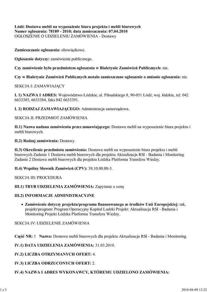 1z3 Łódź: Dostawa mebli na wyposaŜenie biura projektu i mebli biurowych Numer ogłoszenia: 78189 - 2010; data zamieszczenia: 07.04.2010 OGŁOSZENIE O UDZIELENIU ZAMÓWIENIA - Dostawy Zamieszczanie ogłoszenia: obowiązkowe. Ogłoszenie dotyczy: zamówienia publicznego. Czy zamówienie było przedmiotem ogłoszenia w Biuletynie Zamówień Publicznych: nie. Czy w Biuletynie Zamówień Publicznych zostało zamieszczone ogłoszenie o zmianie ogłoszenia: nie. SEKCJA I: ZAMAWIAJĄCY I. 1) NAZWA I ADRES: Województwo Łódzkie, al. Piłsudskiego 8, 90-051 Łódź, woj. łódzkie, tel. 042 6633385, 6633384, faks 042 6633391. I. 2) RODZAJ ZAMAWIAJĄCEGO: Administracja samorządowa. SEKCJA II: PRZEDMIOT ZAMÓWIENIA II.1) Nazwa nadana zamówieniu przez zamawiającego: Dostawa mebli na wyposaŜenie biura projektu i mebli biurowych. II.2) Rodzaj zamówienia: Dostawy. II.3) Określenie przedmiotu zamówienia: Dostawa mebli na wyposaŜenie biura projektu i mebli biurowych Zadanie 1 Dostawa mebli biurowych dla projektu Aktualizacja RSI - Badania i Monitoring Zadanie 2 Dostawa mebli biurowych dla projektu Łódzka Platforma Transferu Wiedzy. II.4) Wspólny Słownik Zamówień (CPV): 39.10.00.00-3. SEKCJA III: PROCEDURA III.1) TRYB UDZIELENIA ZAMÓWIENIA: Zapytanie o cenę III.2) INFORMACJE ADMINISTRACYJNE Zamówienie dotyczy projektu/programu finansowanego ze środków Unii Europejskiej: tak, projekt/program: Program Operacyjny Kapitał Ludzki Projekt: Aktualizacja RSI - Badania i Monitoring Projekt Łódzka Platforma Transferu Wiedzy. SEKCJA IV: UDZIELENIE ZAMÓWIENIA Część NR: 1 Nazwa: Dostawa mebli biurowych dla projektu Aktualizacja RSI - Badania i Monitoring IV.1) DATA UDZIELENIA ZAMÓWIENIA: 31.03.2010. IV.2) LICZBA OTRZYMANYCH OFERT: 4. IV.3) LICZBA ODRZUCONYCH OFERT: 2. IV.4) NAZWA I ADRES WYKONAWCY, KTÓREMU UDZIELONO ZAMÓWIENIA: 2010-04-09 13:22 2z3 PRESTIGE Dorota Dalecka-Chorąziak, ul. Brukowa 6/8,, 91-341 Łódź, kraj/woj. łódzkie. IV.5) Szacunkowa wartość zamówienia (bez VAT): 4918,03 PLN. IV.6) INFORMACJA O CENIE WYBRANEJ OFERTY ORAZ O OFERTACH Z NAJNIśSZĄ I NAJWYśSZĄ CENĄ Cena wybranej oferty: 5047,14 Oferta z najniŜszą ceną: 5047,14 / Oferta z najwyŜszą ceną: 22517,92 Waluta: PLN. Część NR: 2 Nazwa: Dostawa mebli biurowych dla projektu Łódzka Platforma Transferu Wiedzy IV.1) DATA UDZIELENIA ZAMÓWIENIA: 01.04.2010. IV.2) LICZBA OTRZYMANYCH OFERT: 4. IV.3) LICZBA ODRZUCONYCH OFERT: 2. IV.4) NAZWA I ADRES WYKONAWCY, KTÓREMU UDZIELONO ZAMÓWIENIA: PRESTIGE Dorota Dalecka-Chorąziak, ul. Brukowa 6/8, 91-341 Łódź, kraj/woj. łódzkie. IV.5) Szacunkowa wartość zamówienia (bez VAT): 14754,10 PLN. IV.6) INFORMACJA O CENIE WYBRANEJ OFERTY ORAZ O OFERTACH Z NAJNIśSZĄ I NAJWYśSZĄ CENĄ Cena wybranej oferty: 5298,46 Oferta z najniŜszą ceną: 5298,46 / Oferta z najwyŜszą ceną: 13925,08 Waluta: PLN. ZAŁĄCZNIK I Uzasadnienie udzielenia zamówienia w trybie negocjacji bez ogłoszenia, zamówienia z wolnej ręki albo zapytania o cenę 1. Podstawa prawna Postępowanie prowadzone jest w trybie zapytanie o cenę na podstawie art. 69 ustawy z dnia 29 stycznia 2004r. - Prawo zamówień publicznych. 2. Uzasadnienia wyboru trybu NaleŜy podać uzasadnienie faktyczne i prawne wyboru trybu oraz wyjaśnić, dlaczego udzielenie zamówienia jest zgodne z przepisami. Zgodnie z art. 70 ustawy Pzp, przedmiotem zamówienia jest dostawa fabrycznie nowych mebli na wyposaŜenie biura projektu i mebli biurowych, która jest powszechnie dostępna i ma ustalone standardy jakościowe a wartość zamówienia jest mniejsza niŜ kwoty określone w przepisach wydanych na podstawie art. 11 ust. 8 ustawy Pzp 2010-04-09 13:22 3z3 Powrót do głównej strony 2010-04-09 13:22