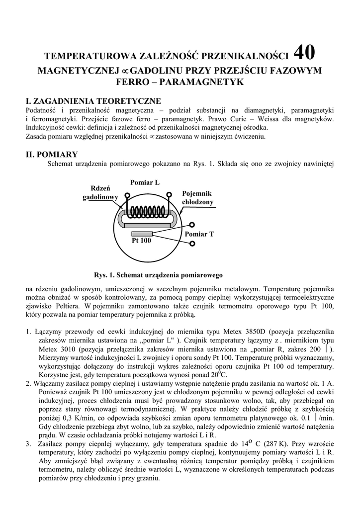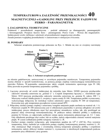 40 TEMPERATUROWA ZALEŻNOŚĆ PRZENIKALNOŚCI MAGNETYCZNEJ µ GADOLINU PRZY PRZEJŚCIU FAZOWYM FERRO – PARAMAGNETYK I. ZAGADNIENIA TEORETYCZNE Podatność i przenikalność magnetyczna – podział substancji na diamagnetyki, paramagnetyki i ferromagnetyki. Przejście fazowe ferro – paramagnetyk. Prawo Curie – Weissa dla magnetyków. Indukcyjność cewki: definicja i zależność od przenikalności magnetycznej ośrodka. Zasada pomiaru względnej przenikalności µ zastosowana w niniejszym ćwiczeniu. II. POMIARY Schemat urządzenia pomiarowego pokazano na Rys. 1. Składa się ono ze zwojnicy nawiniętej Rdzeń gadolinowy Pomiar L Pojemnik chłodzony Pt 100 Pomiar T Rys. 1. Schemat urządzenia pomiarowego na rdzeniu gadolinowym, umieszczonej w szczelnym pojemniku metalowym. Temperaturę pojemnika można obniżać w sposób kontrolowany, za pomocą pompy cieplnej wykorzystującej termoelektryczne zjawisko Peltiera. W pojemniku zamontowano także czujnik termometru oporowego typu Pt 100, który pozwala na pomiar temperatury pojemnika z próbką. 1. Łączymy przewody od cewki indukcyjnej do miernika typu Metex 3850D (pozycja przełącznika zakresów miernika ustawiona na „pomiar L" ). Czujnik temperatury łączymy z . miernikiem typu Metex 3010 (pozycja przełącznika zakresów miernika ustawiona na „pomiar R, zakres 200 Ω). Mierzymy wartość indukcyjności L zwojnicy i oporu sondy Pt 100. Temperaturę próbki wyznaczamy, wykorzystując dołączony do instrukcji wykres zależności oporu czujnika Pt 100 od temperatury. Korzystne jest, gdy temperatura początkowa wynosi ponad 200C. 2. Włączamy zasilacz pompy cieplnej i ustawiamy wstępnie natężenie prądu zasilania na wartość ok. 1 A. Ponieważ czujnik Pt 100 umieszczony jest w chłodzonym pojemniku w pewnej odległości od cewki indukcyjnej, proces chłodzenia musi być prowadzony stosunkowo wolno, tak, aby przebiegał on poprzez stany równowagi termodynamicznej. W praktyce należy chłodzić próbkę z szybkością poniżej 0,3 K/min, co odpowiada szybkości zmian oporu termometru platynowego ok. 0.1 Ω/min. Gdy chłodzenie przebiega zbyt wolno, lub za szybko, należy odpowiednio zmienić wartość natężenia prądu. W czasie ochładzania próbki notujemy wartości L i R. 3. Zasilacz pompy ciepnlej wyłączamy, gdy temperatura spadnie do 14o C (287 K). Przy wzroście temperatury, który zachodzi po wyłączeniu pompy cieplnej, kontynuujemy pomiary wartości L i R. Aby zmniejszyć błąd związany z ewentualną różnicą temperatur pomiędzy próbką i czujnikiem termometru, należy obliczyć średnie wartości L, wyznaczone w określonych temperaturach podczas pomiarów przy chłodzeniu i przy grzaniu. 2 4. Aby wyznaczyć indukcyjność L0 cewki bez rdzenia, a przy tym nie wyjmować zwojnicy z pojemnika, mierzymy indukcyjność drugiej, dołączonej do zestawu, identycznej cewki bez rdzenia. III. OPRACOWANIE WYNIKÓW POMIARÓW 1. Sporządzamy wykres, podstawiając otrzymane wartości L, L0 i T do równania 1 1 T − Tc = = . C µ −1 L −1 Lo 2. Ekstrapolujemy prostoliniowy odcinek krzywej odpowiadający wyższym temperaturom (fazie paramagnetycznej) do przecięcia z osią temperatur. Wyznaczamy temperaturę Curie Tc gadolinu. Z nachylenia prostej obliczamy wartość stałej Curie C. 3. Szacujemy dokładność pomiaru Tc i C, biorąc pod uwagę dokładność wyznaczenia współczynnika kierunkowego, czyli nachylenia prostej (metodą regresji liniowej, patrz H. Szydłowski, Pracownia fizyczna, PWN Warszawa 1999, str. 67 i nast.), oraz dokładność pomiaru temperatury i in-dukcyjności. IV. LITERATURA Podręcznki kursowe z fizyki. DODATEK 1 Wykres zależności oporu R termometru typu Pt 100 od temperatury i jej postać analityczna. R = 100 ( 1+ 0.00392 T) 109,0 108,5 108,0 R [Ω ] 107,5 107,0 106,5 106,0 105,5 105,0 14 15 16 17 18 19 Temperatura [oC] 20 21 22