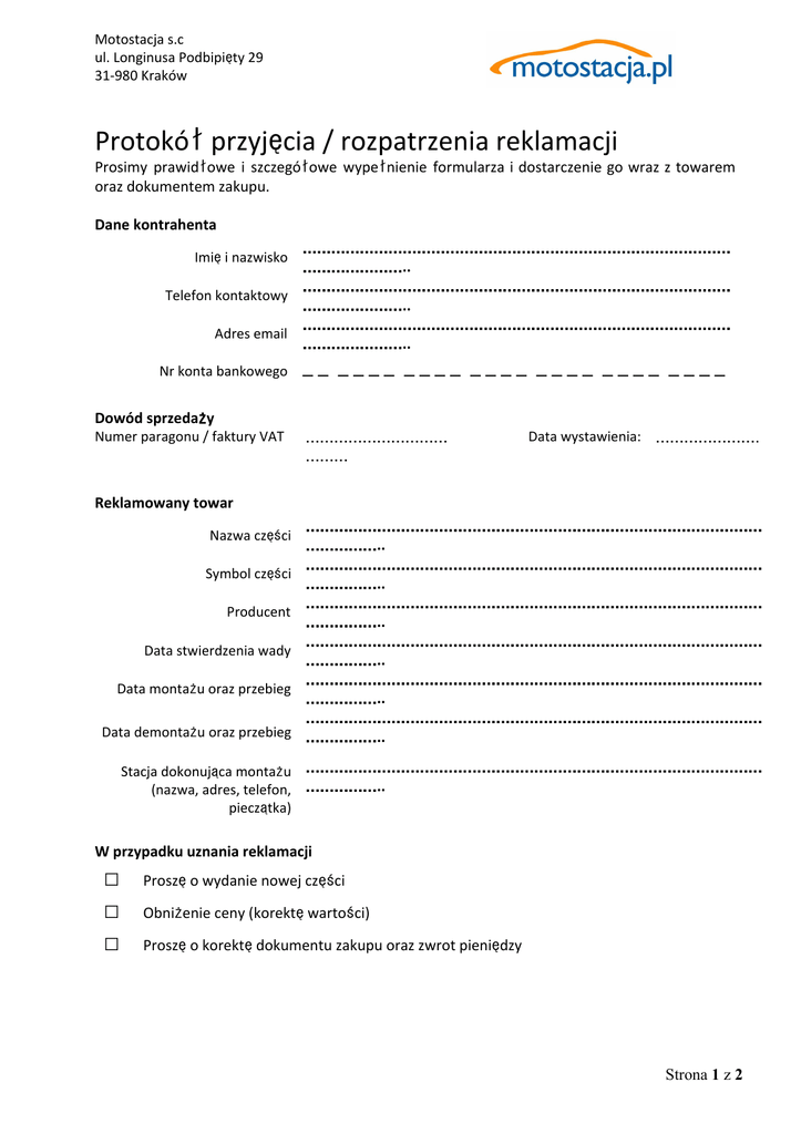 Motostacja s.c ul. Longinusa Podbipięty 29 31980 Kraków Protokół przyję cia / rozpatrzenia reklamacji Prosimy prawidłowe i szczegółowe wypeł nienie formularza i dostarczenie go wraz z towarem oraz dokumentem zakupu. Dane kontrahenta ……………………………………………………………………………… Imię i nazwisko ………………….. ……………………………………………………………………………… Telefon kontaktowy ………………….. ……………………………………………………………………………… Adres email ………………….. Nr konta bankowego _ _ _ _ _ _ _ _ _ _ _ _ _ _ _ _ _ _ _ _ _ _ _ _ _ _ Dowód sprzedaży Numer paragonu / faktury VAT Reklamowany towar Nazwa części Symbol części Producent Data stwierdzenia wady Data montażu oraz przebieg Data demontażu oraz przebieg ………………………… ……… Data wystawienia: …………………. …………………………………………………………………………………… …………….. …………………………………………………………………………………… …………….. …………………………………………………………………………………… …………….. …………………………………………………………………………………… …………….. …………………………………………………………………………………… …………….. …………………………………………………………………………………… …………….. Stacja dokonująca montażu …………………………………………………………………………………… (nazwa, adres, telefon, …………….. pieczątka) W przypadku uznania reklamacji □ □ □ Proszę o wydanie nowej części Obniż enie ceny (korektę wartoś ci) Proszę o korektę dokumentu zakupu oraz zwrot pienię dzy Strona 1 z 2 Motostacja s.c ul. Longinusa Podbipięty 29 31980 Kraków Dane samochodu Marka ……………………………………………………………………………… Model ……………………………………………………………………………… Rok produkcji ……………………………………………………………………………… Typ nadwozia ……………………………………………………………………………… Pojemność ……………………………………………………………………………… Moc silnika ……………………………………………………………………………… Numer silnika ……………………………………………………………………………… Numer nadwozia VIN ……………………………………………………………………………… Zasilanie gazem ……………………………………………………………………………… Opis uszkodzenia / ewentualne zał ą czniki ............................................................................................................................................................... ............................................................................................................................................................... ............................................................................................................................................................... ............................................................................................................................................................... ............................................................................................................................................................... ............................................................................................................................................................... ............................................................................................................................................................... ............................................................................................................................................................... ............................................................................................................................................................... Decyzja reklamacyjna □ □ □ ………………………………………………………… ………….. Data, czytelny podpis Uznana Nieuznana Towar przesłany do gwaranta celem określenia zasadności reklamacji (Dz.U. 02.141.1176 Art.8.1 pkt 3) Podpis gwaranta Strona 2 z 2