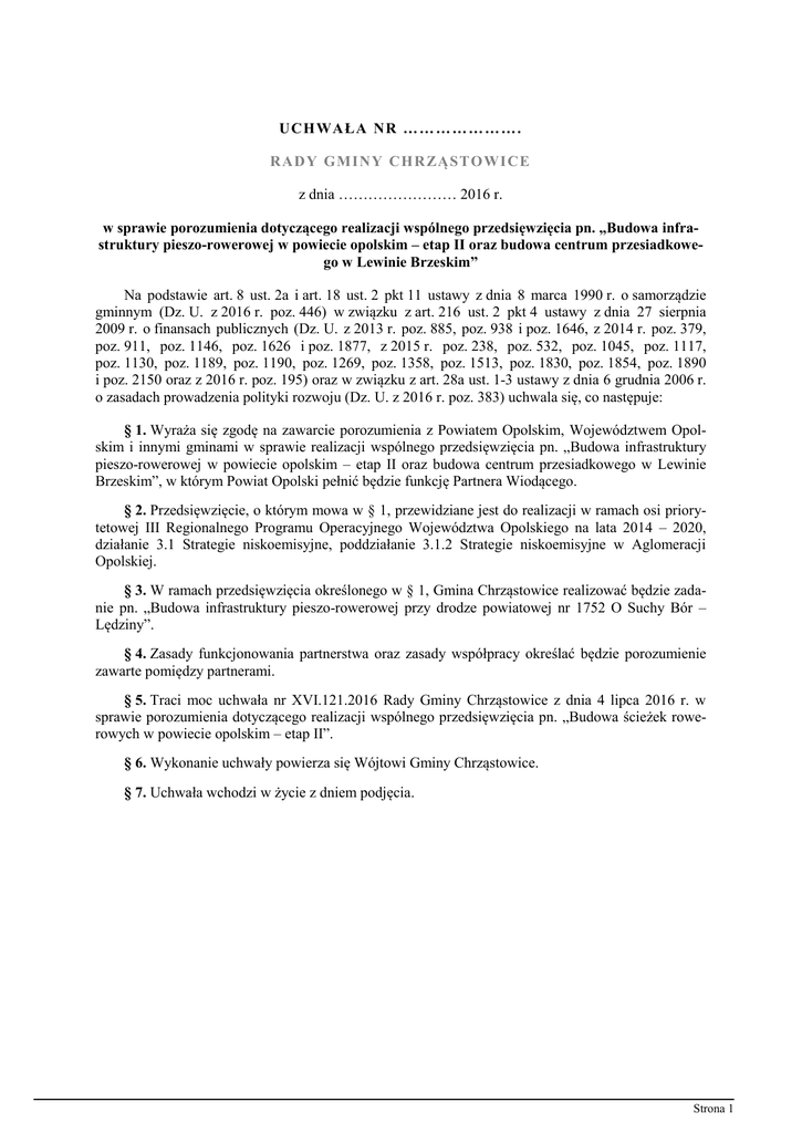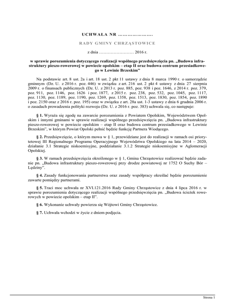 UCH WAŁA NR …… ……………. RADY GMINY CH R ZĄSTO WICE z dnia …………………… 2016 r. w sprawie porozumienia dotyczącego realizacji wspólnego przedsięwzięcia pn. „Budowa infrastruktury pieszo-rowerowej w powiecie opolskim – etap II oraz budowa centrum przesiadkowego w Lewinie Brzeskim” Na podstawie art. 8 ust. 2a i art. 18 ust. 2 pkt 11 ustawy z dnia 8 marca 1990 r. o samorządzie gminnym (Dz. U. z 2016 r. poz. 446) w związku z art. 216 ust. 2 pkt 4 ustawy z dnia 27 sierpnia 2009 r. o finansach publicznych (Dz. U. z 2013 r. poz. 885, poz. 938 i poz. 1646, z 2014 r. poz. 379, poz. 911, poz. 1146, poz. 1626 i poz. 1877, z 2015 r. poz. 238, poz. 532, poz. 1045, poz. 1117, poz. 1130, poz. 1189, poz. 1190, poz. 1269, poz. 1358, poz. 1513, poz. 1830, poz. 1854, poz. 1890 i poz. 2150 oraz z 2016 r. poz. 195) oraz w związku z art. 28a ust. 1-3 ustawy z dnia 6 grudnia 2006 r. o zasadach prowadzenia polityki rozwoju (Dz. U. z 2016 r. poz. 383) uchwala się, co następuje: § 1. Wyraża się zgodę na zawarcie porozumienia z Powiatem Opolskim, Województwem Opolskim i innymi gminami w sprawie realizacji wspólnego przedsięwzięcia pn. „Budowa infrastruktury pieszo-rowerowej w powiecie opolskim – etap II oraz budowa centrum przesiadkowego w Lewinie Brzeskim”, w którym Powiat Opolski pełnić będzie funkcję Partnera Wiodącego. § 2. Przedsięwzięcie, o którym mowa w § 1, przewidziane jest do realizacji w ramach osi priorytetowej III Regionalnego Programu Operacyjnego Województwa Opolskiego na lata 2014 – 2020, działanie 3.1 Strategie niskoemisyjne, poddziałanie 3.1.2 Strategie niskoemisyjne w Aglomeracji Opolskiej. § 3. W ramach przedsięwzięcia określonego w § 1, Gmina Chrząstowice realizować będzie zadanie pn. „Budowa infrastruktury pieszo-rowerowej przy drodze powiatowej nr 1752 O Suchy Bór – Lędziny”. § 4. Zasady funkcjonowania partnerstwa oraz zasady współpracy określać będzie porozumienie zawarte pomiędzy partnerami. § 5. Traci moc uchwała nr XVI.121.2016 Rady Gminy Chrząstowice z dnia 4 lipca 2016 r. w sprawie porozumienia dotyczącego realizacji wspólnego przedsięwzięcia pn. „Budowa ścieżek rowerowych w powiecie opolskim – etap II”. § 6. Wykonanie uchwały powierza się Wójtowi Gminy Chrząstowice. § 7. Uchwała wchodzi w życie z dniem podjęcia. Strona 1 UZASADNIENIE Z uwagi na zmianę nazwy wspólnego przedsięwzięcia dotyczącego budowy ścieżek rowerowych w powiecie opolskim, zaistniała konieczność uchylenia podjętej przez Radę Gminy Chrząstowice uchwały nr XVI.121.2016 z dnia 4 lipca 2016 r. w sprawie porozumienia dotyczącego realizacji wspólnego przedsięwzięcia pn. „Budowa ścieżek rowerowych w powiecie opolskim – etap II”. Nowa nazwa zadania otrzymała brzmienie „Budowa infrastruktury pieszo-rowerowej w powiecie opolskim – etap II oraz budowa centrum przesiadkowego w Lewinie Brzeskim”. Wspólne przedsięwzięcie realizowane będzie w ramach osi priorytetowej III Regionalnego Programu Operacyjnego Województwa Opolskiego na lata 2014 – 2020, działanie 3.1 Strategie niskoemisyjne, poddziałanie 3.1.2 Strategie niskoemisyjne w Aglomeracji Opolskiej. Celem porozumienia jest konsolidacja i wspólne wykorzystanie posiadanych przez Partnerów potencjałów i zasobów do realizacji Projektu, o których mowa w § 1 Uchwały. Partnerzy są podmiotami upoważnionymi do ponoszenia wydatków kwalifikowanych i niekwalifikowanych wskazanych we wniosku aplikacyjnym zgodnie z umową o dofinansowanie i wnoszą do Projektu zasoby ludzkie, organizacyjne, techniczne i finansowe. Partnerem wiodącym Projektu będzie Powiat Opolski. Gmina Chrząstowice w ramach realizacji przedsięwzięcia planuje zrealizować zadanie pn. „Budowa infrastruktury pieszo-rowerowej przy drodze powiatowej nr 1752 O Suchy Bór – Lędziny”. Podjęcie uchwały intencyjnej stanowi wymóg formalny możliwości aplikowania przedmiotowego Projektu do finansowania ze środków w ramach powyższego Programu. Strona 2