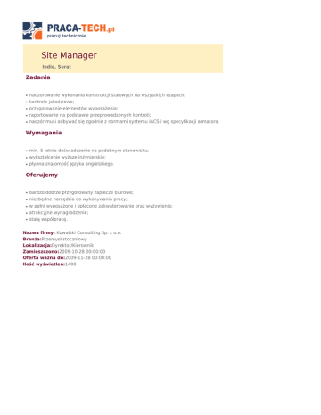 Site Manager Indie, Surat Zadania ● ● ● ● ● nadzorowanie wykonania konstrukcji stalowych na wszystkich etapach; kontrole jakościowe; przygotowanie elementów wyposażenia; raportowanie na podstawie przeprowadzonych kontroli; nadzór musi odbywać się zgodnie z normami systemu IACS i wg specyfikacji armatora. Wymagania ● ● ● min. 5 letnie doświadczenie na podobnym stanowisku; wykształcenie wyższe inżynierskie; płynna znajomość języka angielskiego. Oferujemy ● ● ● ● ● bardzo dobrze przygotowany zaplecze biurowe; niezbędne narzędzia do wykonywania pracy; w pełni wyposażone i opłacone zakwaterowanie oraz wyżywienie; atrakcyjne wynagrodzenie; stałą współpracę. Nazwa firmy: Kowalski Consulting Sp. z o.o. Branża:Przemysł stoczniowy Lokalizacja:Dyrektor/Kierownik Zamieszczono:2009-10-28 00:00:00 Oferta ważna do:2009-11-28 00:00:00 Ilość wyświetleń:1400