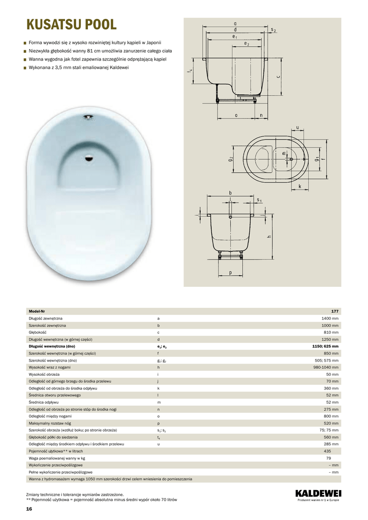 KUSATSU POOL Forma wywodzi się z wysoko rozwiniętej kultury kąpieli w Japonii Niezwykła głębokość wanny 81 cm umożliwia zanurzenie całego ciała Wanna wygodna jak fotel zapewnia szczególnie odprężającą kąpiel Wykonana z 3,5 mm stali emaliowanej Kaldewei Model-Nr Długość zewnętrzna 177 a 1400 mm 1000 mm Szerokość zewnętrzna b Głębokość c 810 mm Długość wewnętrzna (w górnej części) d 1250 mm Długość wewnętrzna (dno) e1; e2 Szerokość wewnętrzna (w górnej części) f Szerokość wewnętrzna (dno) g1; g2 1150; 625 mm 850 mm 505; 575 mm Wysokość wraz z nogami h Wysokość obrzeża i 980-1040 mm Odległość od górnego brzegu do środka przelewu j 70 mm Odległość od obrzeża do środka odpływu k 360 mm 50 mm Średnica otworu przelewowego l 52 mm Średnica odpływu m 52 mm 275 mm Odległość od obrzeża po stronie stóp do środka nogi n Odległość między nogami o 800 mm Maksymalny rozstaw nóg p 520 mm Szerokość obrzeża (wzdłuż boku; po stronie obrzeża) s1; s2 Głębokość półki do siedzenia t4 560 mm Odległość między środkiem odpływu i środkiem przelewu u 285 mm 75; 75 mm Pojemność użytkowa** w litrach 435 mm Waga poemaliowanej wanny w kg 79 mm Wykończenie przeciwpoślizgowe – mm Pełne wykończenie przeciwpoślizgowe – mm Wanna z hydromasażem wymaga 1050 mm szerokości drzwi celem wniesienia do pomieszczenia Zmiany techniczne i tolerancje wymiarów zastrzeżone. ** Pojemność użytkowa = pojemność absolutna minus średni wypór około 70 litrów 16