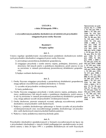 ©Kancelaria Sejmu s. 1/101 USTAWA z dnia 20 listopada 1998 r. o zryczałtowanym podatku dochodowym od niektórych przychodów osiąganych przez osoby fizyczne Rozdział 1 Przepisy ogólne Art. 1. Ustawa reguluje opodatkowanie zryczałtowanym podatkiem dochodowym niektórych przychodów (dochodów) osiąganych przez osoby fizyczne: 1) prowadzące pozarolniczą działalność gospodarczą, 2) osiągające przychody z tytułu umowy najmu, podnajmu, dzierżawy, poddzierżawy lub innych umów o podobnym charakterze, jeżeli umowy te nie są zawierane w ramach prowadzonej pozarolniczej działalności gospodarczej, 3) będące osobami duchownymi. Art. 2. 1. Osoby fizyczne osiągające przychody z pozarolniczej działalności gospodarczej mogą opłacać zryczałtowany podatek dochodowy w formie: 1) ryczałtu od przychodów ewidencjonowanych, 2) karty podatkowej. 1a. Osoby fizyczne osiągające przychody z tytułu umowy najmu, podnajmu, dzierżawy, poddzierżawy lub innych umów o podobnym charakterze, jeżeli umowy te nie są zawierane w ramach prowadzonej pozarolniczej działalności gospodarczej, mogą opłacać ryczałt od przychodów ewidencjonowanych. 2. Osoby duchowne, prawnie uznanych wyznań, opłacają zryczałtowany podatek dochodowy od przychodów osób duchownych. 3. Wpływy z podatku dochodowego opłacanego w formie ryczałtu od przychodów ewidencjonowanych oraz zryczałtowanego podatku dochodowego od przychodów osób duchownych stanowią dochód budżetu państwa. 4. Wpływy z karty podatkowej stanowią dochody gmin. Art. 3. Przychodów (dochodów) opodatkowanych w formach zryczałtowanych nie łączy się z przychodami (dochodami) z innych źródeł podlegającymi opodatkowaniu na podstawie ustawy z dnia 26 lipca 1991 r. o podatku dochodowym od osób fizycznych 2013-02-04 Opracowano na podstawie: Dz. U. z 1998 r. Nr 144, poz. 930, z 2000 r. Nr 104, poz. 1104, Nr 122, poz. 1324, z 2001 r. Nr 74, 784, Nr 88, poz. 961, Nr 125, poz. 1363 i 1369, Nr 134, poz. 1509, z 2002 r. Nr 141, poz. 1183, Nr 169, poz. 1384, Nr 172, poz. 1412, Nr 200, poz. 1679, z 2003 r. Nr 45, poz. 391, Nr 96, poz. 874, Nr 135, poz. 1268, Nr 137, poz. 1302, Nr 202, poz. 1958, z 2004 r. Nr 210, poz. 2135, Nr 263, poz. 2619, z 2005 r. Nr 143, poz. 1199, Nr 164, poz. 1366, Nr 169, poz. 1420, z 2006 r. Nr 183, poz. 1353, Nr 217, poz. 1588, z 2008 r. Nr 141, poz. 888, Nr 143, poz. 894, Nr 209, poz. 1316, z 2009 r. Nr 157, poz. 1241, Nr 201, poz. 1541, z 2010 r. Nr 3, poz. 13, Nr 28, poz. 146, Nr 75, poz. 473, Nr 219, poz. 1442, Nr 226, poz. 1478, z 2011 r. Nr 106, poz. 622, Nr 131, poz. 764, z 2012 r. poz. 1529, 1540. ©Kancelaria Sejmu s. 2/101 (Dz. U. z 2000 r. Nr 14, poz. 176, Nr 22, poz. 270, Nr 60, poz. 703, Nr 70, poz. 816, Nr 104, poz. 1104, Nr 117, poz. 1228 i Nr 122, poz. 1324 oraz z 2001 r. Nr 4, poz. 27, Nr 8, poz. 64, Nr 52, poz. 539, Nr 73, poz. 764, Nr 74, poz. 784, Nr 88, poz. 961, Nr 89, poz. 968, Nr 102, poz. 1117, Nr 106, poz. 1150, Nr 110, poz. 1190, Nr 125, poz. 1363 i 1370 i Nr 134, poz. 1509), zwanej dalej „ustawą o podatku dochodowym”. Art. 4. 1. Użyte w ustawie określenia oznaczają: 1) działalność usługowa – pozarolniczą działalność gospodarczą, której przedmiotem są czynności zaliczone do usług zgodnie z Polską Klasyfikacją Wyrobów i Usług wprowadzoną rozporządzeniem Rady Ministrów z dnia 29 października 2008 r. w sprawie Polskiej Klasyfikacji Wyrobów i Usług (PKWiU) (Dz. U. Nr 207, poz. 1293 i Nr 220, poz. 1435 oraz z 2009 r. Nr 33, poz. 256 i Nr 222, poz. 1753) wydanym na podstawie art. 40 ust. 2 ustawy z dnia 29 czerwca 1995 r. o statystyce publicznej (Dz. U. Nr 88, poz. 439, z późn. zm.1)), z zastrzeżeniem pkt 2 i 3, 2) działalność gastronomiczna – usługi związane z przygotowaniem posiłków oraz sprzedażą posiłków i towarów, 3) działalność usługowa w zakresie handlu – sprzedaż, w stanie nieprzetworzonym, nabytych uprzednio produktów (wyrobów) i towarów, w tym również takich, które zostały przez sprzedawcę zapakowane lub rozważone do mniejszych opakowań albo rozlane do butelek, puszek lub mniejszych pojemników, 4) działalność wytwórcza – działalność, w wyniku której powstają nowe wyroby, w tym również sprzedaż wyrobów własnej produkcji, prowadzoną przez podatnika, 5) towary – towary handlowe, surowce i materiały podstawowe, z tym że: a) towarami handlowymi są towary (wyroby) zakupione w celu dalszej odprzedaży, w stanie nieprzetworzonym, b) surowcami i materiałami podstawowymi są materiały, które w procesie produkcji lub przy świadczeniu usług stają się główną substancją gotowego wyrobu; do materiałów podstawowych zalicza się również materiały stanowiące część składową (montażową) wyrobu lub ściśle z wyrobem złączone, z tym że za surowce i materiały podstawowe nie uważa się paliw i olejów zużywanych w transporcie, 6) dowody zakupu – otrzymane faktury, rachunki, paragony, dowody wewnętrzne oraz opis otrzymanego towaru, 7) karty przychodów – indywidualne (imienne) karty przychodów pracowników, prowadzone przez podatników dokonujących pracownikom wypłat należności ze stosunku pracy, o których mowa w art. 12 ustawy o podatku dochodowym, 8) podatek dochodowy na ogólnych zasadach – podatek dochodowy od osób fizycznych, opłacany przy zastosowaniu podstawy obliczania podatku, o 1) Zmiany wymienionej ustawy zostały ogłoszone w Dz. U. z 1996 r. Nr 156, poz. 775, z 1997 r. Nr 88, poz. 554 i Nr 121, poz. 769, z 1998 r. Nr 99, poz. 632 i Nr 106, poz. 668, z 2001 r. Nr 100, poz. 1080, z 2003 r. Nr 217, poz. 2125, z 2004 r. Nr 273, poz. 2703, z 2005 r. Nr 163, poz. 1362, z 2006 r. Nr 170, poz. 1217, z 2007 r. Nr 166, poz. 1172, z 2008 r. Nr 227, poz. 1505, z 2009 r. Nr 18, poz. 97 oraz z 2010 r. Nr 47, poz. 278 i Nr 76, poz. 489. 2013-02-04 ©Kancelaria Sejmu s. 3/101 której mowa w art. 26 ustawy o podatku dochodowym, i skali, o której mowa w art. 27 usta