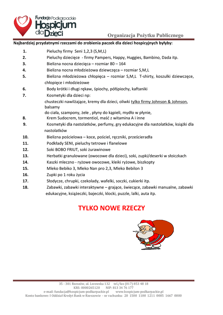 Organizacja Pożytku Publicznego Najbardziej przydatnymi rzeczami do zrobienia paczek dla dzieci hospicyjnych byłyby: 1. 2. 3. 4. 5. 6. 7. 8. 9. 10. 11. 12. 13. 14. 15. 16. 17. 18. Pieluchy firmy Seni 1,2,3 (S,M,L) Pieluchy dziecięce - firmy Pampers, Happy, Huggies, Bambino, Dada itp. Bielizna nocna dziecięca – rozmiar 80 – 164 Bielizna nocna młodzieżowa dziewczęca – rozmiar S,M,L Bielizna młodzieżowa chłopięca – rozmiar S,M,L T-shirty, koszulki dziewczęce, chłopięce i młodzieżowe Body krótki i długi rękaw, śpiochy, półśpiochy, kaftaniki Kosmetyki dla dzieci np: chusteczki nawilżające, kremy dla dzieci, oliwki tylko firmy Johnson & Johnson, balsamy do ciała, szampony, żele , płyny do kąpieli, mydło w płynie, Krem Sudocrem, tormentiol, maść z witamina A i inne Kosmetyki dla nastolatków, perfumy, gry edukacyjne dla nastolatków, książki dla nastolatków Bielizna pościelowa – koce, pościel, ręczniki, prześcieradła Podkłady SENI, pieluchy tetrowe i flanelowe Soki BOBO FRIUT, soki żurawinowe Herbatki granulowane (owocowe dla dzieci), soki, zupki/deserki w słoiczkach Kaszki mleczno - ryżowe owocowe, kleiki ryżowe, biszkopty Mleko Bebiko 3, Mleko Nan pro 2,3, Mleko Bebilon 3 Zupki po 1 roku życia Słodycze, chrupki, czekolady, wafelki, soczki, cukierki itp. Zabawki, zabawki interaktywne – grające, świecące, zabawki manualne, zabawki edukacyjne, książeczki, bajeczki, klocki, puzzle, lalki, auta itp. TYLKO NOWE RZECZY 35 - 301 Rzeszów, ul. Lwowska 132 tel./fax (017) 853 48 18 KRS: 0000265120 NIP: 813 34 76 177 e-mail: [email protected] www.hospicjum-podkarpackie.pl Konto bankowe: I Oddział Kredyt Bank w Rzeszowie - nr rachunku: 20 1500 1100 1211 0005 1667 0000