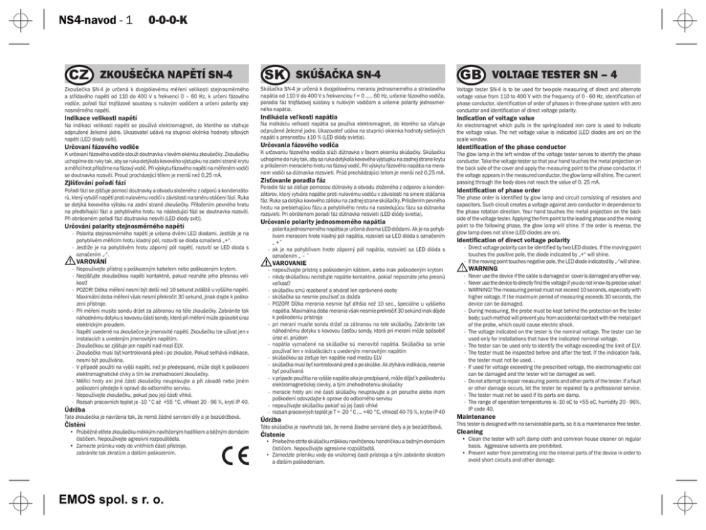 NS4-navod - 1 0-0-0-K CZ ZKOUŠEČKA NAPĚTÍ SN-4 Zkoušečka SN-4 je určená k dvojpólovému měření velikosti stejnosměrného a střídavého napětí od 110 do 400 V s frekvencí 0 – 60 Hz, k určení fázového vodiče, pořadí fází trojfázové soustavy s nulovým vodičem a určení polarity stejnosměrného napětí. Indikace velikosti napětí Na indikaci velikosti napětí se používá elektromagnet, do kterého se vtahuje odpružené železné jádro. Ukazovatel udává na stupnici okénka hodnoty síťových napětí (LED diody svítí). Určovaní fázového vodiče K určovaní fázového vodiče slouží doutnavka v levém okénku zkoušečky. Zkoušečku uchopíme do ruky tak, aby se ruka dotýkala kovového výstupku na zadní straně krytu a měřicí hrot přiložíme na fázový vodič. Při výskytu fázového napětí na měřeném vodiči se doutnavka rozsvítí. Proud procházející tělem je menší než 0,25 mA. Zjišťování pořadí fází Pořadí fází se zjišťuje pomocí doutnavky a obvodu složeného z odporů a kondenzátorů, který vytváří napětí proti nulovému vodiči v závislosti na směru otáčení fází. Ruka se dotýká kovového výlisku na zadní straně zkoušečky. Přiložením pevného hrotu na předbíhající fázi a pohyblivého hrotu na následující fázi se doutnavka rozsvítí. Při obráceném pořadí fází doutnavka nesvítí (LED diody svítí). Určování polarity stejnosměrného napětí - Polarita stejnosměrného napětí je určena dvěmi LED diodami. Jestliže je na pohyblivém měřícím hrotu kladný pól, rozsvítí se dioda označená „+“. - Jestliže je na pohyblivém hrotu záporný pól napětí, rozsvítí se LED dioda s označením „-“. VAROVÁNÍ - Nepoužívejte přístroj s poškozeným kabelem nebo poškozeným krytem. - Nezjišťujte zkoušečkou napětí kontaktně, pokud neznáte jeho přesnou velikost! - POZOR! Délka měření nesmí být delší než 10 sekund zvláště u vyššího napětí. Maximální doba měření však nesmí překročit 30 sekund, jinak dojde k poškození přístroje. - Při měření musíte sondu držet za zábranou na těle zkoušečky. Zabráníte tak náhodnému dotyku s kovovou částí sondy, která při měření může způsobit úraz elektrickým proudem. - Napětí uvedené na zkoušečce je jmenovité napětí. Zkoušečku lze užívat jen v instalacích s uvedeným jmenovitým napětím. - Zkoušečkou se zjišťuje jen napětí nad mezí ELV. - Zkoušečka musí být kontrolovaná před i po zkoušce. Pokud selhává indikace, nesmí být používána. - V případě použití na vyšší napětí, než je předepsané, může dojít k poškození elektromagnetické cívky a tím ke znehodnocení zkoušečky. - Měřící hroty ani jiné části zkoušečky neupravujte a při závadě nebo jiném poškození předejte k opravě do odborného servisu. - Nepoužívejte zkoušečku, pokud jsou její části vlhké. - Rozsah pracovních teplot je -10 °C až +55 °C, vlhkost 20 - 96 %, krytí IP 40. Údržba Tato zkoušečka je navržena tak, že nemá žádné servisní díly a je bezúdržbová. Čistění • Průběžně otřete zkoušečku měkkým navlhčeným hadříkem a běžným domácím čističem. Nepoužívejte agresivní rozpouštědla. • Zamezte průniku vody do vnitřních částí přístroje, zabráníte tak zkratům a dalším poškozením. EMOS spol. s r. o. SK SKÚŠAČKA SN-4 Skúšačka SN-4 je určená k dvojpólovému meraniu jednosmerného a striedavého napätia od 110 V do 400 V s frekvenciou f = 0 ..... 60 Hz, určenie fázového vodiča, poradia fáz trojfázovej sústavy s nulovým vodičom a určenie polarity jednosmerného napätia. Indikácia veľkosti napätia Na indikáciu veľkosti napätia sa používa elektromagnet, do ktorého sa vťahuje odpružené železné jadro. Ukazovateľ udáva na stupnici okienka hodnoty sieťových napätí s presnosťou ±10 % (LED diódy svietia). Určovania fázového vodiča K určovaniu fázového vodiča slúži dútnavka v ľavom okienku skúšačky. Skúšačku uchopíme do ruky tak, aby sa ruka dotýkala kovového výstupku na zadnej strane krytu a priložením meracieho hrotu na fázový vodič. Pri výskytu fázového napätia na meranom vodiči sa dútnavka rozsvieti. Prúd prechádzajúci telom je menší než 0,25 mA. Zisťovanie poradia fáz Poradie fáz sa zisťuje pomocou dútnavky a obvodu zloženého z odporov a kondenzátorov, ktorý vytvára napätie proti nulovému vodiču v závislosti na smere otáčania fáz. Ruka sa dotýka kovového zálisku na zadnej strane skúšačky. Priložením pevného hrotu na prebiehajúcu fázu a pohyblivého hrotu na nasledujúcu fázu sa dútnavka rozsvieti. Pri obrátenom poradí fáz dútnavka nesvieti (LED diódy svietia). Určovanie polarity jednosmerného napätia - polarita jednosmerného napätia je určená dvoma LED diódami. Ak je na pohyblivom meracom hrote kladný pól napätia, rozsvieti sa LED dióda s označením „ +˝ - ak je na pohyblivom hrote záporný pól napätia, rozsvieti sa LED dióda s označením „ – ˝ VAROVANIE - nepoužívajte prístroj s poškodeným káblom, alebo inak poškodeným krytom - nikdy skúšačkou nezisťujte napätie kontaktne, pokiaľ nepoznáte jeho presnú veľkosť! - skúšačku smú rozoberať a otvárať len oprávnené osoby - skúšačka sa nesmie používať za dažďa - POZOR! Dĺžka merania nesmie byť dlhšia než 10 sec., špeciálne u vyššieho napätia. Maximálna doba merania však nesmie prekročiť 30 sekúnd inak dôjde k poškodeniu prístroja - pri meraní musíte sondu držať za zábranou na tele skúšačky. Zabránite tak náhodnému dotyku s kovovou časťou sondy, ktorá pri meraní môže spôsobiť úraz el. prúdom - napätia vyznačené na skúšačke sú menovité napätia. Skúšačka sa smie používať len v inštaláciách
